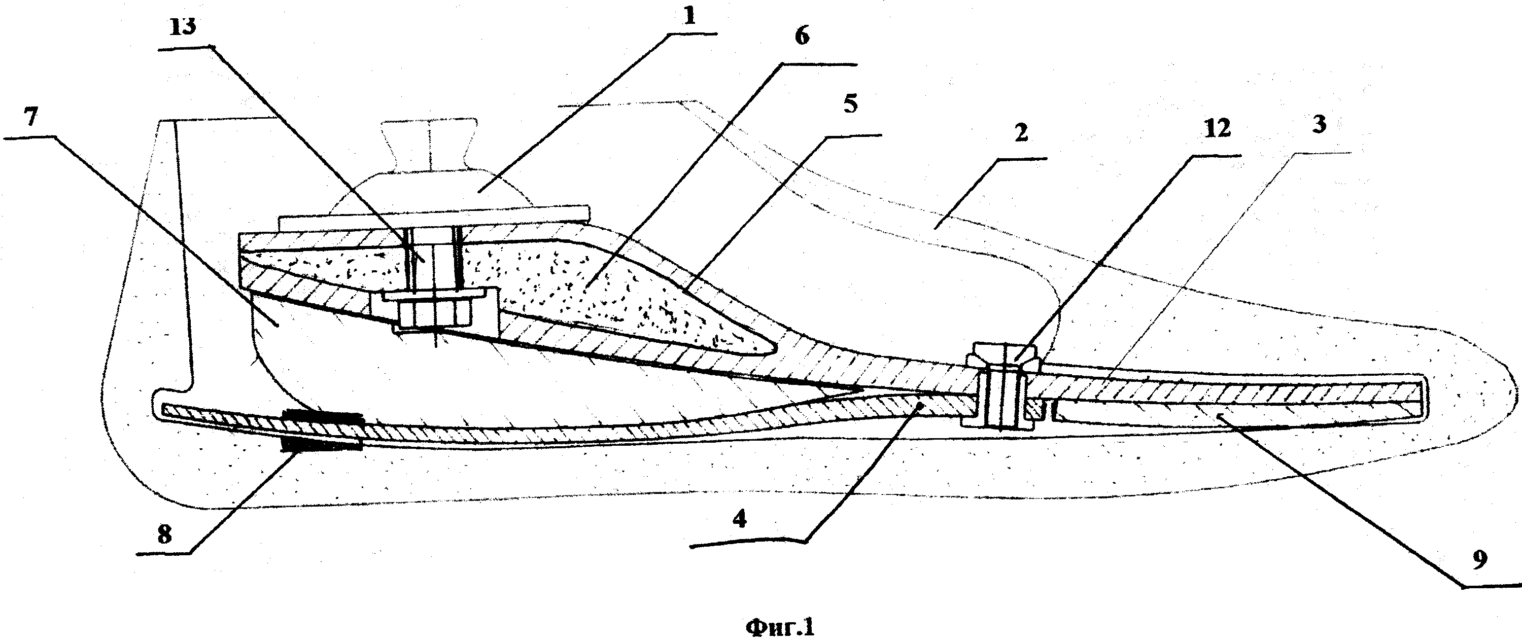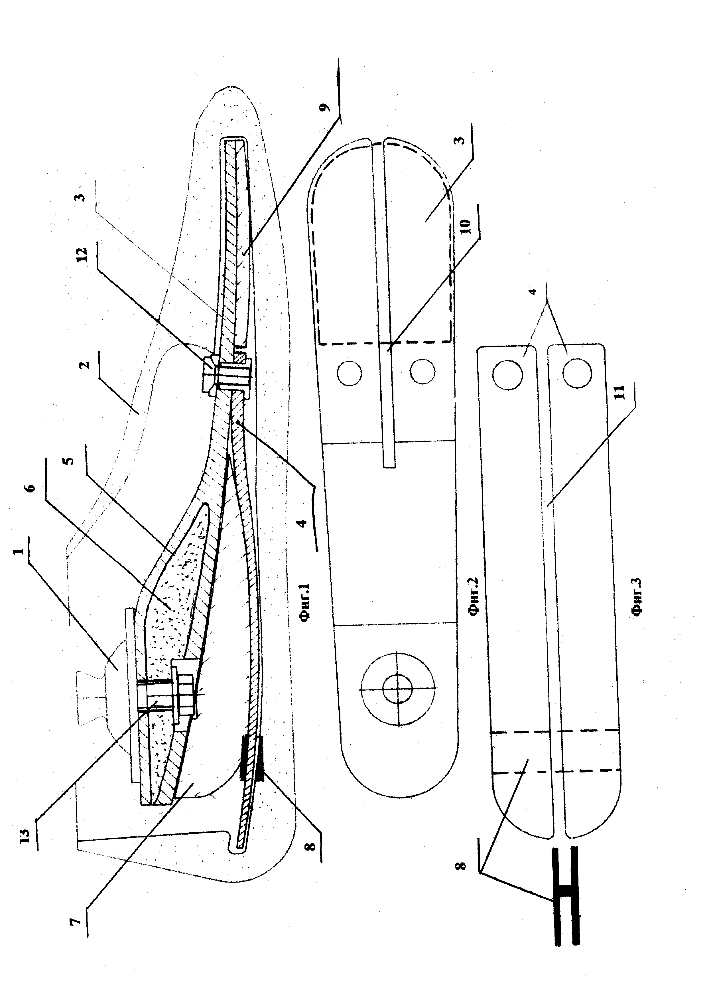 Изобретение относится к медицинской технике и может быть использовано для протезирования нижних конечностей. Известна искусственная стопа, содержащая внешнюю оболочку, вкладыш из амортизирующей пластины с утолщением, на котором размещен узел крепления к голени в виде адаптера (RU 2327435 С1, 27.06.2006). Недостатком известной стопы является выполнение вкладыша в виде одной амортизирующей пластины с утолщением, на котором размещен узел крепления к голени. Одна амортизирующая пластина затрудняет использование протеза инвалидам, ведущим активный образ жизни, и инвалидам, имеющим вес более 80 кг (2-4 степень активности по системе «MOBIS»). Более близкой к предлагаемому изобретению можно считать искусственную стопу, содержащую внешнюю оболочку, вкладыш из амортизирующих профилированных пластин, соединенных внутри оболочки носочными частями, и узел крепления к голени, соединенный с верхней пластиной (RU 2085155 С1, 27.07.1997). Выполнение вкладыша из амортизирующих профилированных пластин, соединенных внутри оболочки носочными частями, расширяет функциональные возможности протеза, но не обеспечивает ему физико-механических характеристик, необходимых для длительного пользования или, например, для занятий спортом. Настоящее изобретение направлено на решение задачи по созданию искусственной стопы, не имеющей недостатков известных конструкций и в наибольшей степени подходящей для инвалидов, имеющих одностороннюю или двухстороннюю ампутацию бедра или голени всех уровней. Техническим результатом изобретения является получение улучшенных биомеханических характеристик искусственной стопы, в которой каждый элемент конструкции связан с отдельной фазой движения. Сущность изобретения выражается в совокупности существенных признаков, в которой искусственная стопа, содержащая узел крепления к голени и внешнюю оболочку с вкладышем из амортизирующих профилированных пластин, отличается от ближайшего аналога тем, что верхняя пластина содержит, как минимум, один промежуточный слой композитного материала и, как минимум, два силовых композитных облицовочных слоя, причем пяточная часть верхней пластины выполнена с дополнительной изогнутой пластиной, на которой размещен узел крепления к голени, при этом между верхней пластиной и дополнительной изогнутой пластиной расположен наполнитель на основе стеклянных микросфер, между верхней пластиной и дугообразной частью нижней пластины установлен амортизатор, под пяточным концом нижней пластины размещен Н-образный рассекатель, а под носочной части верхней пластины размещен эластичный компенсатор. В частных случаях своего выполнения или использования искусственная стопа может содержать оболочку из пенополиуретана; облицовочные слои из пластика; как минимум, один промежуточный слой из материла на основе стеклянных микросфер; верхнюю пластину, выполненную с продольным разрезом со стороны носка, имеющим длину разреза, составляющую не менее 1/3 от длины верхней пластины; съемный амортизатор; амортизатор, соединенный с нижней поверхностью верхней пластины посредством клея; нижнюю пластину, выполненную с продольным разрезом; верхнюю и нижнюю амортизирующие профилированные пластины, соединенные между собой, как минимум, двумя винтами, размещенными на расстоянии не менее 1/3 от носка верхней пласт