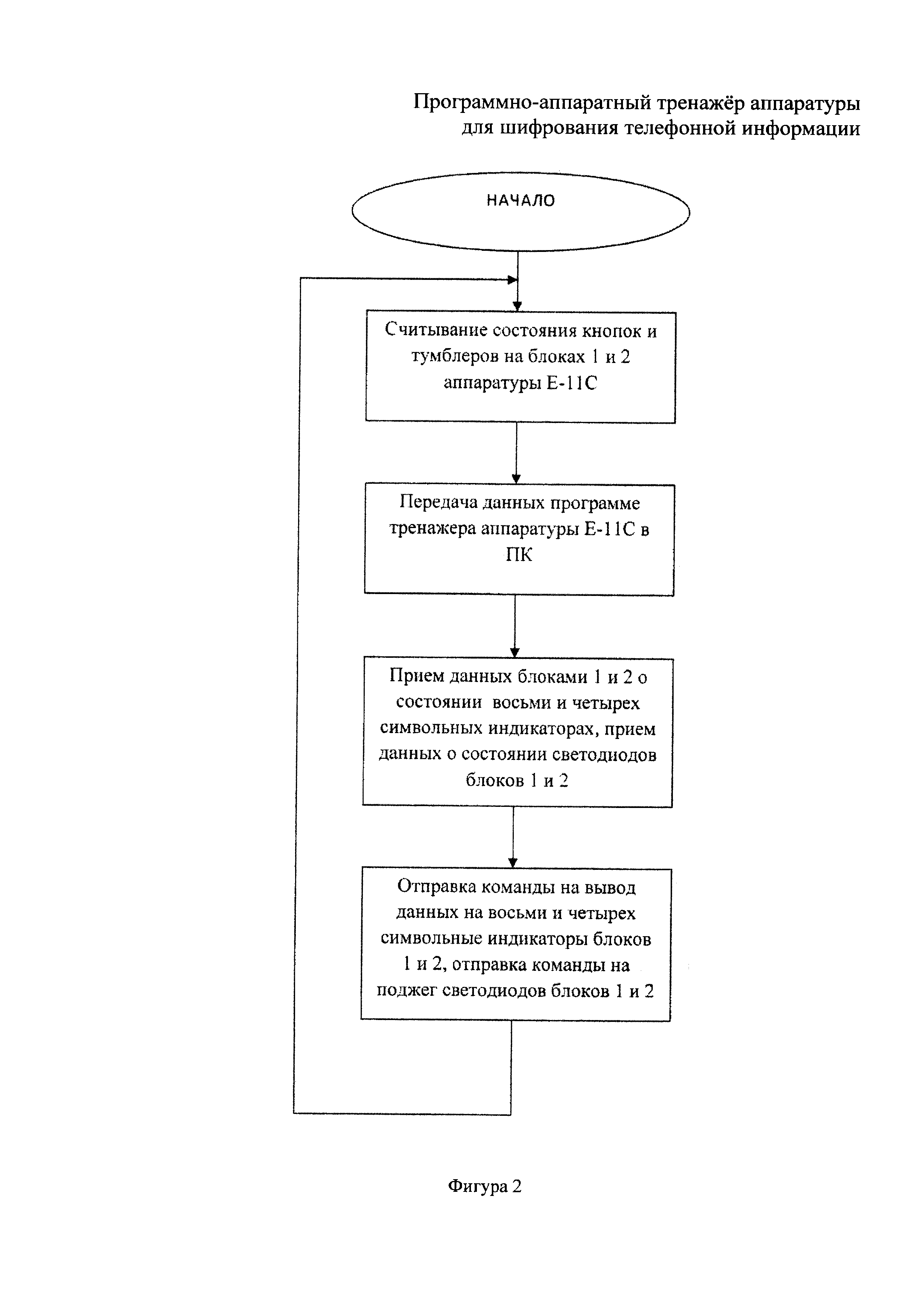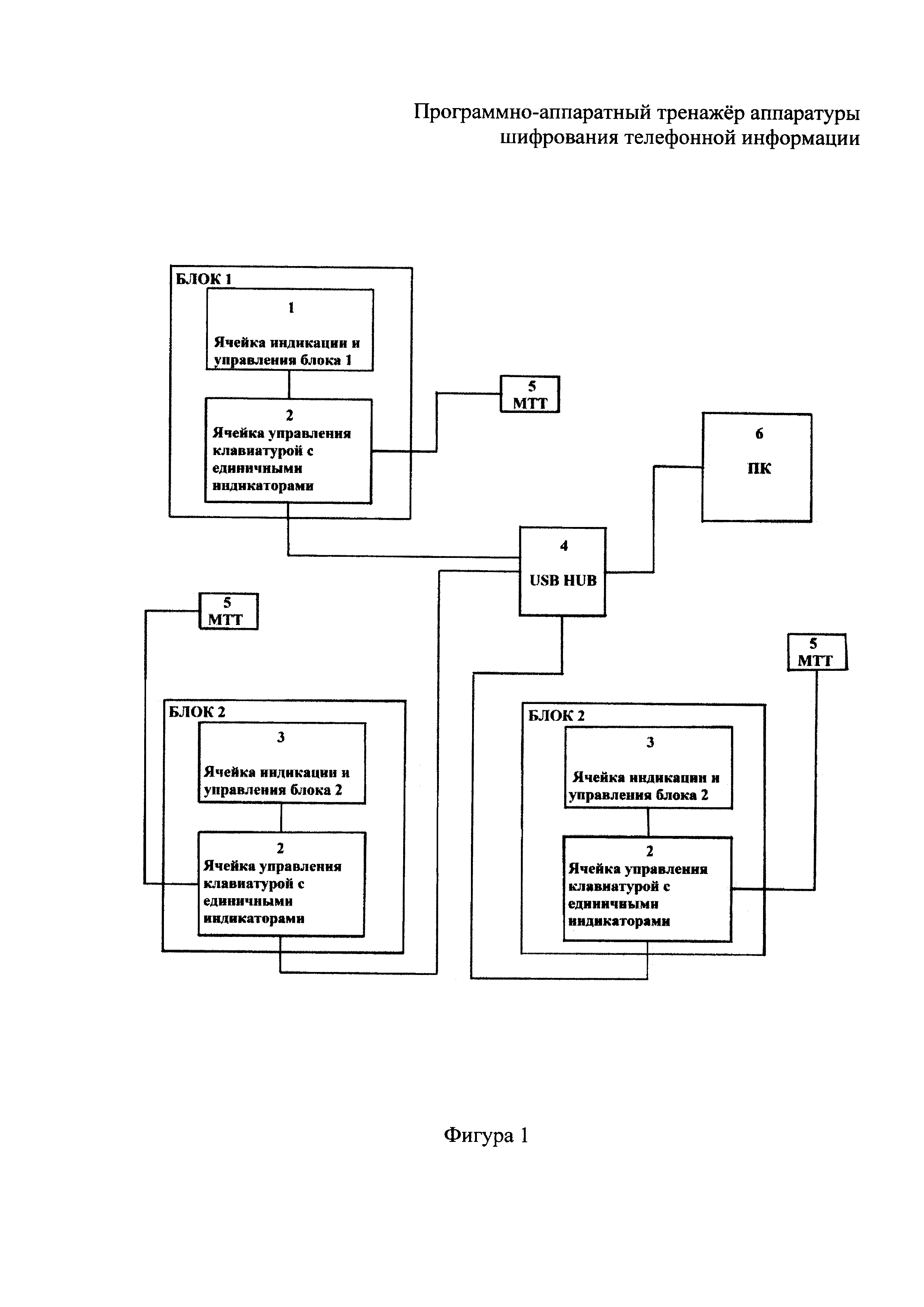 Программно-аппаратный тренажер аппаратуры для шифрования телефонной информации предназначен для обучения принципам работы с аппаратурой для шифрования телефонной информации (аппаратура Е11С) и обеспечения совместной работы с комплексом учебно-тренировочных средств в части речевого обмена. Тренажер выполнен в виде стойки, которая содержит блок шифрования телефонной информации по цифровым каналам связи, два устройства коммутации на канал, образованный блоком шифрования, соединенные с персональным компьютером по интерфейсу USB через USB-Hub, и микротелефонные трубки. Технический результат заключается во внешнем и функциональном соответствии заявленного тренажера аппаратуре для шифрования телефонной информации. 4 з.п. ф-лы, 2 ил.