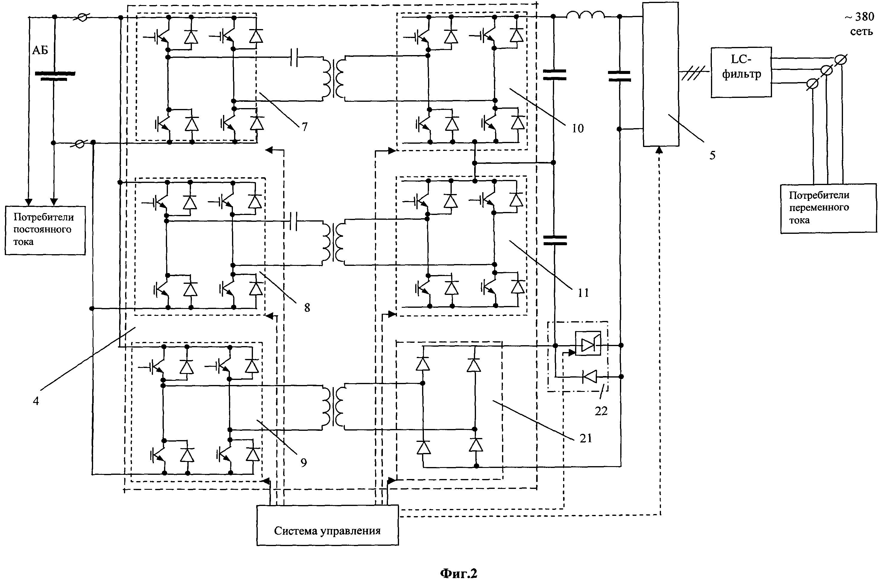 1. Статический обратимый преобразователь для питания потребителей переменного и постоянного тока, содержащий первый порт «входа выхода» на стороне постоянного тока с подключенной к нему аккумуляторной батареей и второй порт «входа-выхода» на стороне переменного тока, для электрической связи портов между ними включены звено высокой частоты и звено автономного инвертора промышленной частоты, последовательно соединенные между собой, причем оба звена используются в инверторном и выпрямительном режимах, при этом в инверторном режиме работы обратимого преобразователя входное питание постоянного тока подается на первый порт, а выход переменного тока снимается со второго порта, а в выпрямительном режиме обратимого преобразователя входное питание переменного тока подается на второй порт, а выход постоянного тока снимается с первого порта, причем звено высокой частоты выполнено на основе однофазных мостовых схем инверторов, соединенных с системой управления, а выходное напряжение переменного тока формируется с помощью трехфазных мостовых схем с выходными LC-фильтрами, 2. Статический обратимый преобразователь по п.1, 3. Статический обратимый преобразователь по п.1, 4. Статический обратимый преобразователь по п.1,