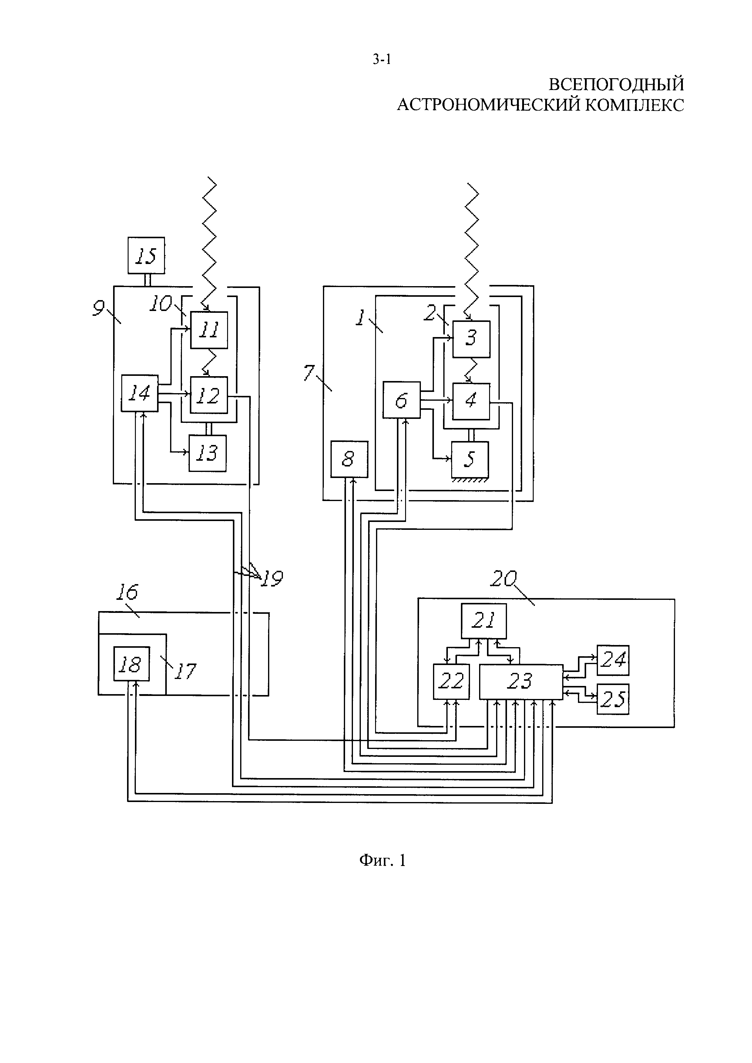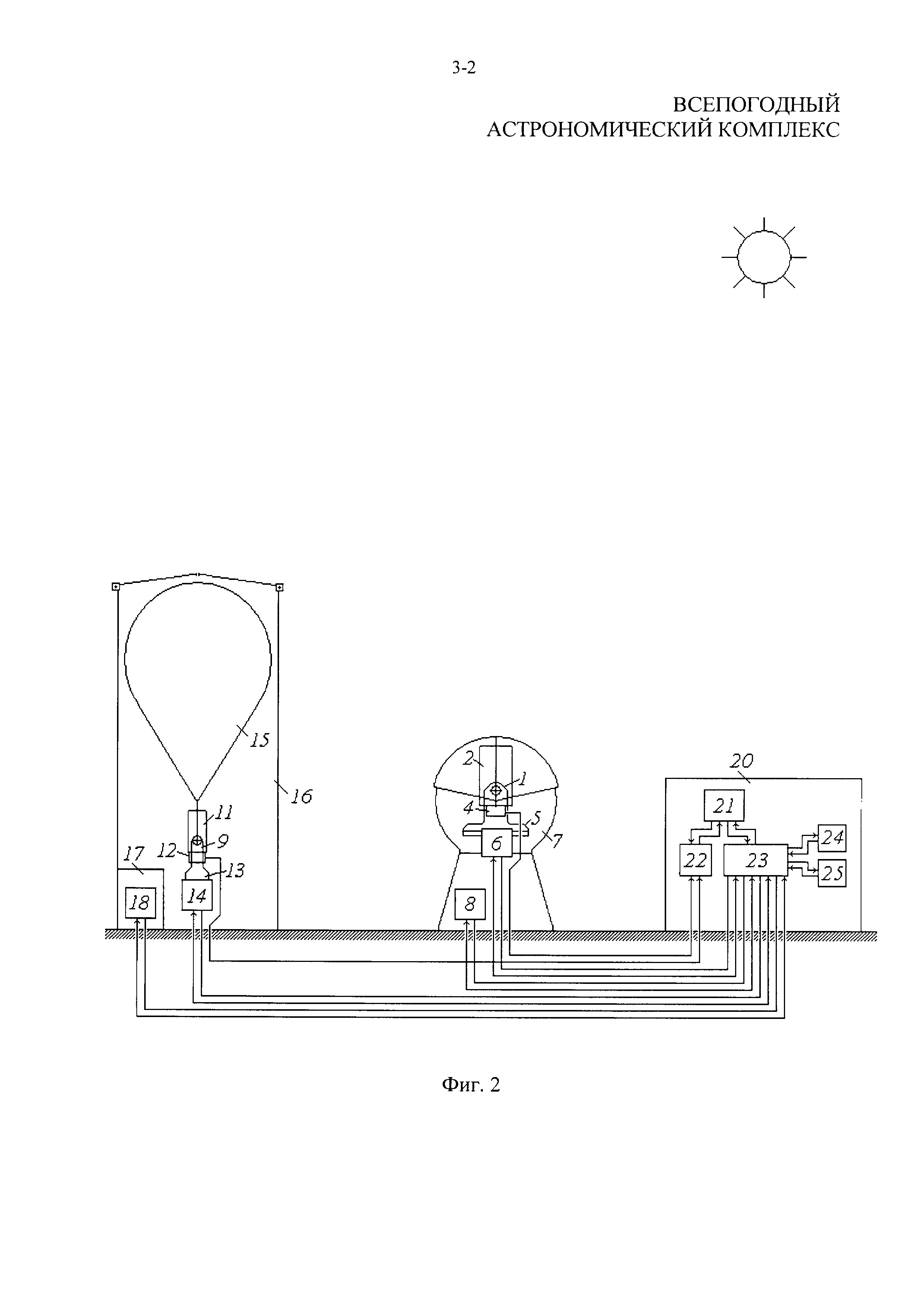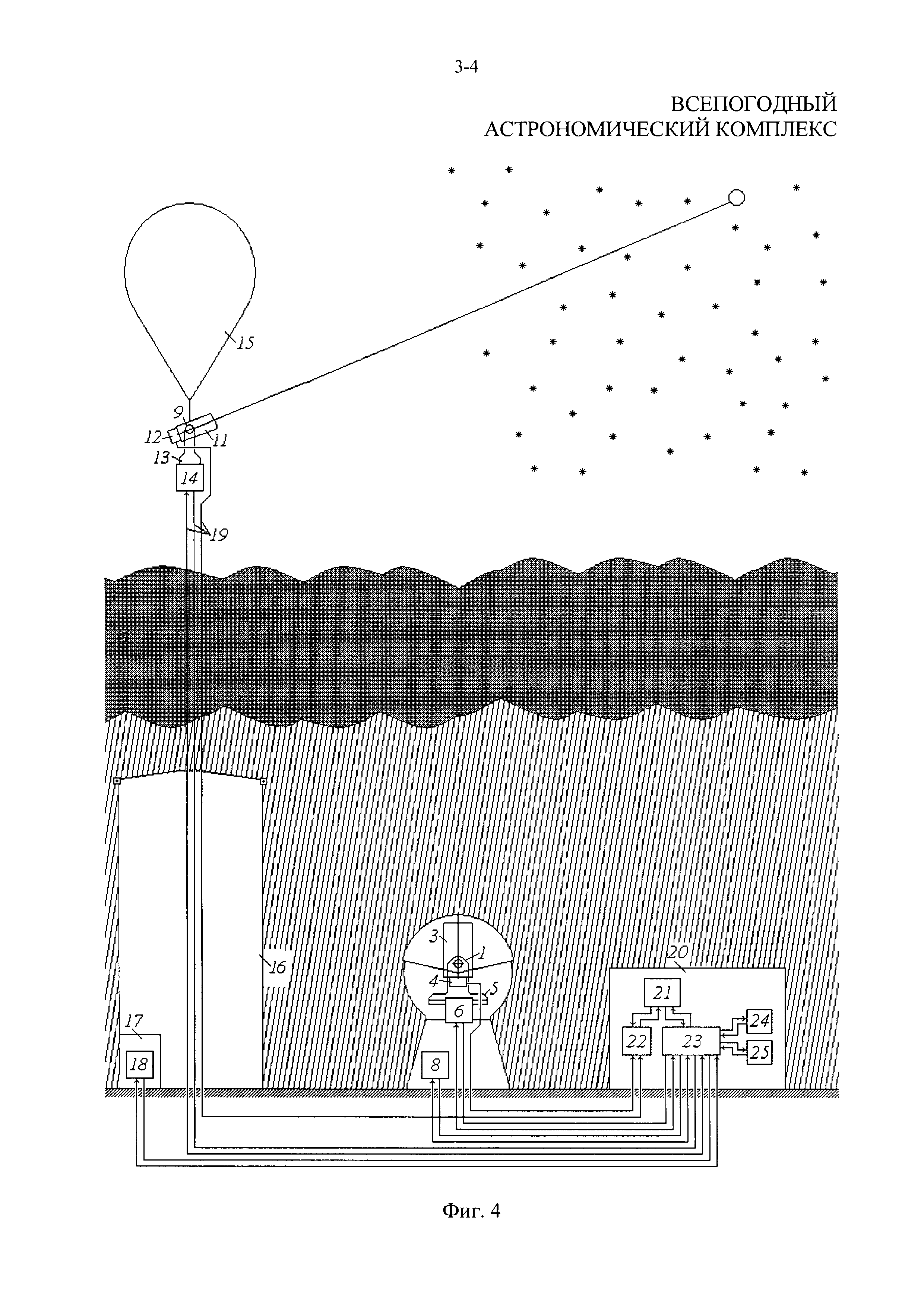 Всепогодный астрономический комплекс, состоящий по крайней мере из одного наземного телескопа с блоком управления наземным телескопом, по крайней мере одного защитного укрытия наземного телескопа с блоком управления защитным укрытием наземного телескопа и по крайней мере одного наземного пункта управления всепогодным астрономическим комплексом, причем наземный телескоп выполнен с входным устройством, расположенным на опорно-поворотном механизме и состоящим из последовательно установленных оптического блока и светоприемного устройства, а наземный пункт управления всепогодным астрономическим комплексом выполнен из установленных внутри наземного пункта управления всепогодным астрономическим комплексом комплексного пульта управления с рабочими местами, комплексного блока обработки информации, комплексной аппаратуры управления, аппаратуры линии связи и аппаратуры метеостанции, при этом блок управления наземным телескопом установлен в наземном телескопе так, что первый выход блока управления наземным телескопом связан со входом оптического блока, второй выход блока управления наземным телескопом связан со входом светоприемного устройства, третий выход блока управления наземным телескопом связан со входом опорно-поворотного механизма, а в наземном пункте управления всепогодным астрономическим комплексом комплексный пульт управления с рабочими местами взаимосвязан с комплексным блоком обработки информации и с комплексной аппаратурой управления, установленными таким образом, что первый выход комплексного пульта управления связан с первым входом комплексного блока обработки информации, выход комплексного блока обработки информации связан с первым входом комплексного пульта управления, первый вход комплексной аппаратуры управления связан со вторым выходом комплексного пульта управления, второй вход комплексного пульта управления связан с первым выходом комплексной аппаратуры управления, а аппаратура линии связи и аппаратура метеостанции взаимосвязаны с комплексной аппаратурой управления и установлены так, что вход и выход аппаратуры линии связи связаны соответственно со вторым выходом и вторым входом комплексной аппаратуры управления, а вход и выход аппаратуры метеостанции связаны соответственно с третьим выходом и третьим входом комплексной аппаратуры управления, при этом наземный пункт управления всепогодным астрономическим комплексом установлен относительно наземного телескопа таким образом, что второй вход комплексного блока обработки информации связан с выходом светоприемного устройства наземного телескопа, вход блока управления наземным телескопом связан с четвертым выходом комплексной аппаратуры управления, четвертый вход комплексной аппаратуры управления связан с четвертым выходом блока управления наземным телескопом, пятый выход комплексной аппаратуры управления связан со входом блока управления защитным укрытием наземного телескопа, а пятый вход комплексной аппаратуры управления связан с выходом блока управления защитным укрытием наземного телескопа, отличающийся тем, что дополнительно введен по крайней мере один аэростатный телескоп с блоком управления аэростатным телескопом, по крайней мере одно защитное укрытие аэростатного телескопа, по крайней 