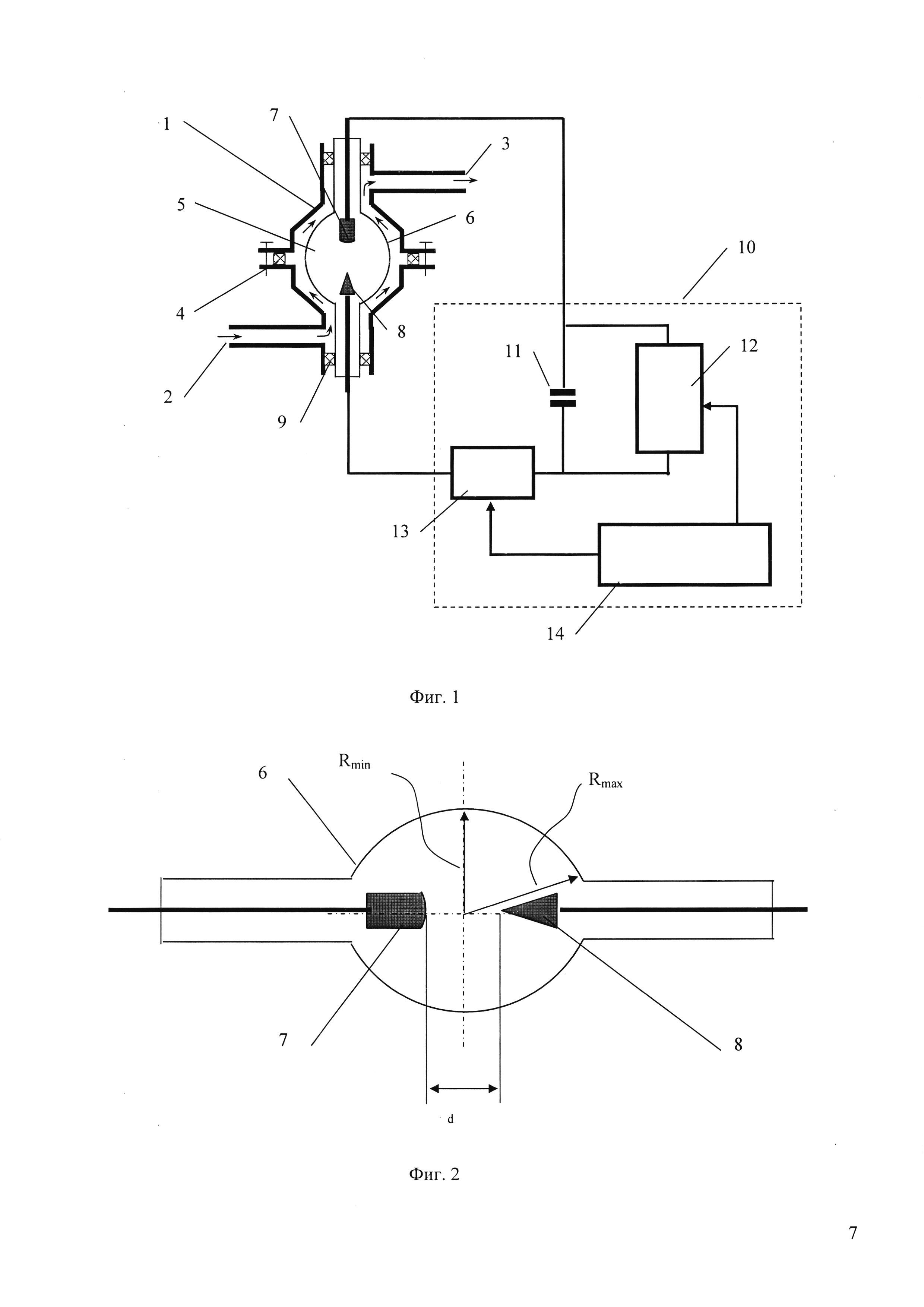 Устройство для окислительной деструкции металлоорганических комплексов жидких радиоактивных отходов, содержащее фотохимический реактор с импульсной ксеноновой лампой и блок питания с накопительным конденсатором, высоковольтным выпрямителем, блоком инициирования и блоком управления, при этом импульсная ксеноновая лампа подключена к блоку питания так, что импульсная ксеноновая лампа и накопительный конденсатор образуют разрядный контур, отличающееся тем, что колба импульсной ксеноновой лампы выполнена в виде шара или иного тела вращения, при этом в импульсной ксеноновой лампе наименьший внутренний радиус колбы превышает расстояние между электродами не менее чем в 5 раз, а параметры импульсной ксеноновой лампы и разрядного контура связаны соотношением