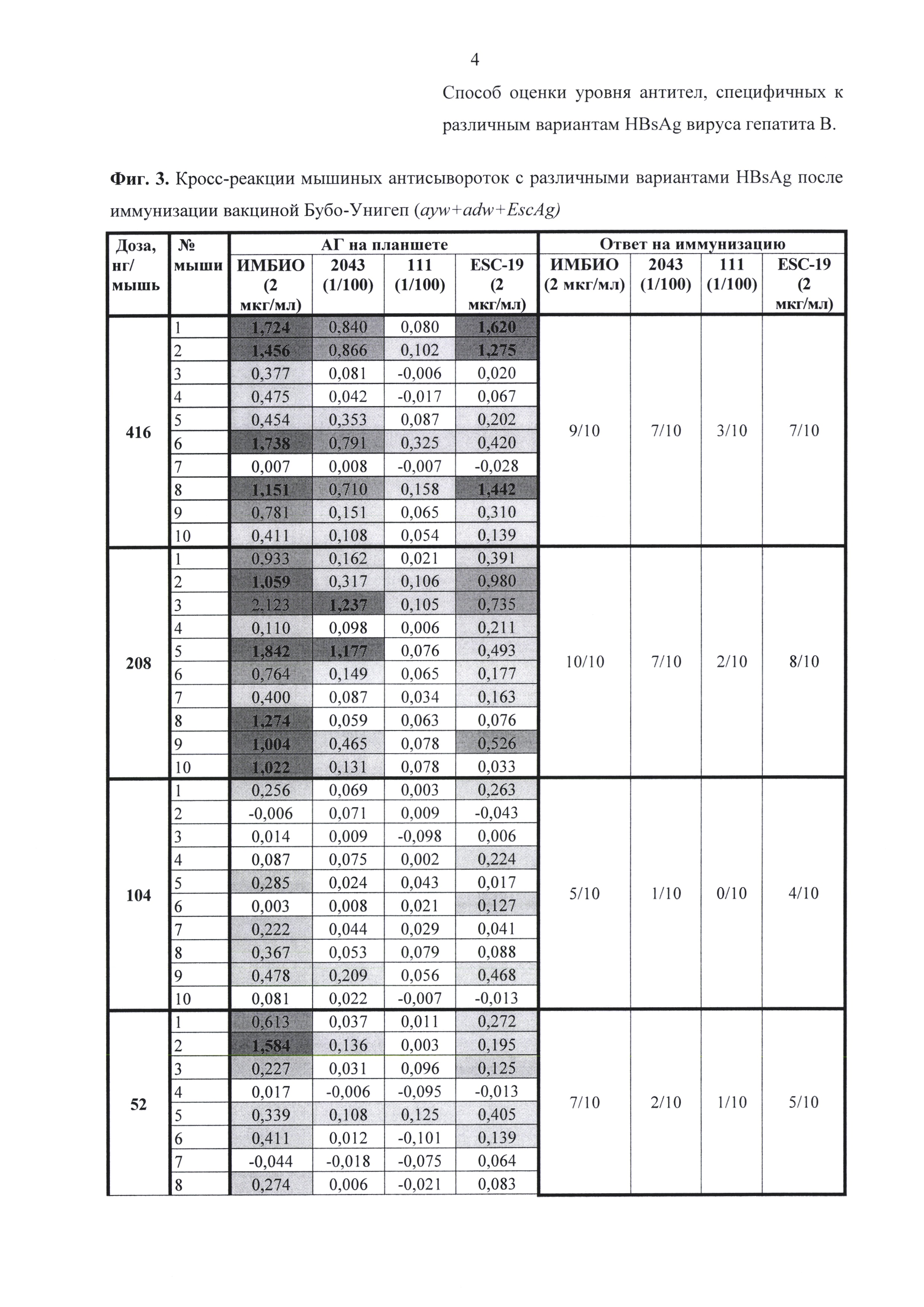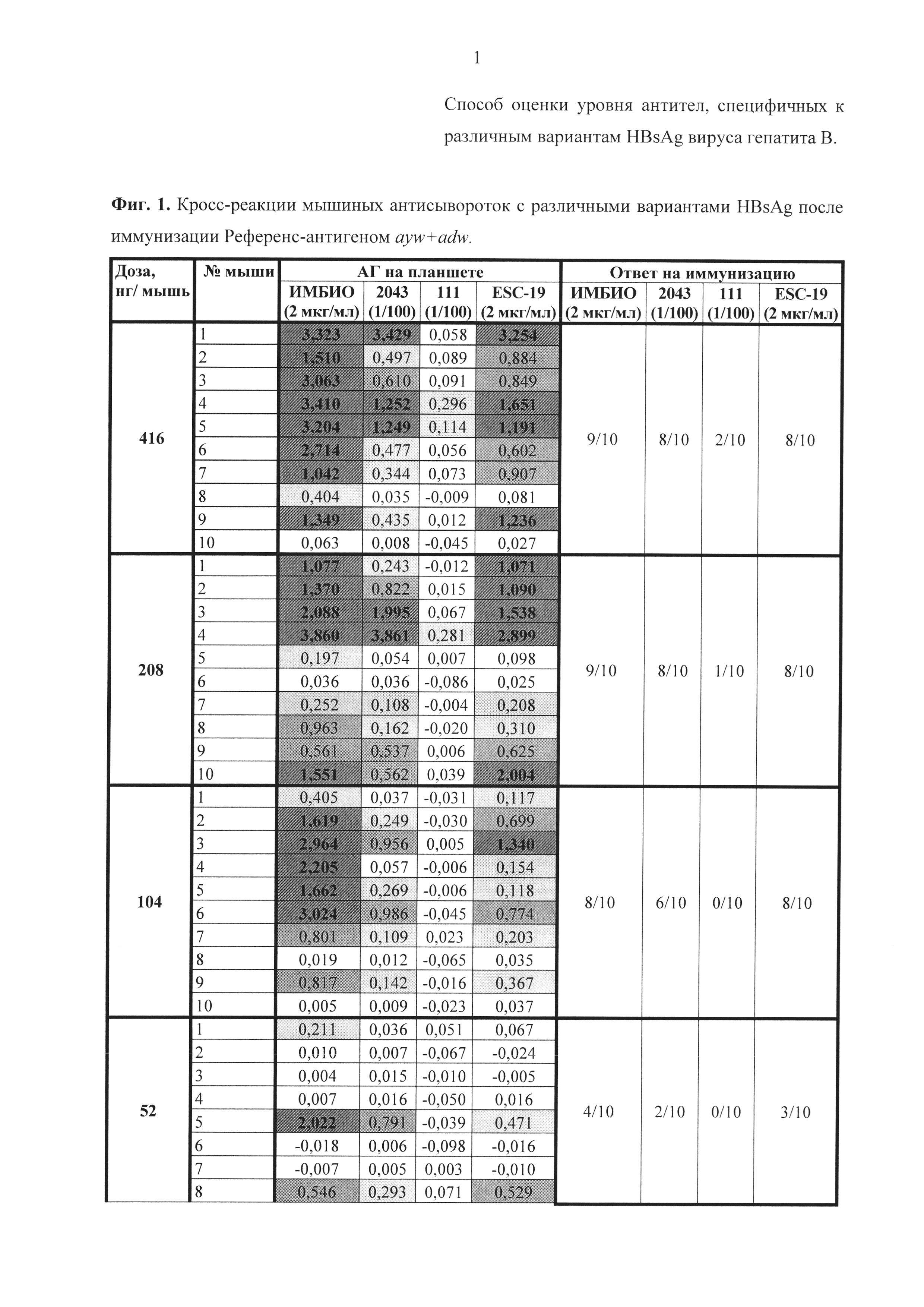 Изобретение относится к биотехнологии, в частности к иммунобиотехнологии, и может быть использовано для оценки потенциала, эффективности и специфической активности вакцин против вируса гепатита В (ВГВ), для изучения антигенных свойств HBsAg с разными субтипами и несущих различные мутации, в том числе серологически значимые мутации иммунологического и вакцинального ускользания, а также для клинической диагностики. Классическая диагностика больных с ВГВ основывается не только на выявлении различных антигенов вируса, в частности HBsAg, но также на определении напряженности гуморального иммунитета, определяемого по уровню антител к антигенам этого вируса, в том числе анти-HBsAg антител [1]. Для оценки течения инфекционного процесса и его исхода важное клиническое значение имеет динамический контроль за системой HBsAg. Эффективность иммунизации оценивают по концентрации антител к HBsAg у вакцинированных лиц [2]. Тем не менее, широко распространенные во всем мире ИФА тест-системы для выявления антител к HBsAg ВГВ не способны различать анти-HBsAg антитела, обладающие разной специфичностью, т.е. направленные к разным вариантам HBsAg, мутантным и субтипическим. А это было бы актуально для разработки и/или оценки потенциала новых вакцин, направленных против гепатита В. Например, по концентрации пост-вакцинальных антител к какому-либо мутантному HBsAg можно сделать заключение о наличии серопротективного уровня в отношении данного мутанта ВГВ. Соответствующие разделы нормативной документации на вакцины против гепатита В указывают, что специфическую активность вакцин можно определять как методом in vivo на лабораторных животных, так и методом in vitro с применением различных иммунохимических методов исследования. При оценке специфической активности вакцины методом in vivo проводится количественное определение уровня антител в сыворотках лабораторных животных к HBsAg с использованием подходящего иммунохимического метода (ИФА, РИА) [3, 4]. Определяется распределение уровней реактивности в сыворотке неиммунизированных животных и выбирается наибольший уровень реактивности неиммунизированного животного. Любой уровень антител сыворотки иммунизированного животного, превышающий уровень реактивности неиммунизированного животного, считается сероконверсией. Специфическая активность исследуемой вакцины по отношению к референс-препарату определяется статистическим методом пробит-анализа. В соответствии с требованиями Европейской фармакопеи, значение верхнего допустимого предела специфической активности, определенного при 95% доверительном интервале, должно быть не ниже 0,5. Для определения специфической активности вакцин против гепатита В методом in vitro рекомендуется применять твердофазный иммуноферментный анализ (ИФА) и радиоиммунный анализ (РИА) с использованием моноклональных антител против иммуногенных эпитопов [4, 5, 6]. В процессе постановки реакции необходимо приготовить достаточное число разведений исследуемой вакцины и референс-препарата, полученные данные обрабатываются по методу параллельных линий. Критерии приемлемости для референс-препарата устанавливаются Национальным органом контроля в соответствии с результатами валидации метода. Существуют методы количественного электрофореза, иммунофлюоресценции и одиночной радиальной и