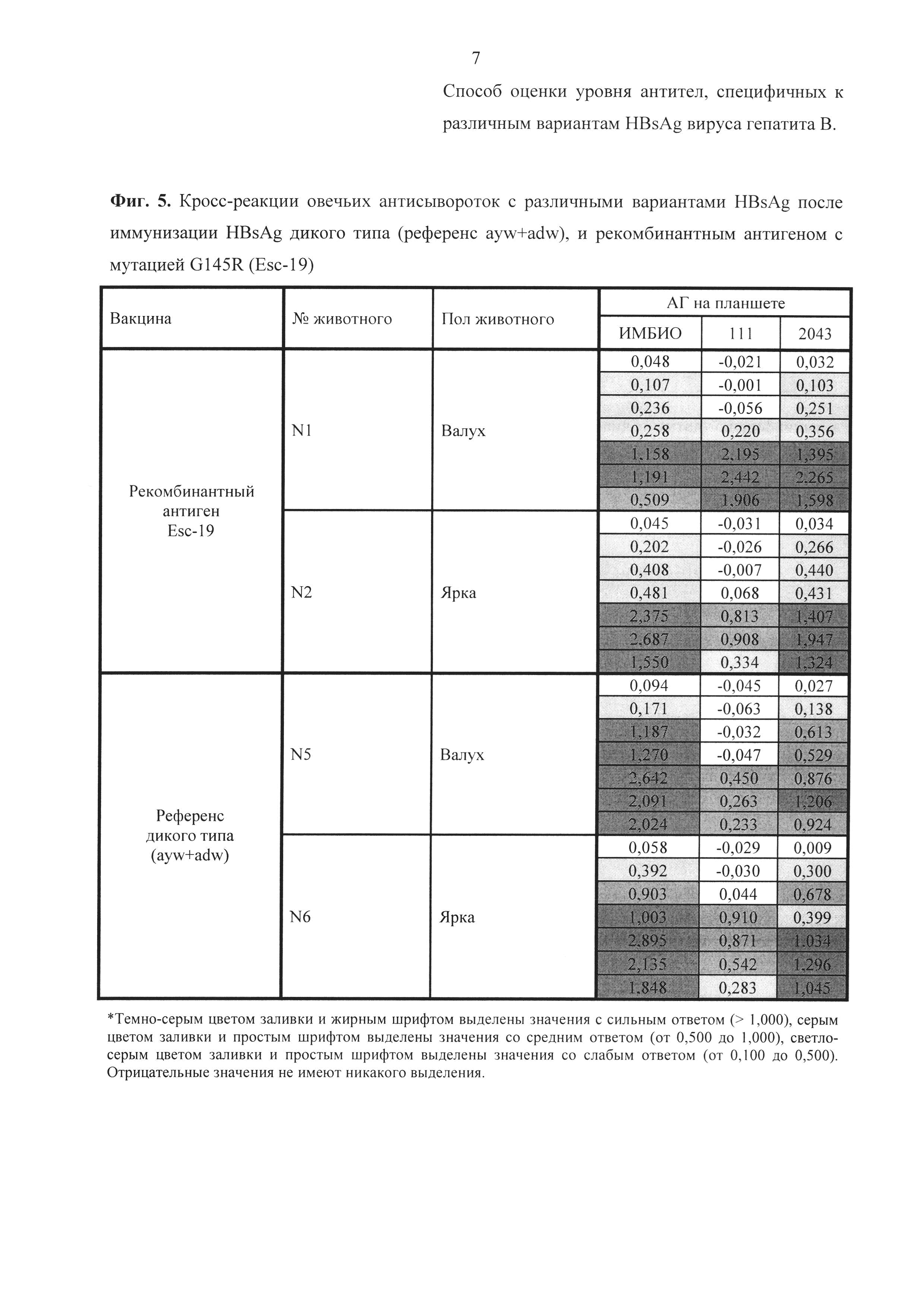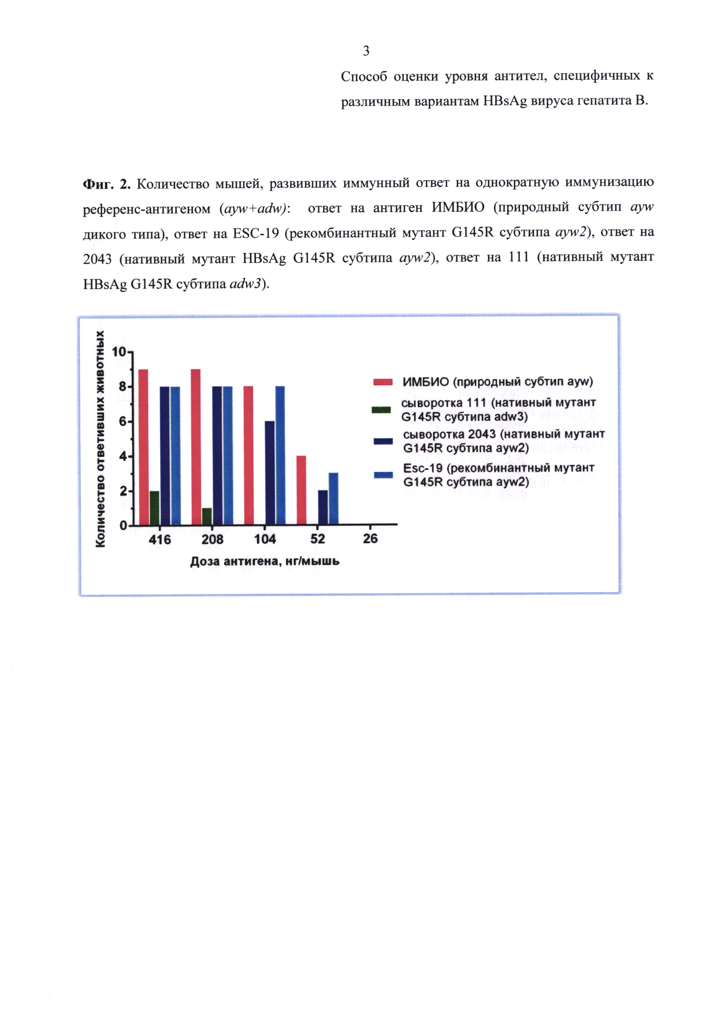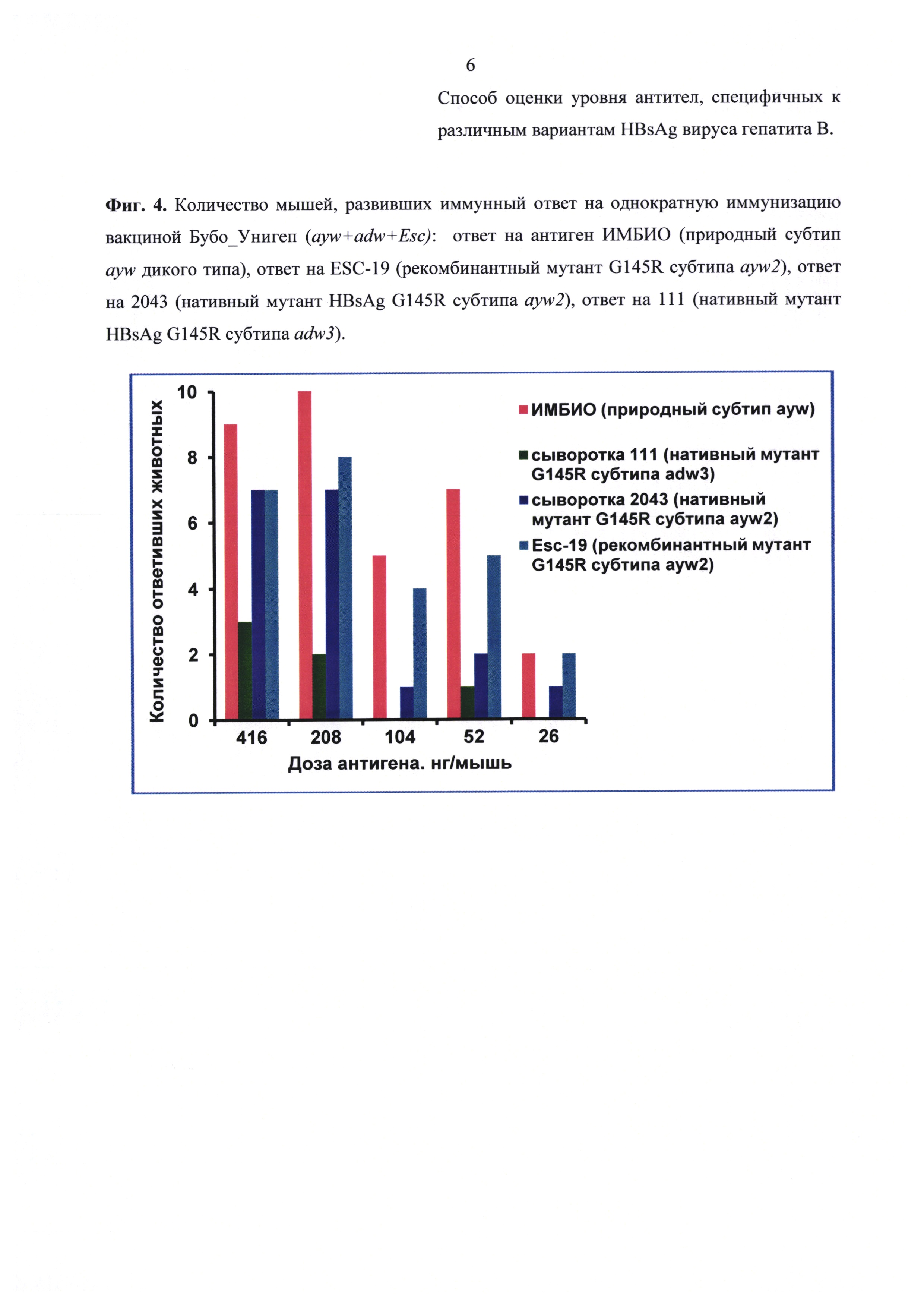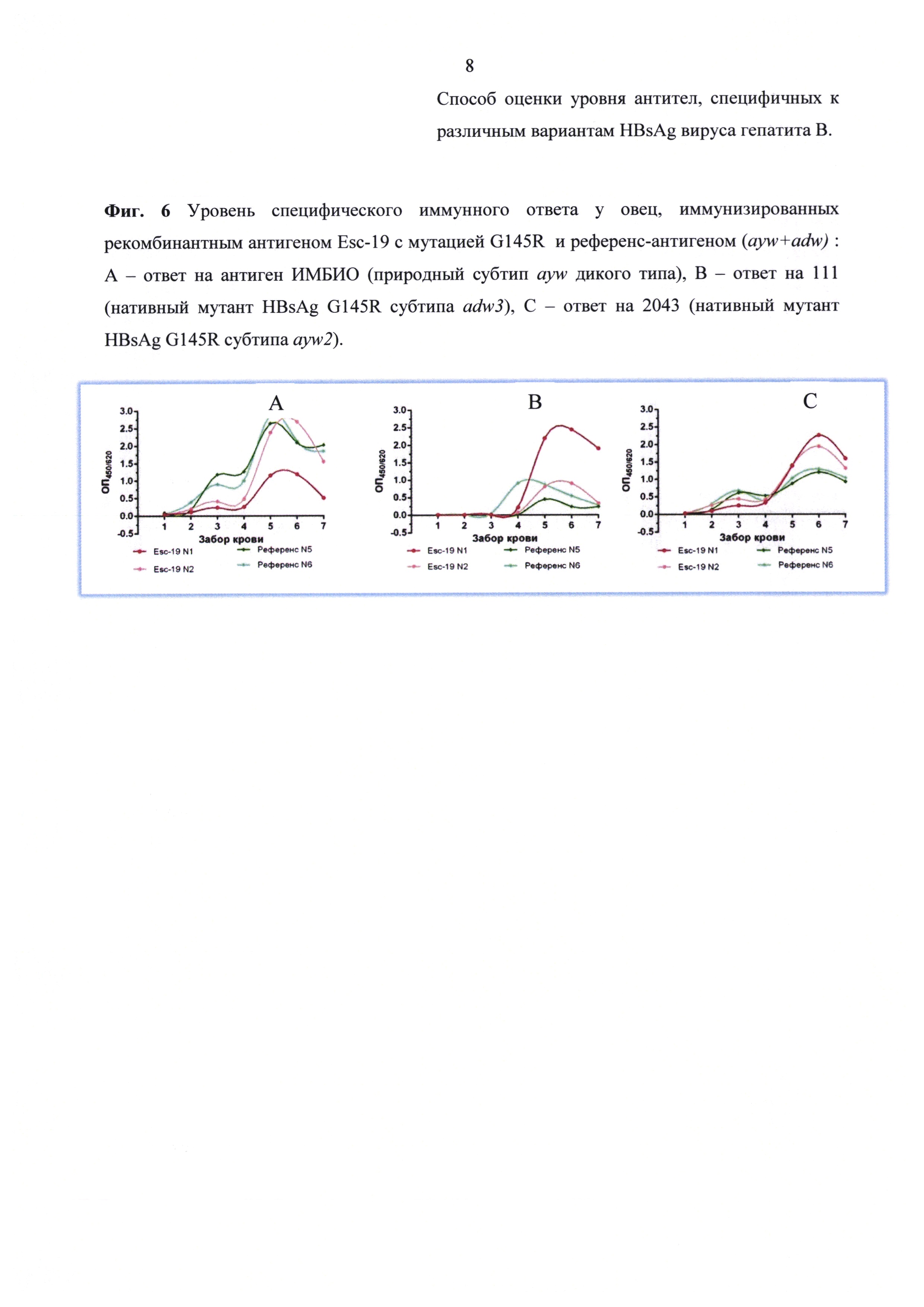 Изобретение относится к биотехнологии, в частности к иммунобиотехнологии, и может быть использовано для оценки потенциала, эффективности и специфической активности вакцин против вируса гепатита В (ВГВ), для изучения антигенных свойств HBsAg с разными субтипами и несущих различные мутации, в том числе серологически значимые мутации иммунологического и вакцинального ускользания, а также для клинической диагностики. Сущность изобретения: при оценке уровня специфических по отношению к тому или иному варианту HBsAg антител, полученных в результате иммунизации, используют сэндвич-ИФА. В качестве иммуносорбента применяют полистироловые планшеты, покрытые поликлональными антителами к HBsAg. Планшеты обрабатывают нативным или рекомбинантным HBsAg, охарактеризованным по генотипу, субтипу и наличию мутаций, после чего добавляют тестируемую сыворотку. На финальном этапе планшеты обрабатывают конъюгатом антител к суммарным иммуноглобулинам IgG, IgM и IgA с пероксидазой хрена и выявляют связавшийся конъюгат по цветной реакции с ТМБ. Способ позволяет увеличить спектр тестируемых антител, специфичных к различным формам HBsAg вируса гепатита В, включая субтипические и мутантные формы, а также провести количественную оценку уровня этих антител. 6 ил., 2 пр.