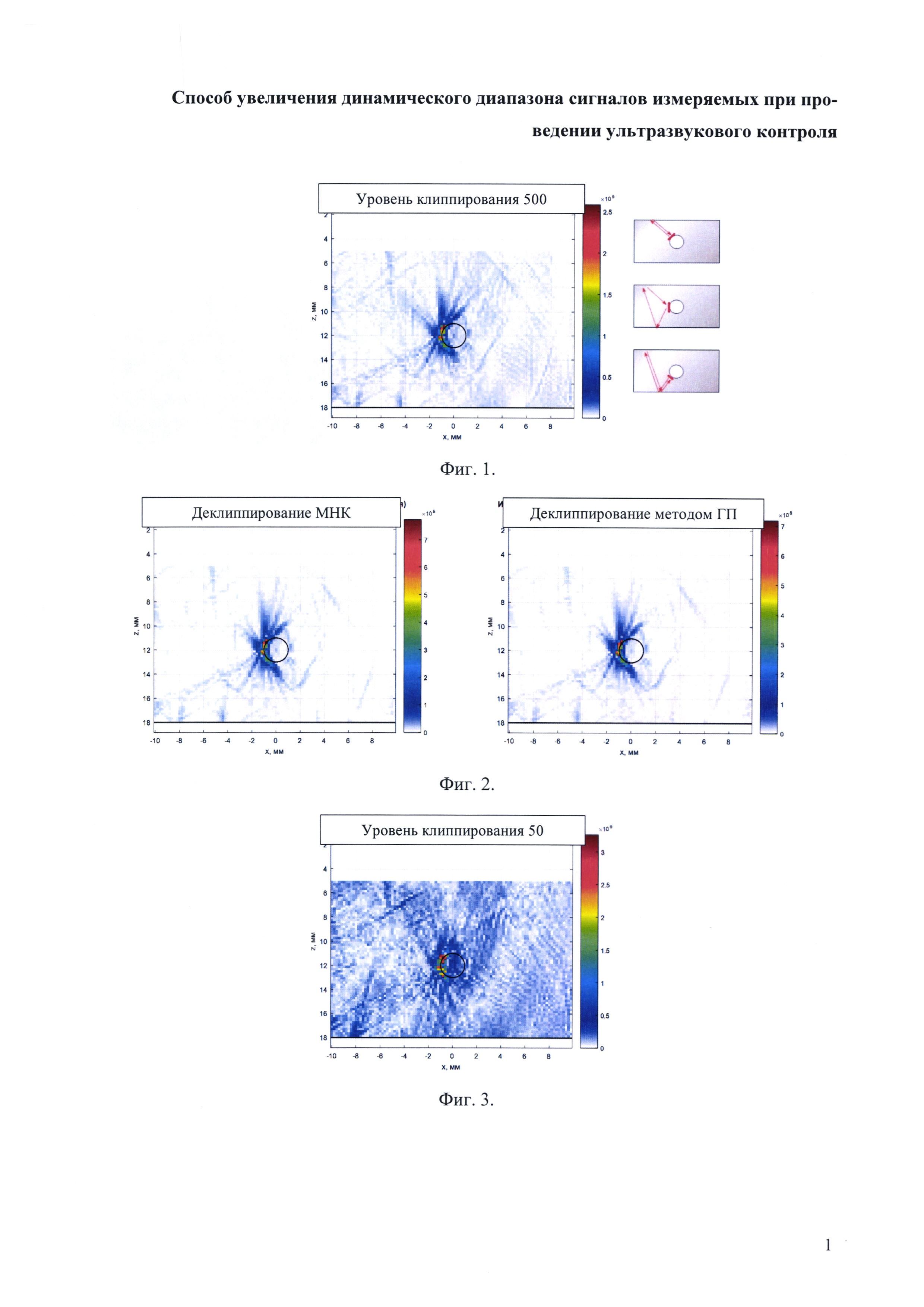 Способ увеличения динамического диапазона сигналов, измеряемых при проведении ультразвукового контроля, заключающийся в восстановлении исходной формы сигнала, искаженной за счет ограничения его амплитуды по заданным положительному и/или отрицательному уровням (клиппирование), отличающийся тем, что исходная форма сигнала восстанавливается (деклиппируется) итерационным способом, при котором спектр эхосигнала предыдущей итерации ограничивается в заданном частотном диапазоне, выполняется обратное преобразование Фурье, в полученном сигнале его значения на временных интервалах, где сигнал не искажен, заменяются значениями клиппированного сигнала, а на временных интервалах, где сигнал клиппирован, значения сигнала, по модулю меньшие уровня клиппирования, заменяются значениями уровня отсечки, после чего выполняется следующая итерация.