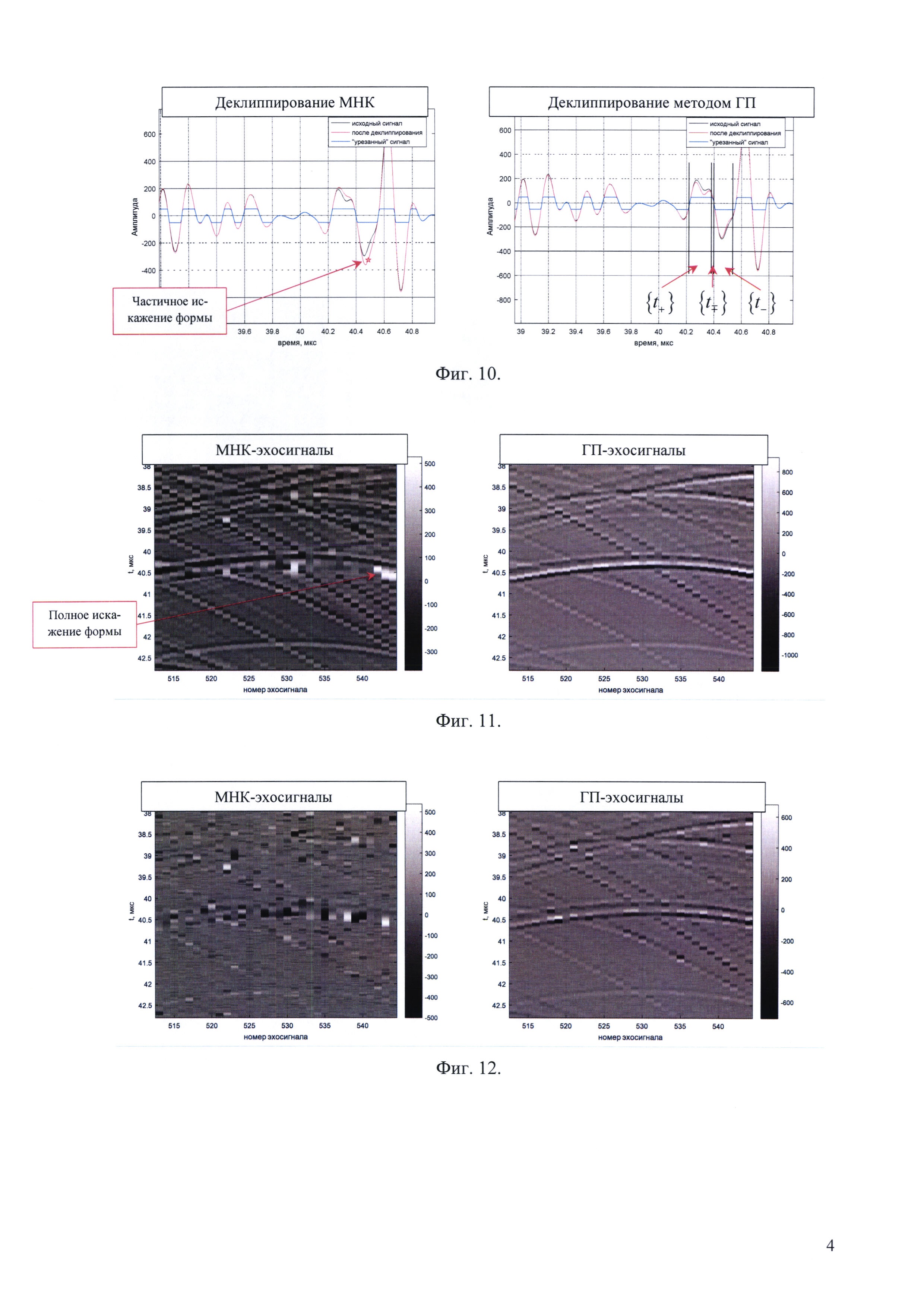 -интервалах уменьшалось число отсчетов, МНК теряет устойчивость. ГП-эхосигналы, показанные на Фиг. 10 справа, еще более похожие на неискаженные, чем на Фиг. 5 справа. Линиями синего цвета показан клиппированный сигнал, черного цвета неискаженный сигнал, а линией красного цвета деклиппированный эхосигнал. На Фиг.5 в качестве примера показаны