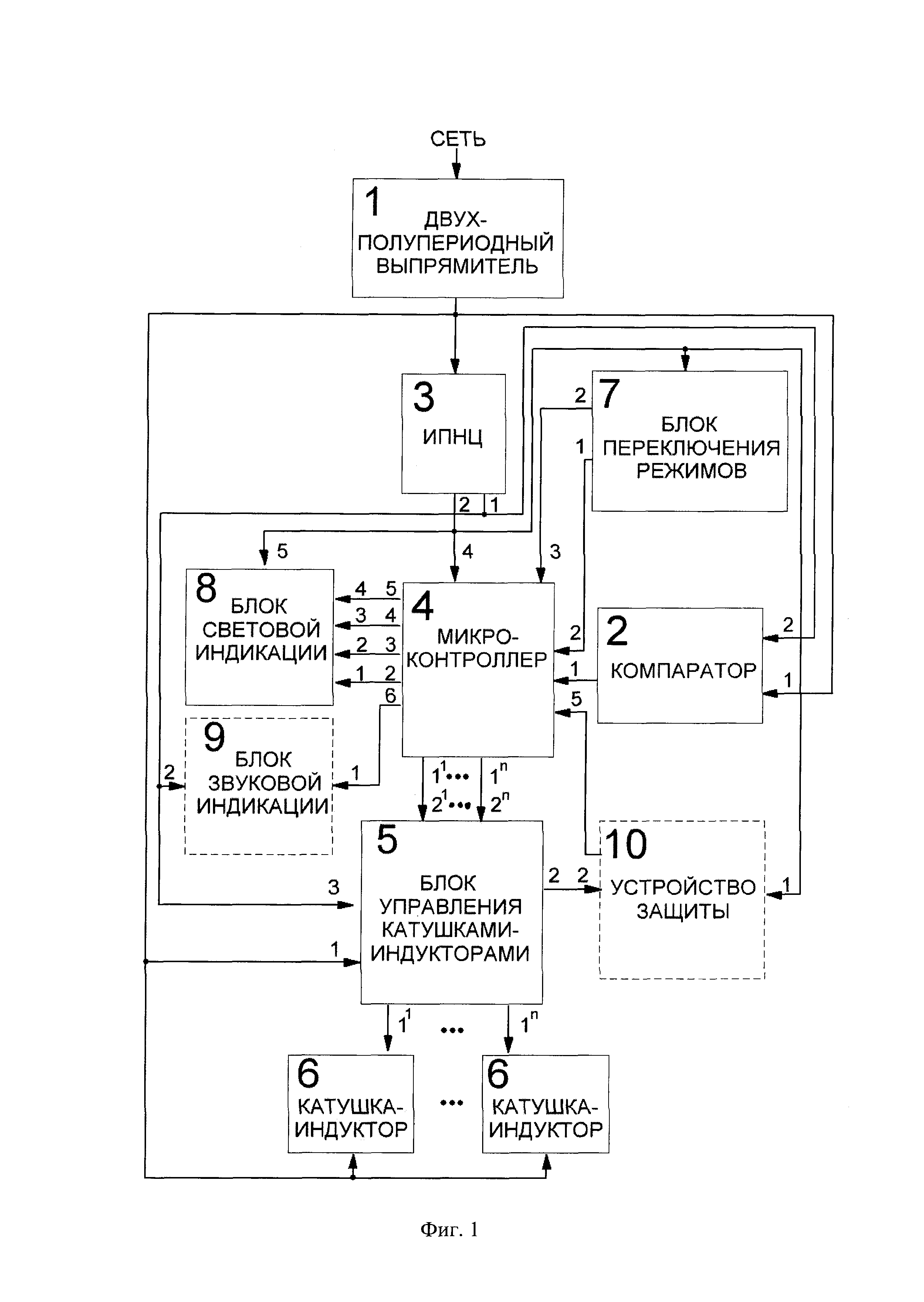 1. Аппарат магнитотерапевтический, включающий следующие элементы: двухполупериодный выпрямитель, n катушек-индукторов, блок управления катушками-индукторами, микроконтроллер, отличающийся тем, что дополнительно содержит компаратор, источник питания низковольтных цепей (ИПНЦ), блок переключения режимов, блок световой индикации, при этом все элементы аппарата объединены между собой общей земляной шиной, вход двухполупериодного выпрямителя предназначен для соединения со стандартной питающей сетью, выход двухполупериодного выпрямителя соединен с первым входом компаратора, входом ИПНЦ, первым входом блока управления катушками-индукторами и началами обмоток n катушек-индукторов, выход компаратора соединен с первым входом микроконтроллера, первый выход блока переключения режимов соединен со вторым входом микроконтроллера, второй выход блока переключения режимов соединен с третьим входом микроконтроллера, выходы 11-1n микроконтроллера соединены соответственно с входами 21-2n блока управления катушками-индукторами, выходы 11-1n которого соединены с соответствующими концами обмоток n катушек-индукторов, второй, третий, четвертый, пятый выходы микроконтроллера соединены с первым, вторым, третьим, четвертым входами блока световой индикации соответственно, первый выход ИПНЦ соединен со вторым входом компаратора и третьим входом блока управления катушками-индукторами, второй выход ИПНЦ соединен с четвертым входом микроконтроллера, входом блока переключения режимов и пятым входом блока световой индикации. 2. Аппарат магнитотерапевтический по п. 1, отличающийся тем, что включает дополнительный элемент - блок звуковой индикации, первый вход которого соединен с шестым выходом микроконтроллера, а второй вход - с первым выходом ИПНЦ. 3. Аппарат магнитотерапевтический по п. 1 или 2, отличающийся тем, что включает дополнительный элемент - устройство защиты, первый вход которого соединен со вторым выходом ИПНЦ, второй вход - со вторым выходом блока управления катушками-индукторами, а выход - с пятым входом микроконтроллера.