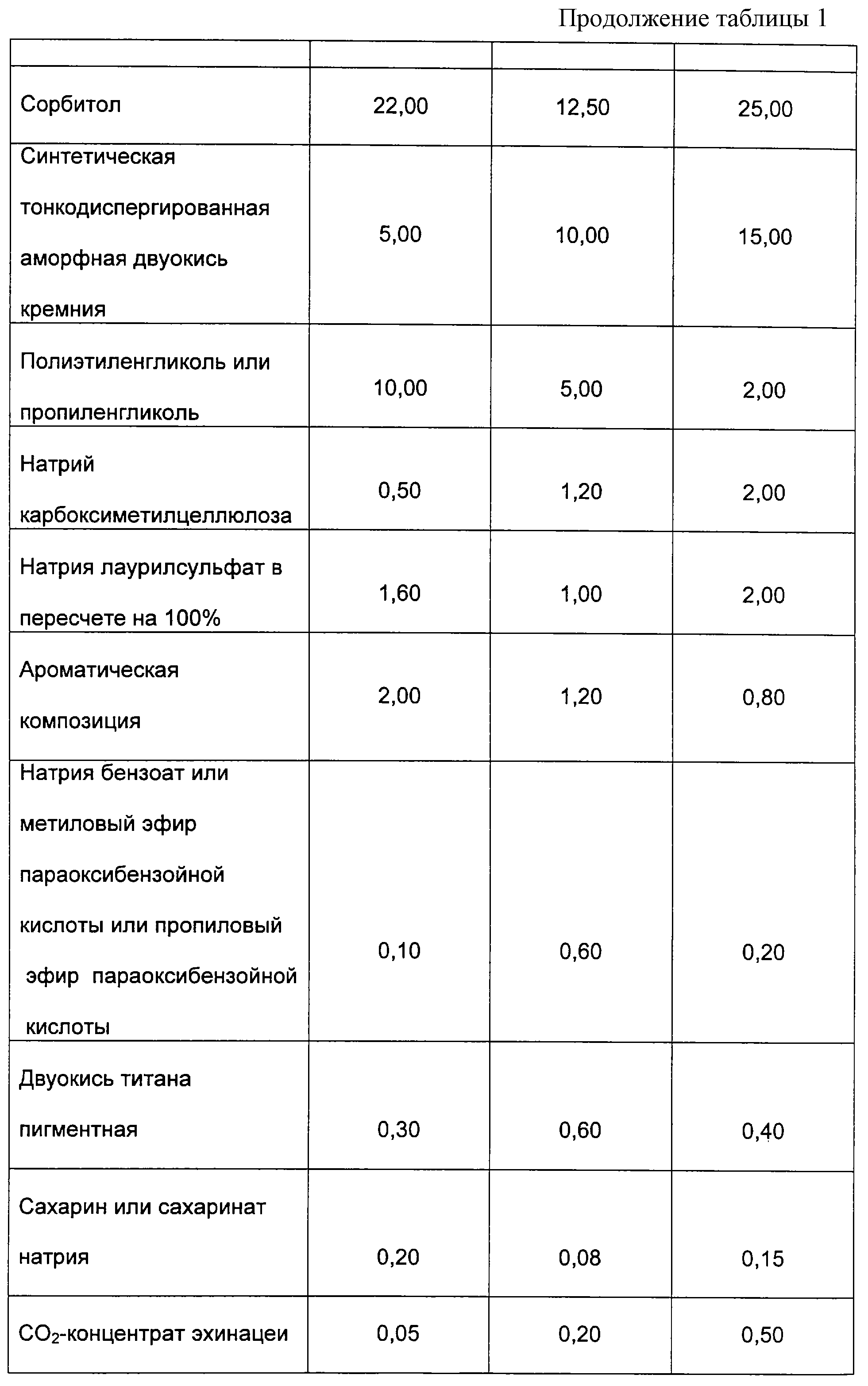 содержащая до критические СО2-экстракты [1]. Зубная паста [1] содержит мел, натрий карбоксиметилцеллюлозу, натрийлаурилсульфат, масло парфюмерное, сахарин, экстрактивные