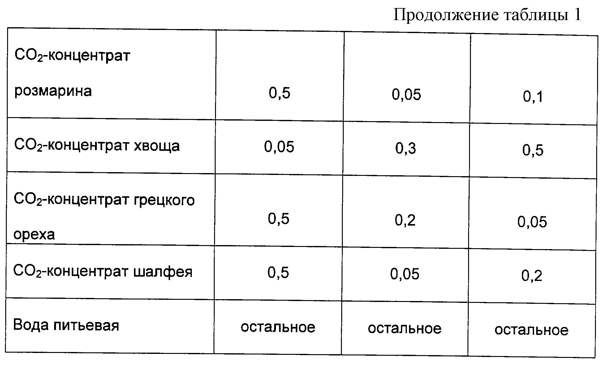 углекислотные СО2-концентраты шалфея, грецкого ореха, хвоща полевого, эхинацеи, розмарина, при следующем соотношении компонентов, мас.%:
