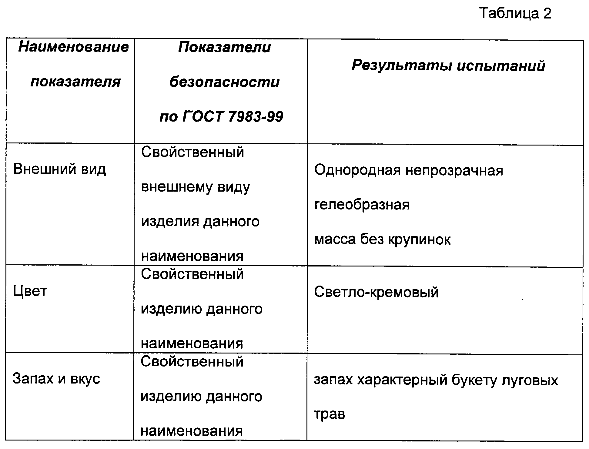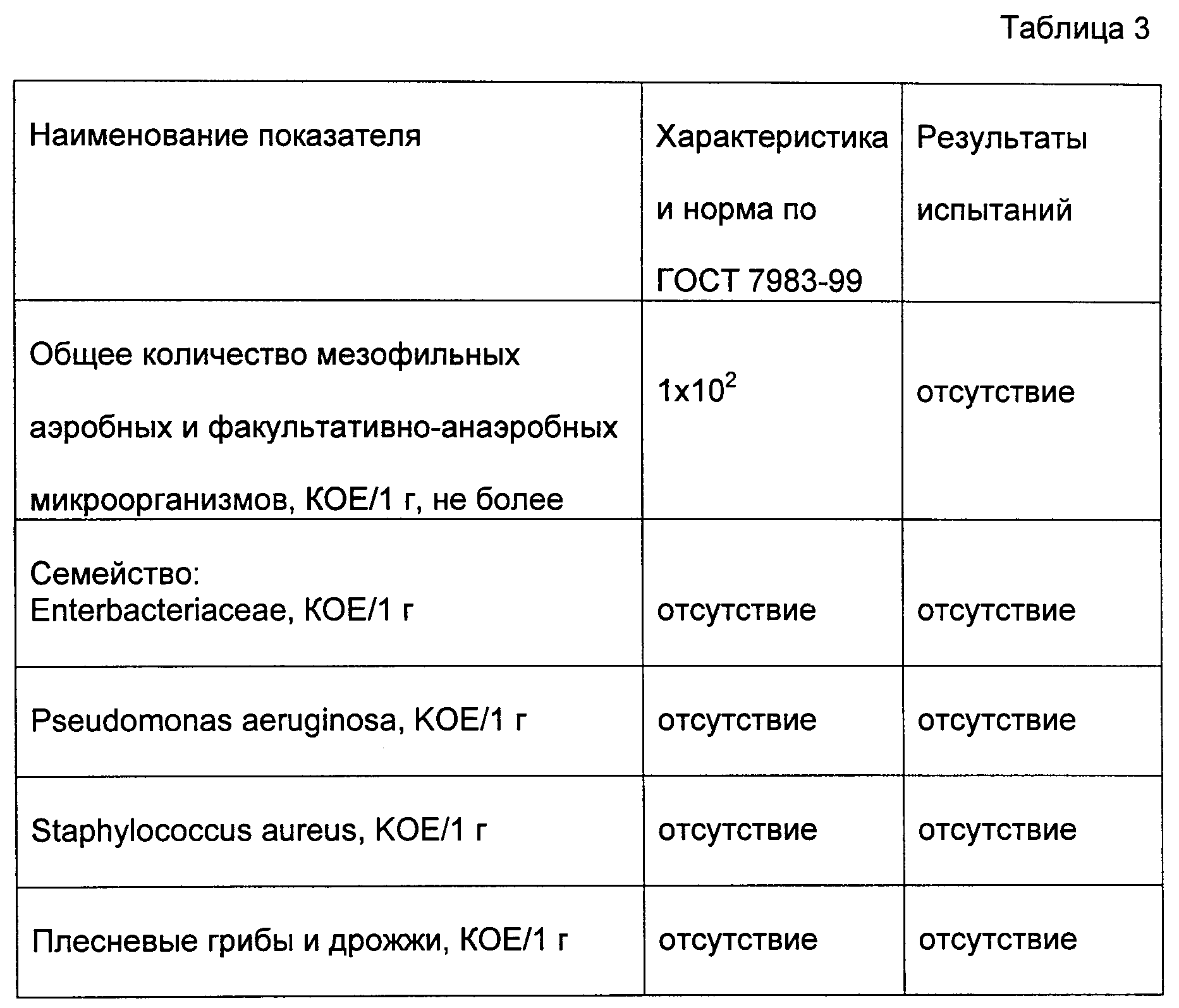 хранения без изменения органолептических, микробиологических, физико-химических свойств не менее 2-х лет. Физико-химические показатели заявляемой зубной пасты приведены в табл.2. В ходе разработки зубной пасты были выявлены следующие показатели по микробиологической чистоте (см. табл.3). Более того, выяснилось, что биологически активные концентраты