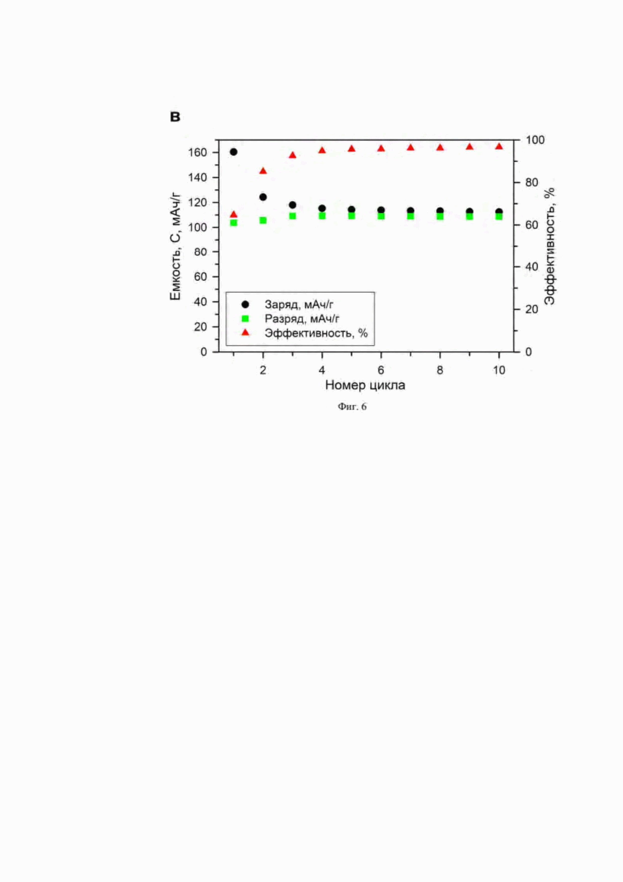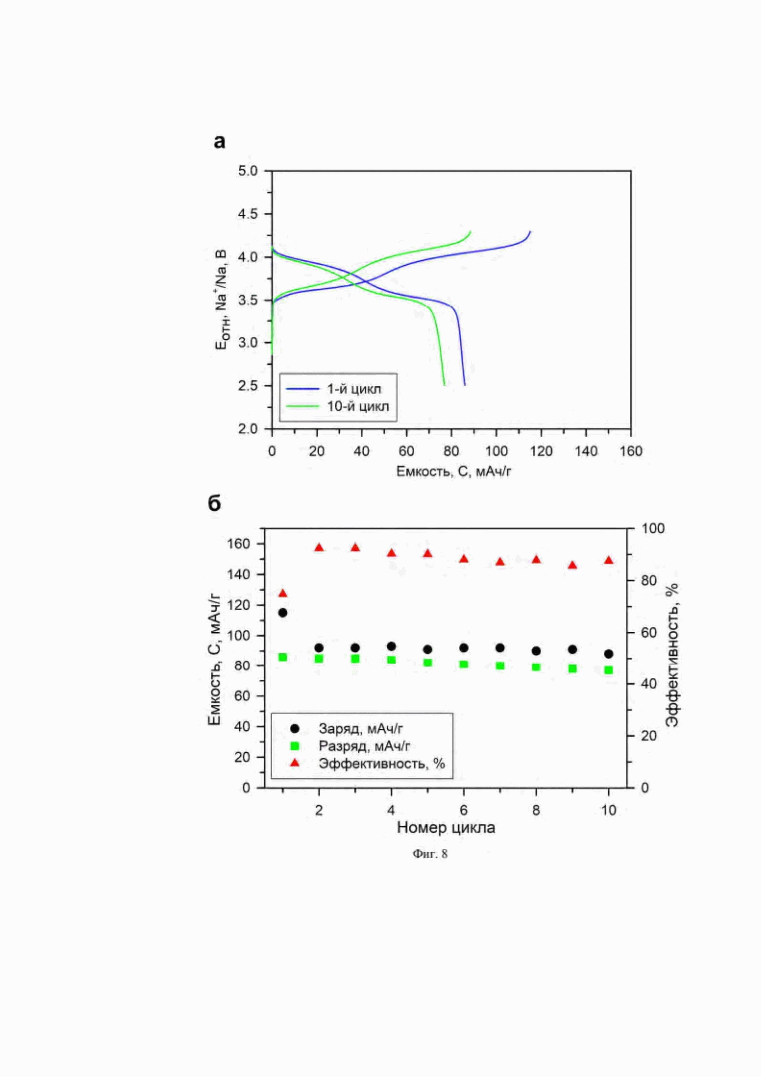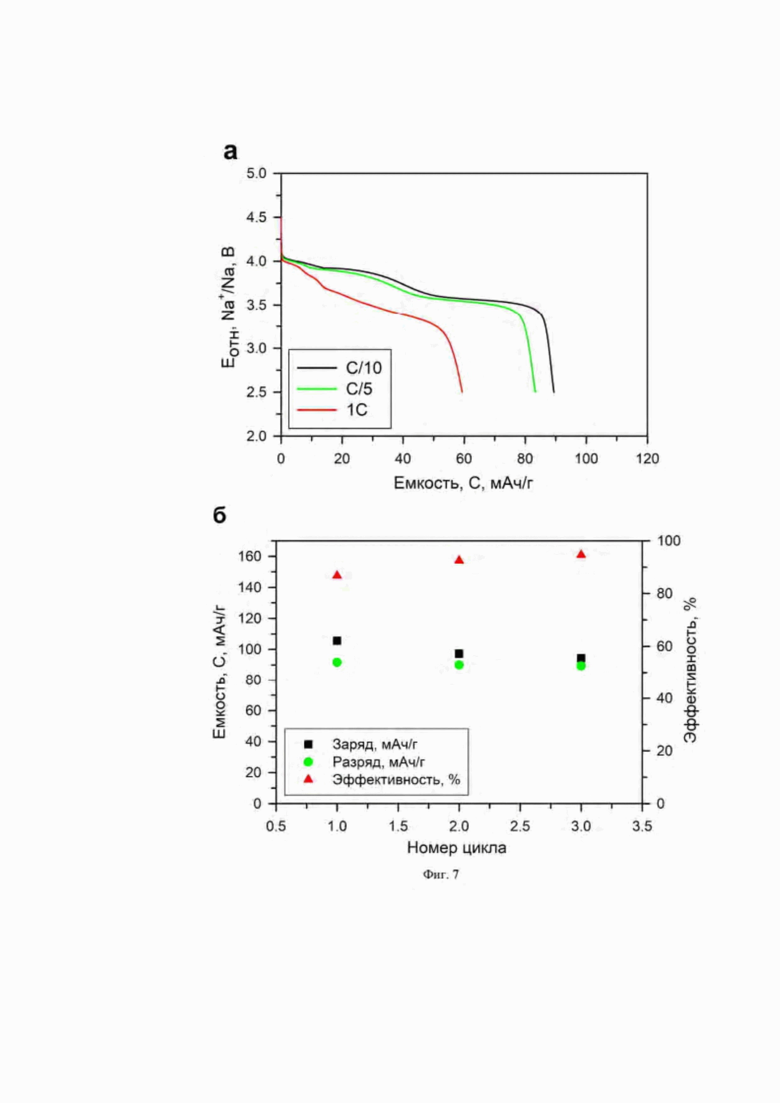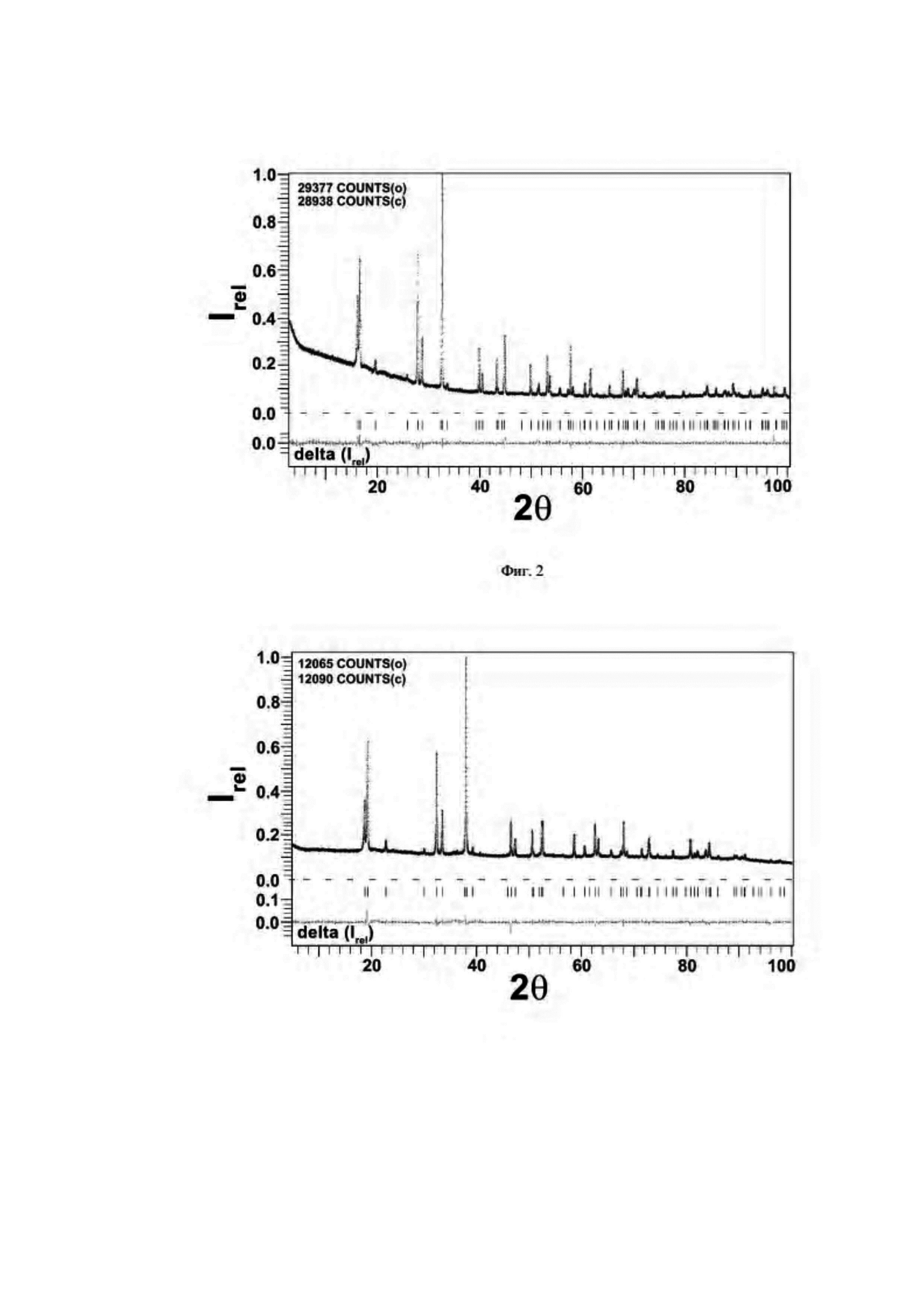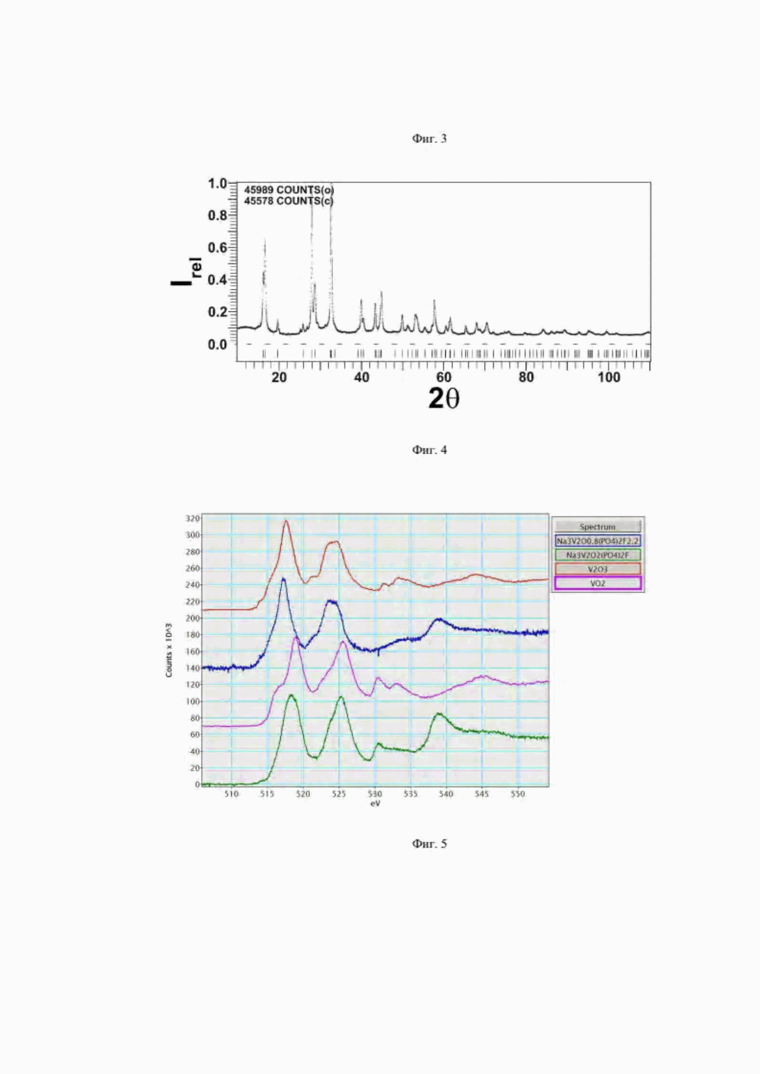 ) рентгеновского излучения. Полученные результаты демонстрируют, что все полученные образцы являются однофазными (Фиг. 2, 3 и 4). Уточнение кристаллической структуры проводили методом Ритвельда с использованием программного обеспечения Jana 2006. Авторами настоящего изобретения было обнаружено, что катодный материал состава Na3V2O2x(PO4)2F3-2x (где 0<х≤1) кристаллизуется в структурном типе НАСИКОН (тетрагональная решетка, пр. гр. I4/mmm). Параметры элементарной ячейки изменяются в зависимости от состава образцов и находятся в пределах