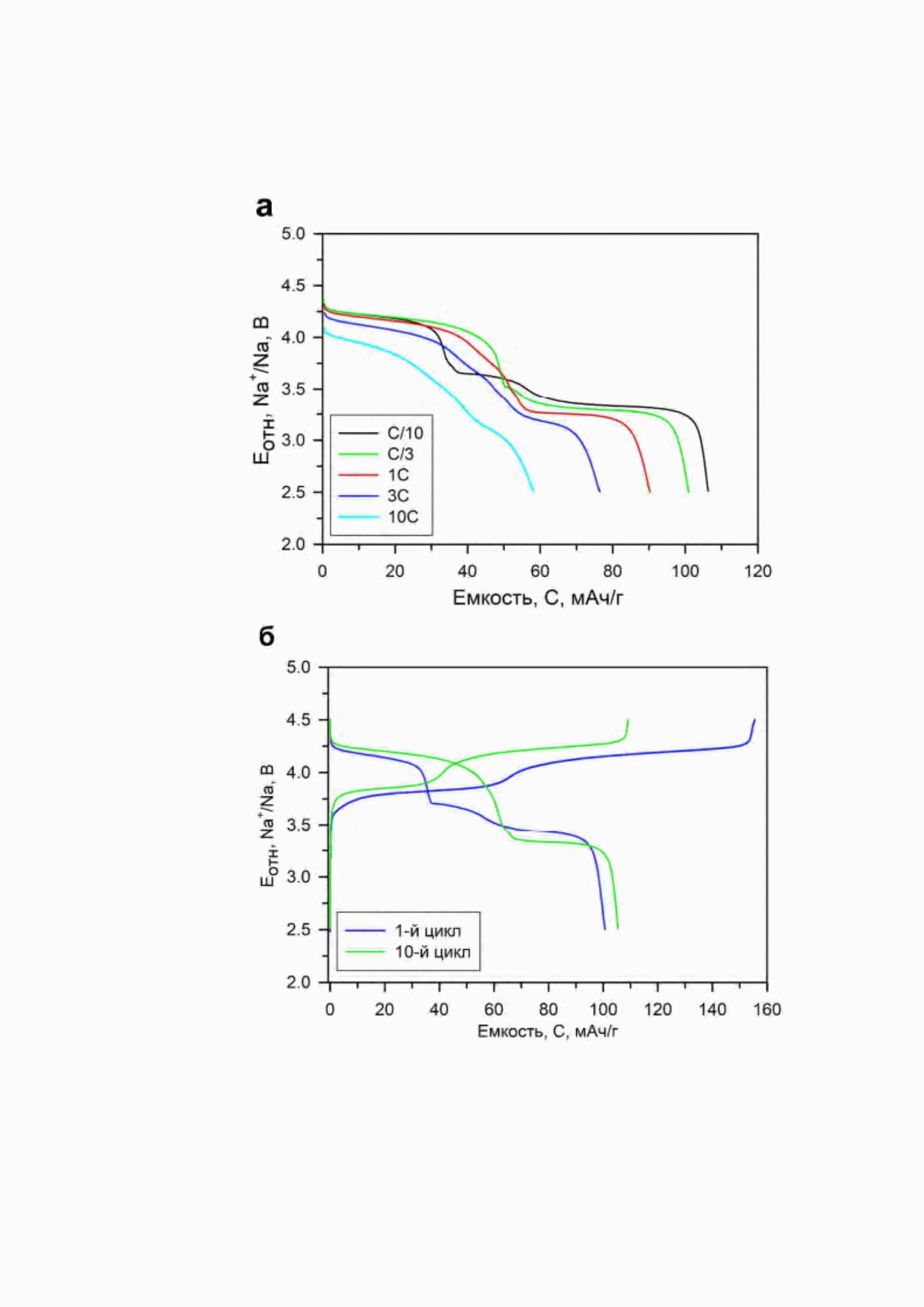 1. Способ получения катодного материала, содержащего Na3V2O2x(PO4)2F3-2x (0<х≤1), включающий воздействие на реакционную смесь, содержащую оксид ванадия V2O5, дигидрофосфат аммония NH4H2PO4, фтористый натрий NaF, восстановитель катионов ванадия V+5 и воду, микроволновым излучением. 2. Способ по п. 1, в котором смесь расположена в герметически закрытой емкости. 3. Способ по п. 1 или 2, в котором частота микроволнового излучения находится в диапазоне от 300 МГц до 300 ГГц. 4. Способ по любому из предшествующих пунктов, в котором реакционная смесь находится при температуре в диапазоне от 80°С до 500°С, более предпочтительно от 100°С до 250°С, наиболее предпочтительно от 180°С до 220°С. 5. Способ по любому из предшествующих пунктов, в котором воздействие осуществляют в течение по меньшей мере 5 мин, более предпочтительно в течение по меньшей мере 30 мин, наиболее предпочтительно в течение от 5 мин до 60 мин. 6. Способ по любому из предшествующих пунктов, в котором оксид ванадия V2O5, дигидрофосфат аммония NH4H2PO4 и фтористый натрий NaF в реакционной смеси находятся примерно в стехиометрических отношениях. 7. Способ по любому из предшествующих пунктов, в котором восстановитель катионов ванадия V+5 находится в реакционной смеси в отношении к V2O5, составляющем по меньшей мере 1:1, более предпочтительно в отношении, находящемся в диапазоне от 1,8:1 до 2,2:1, наиболее предпочтительно в отношении, составляющем примерно 2:1. 8. Способ по любому из предшествующих пунктов, в котором восстановитель выбран из группы, состоящей из щавелевой кислоты, хлорида гидразиния, сульфата гидразиния, лимонной кислоты или их смеси в любом сочетании. 9. Способ по любому из предшествующих пунктов, в котором реакционная смесь дополнительно содержит электропроводящую добавку, предпочтительно в отношении к V2O5, составляющем от 0,8:1 до 1,2:1, наиболее предпочтительно примерно 1:1. 10. Способ по п. 9, в котором электропроводящая добавка представляет собой восстановленный оксид графена. 11. Способ по любому из предшествующих пунктов, в котором соединение Na3V2O2x(PO4)2F3-2х имеет формулу Na3V2O0,8(PO4)2F2,2 или Na3V2O2(PO4)2F. 12. Способ по любому из предшествующих пунктов, в котором катодный материал является однофазным и кристаллизуется в тетрагональной ячейке с пространственной группой I4/mmm со смешанной степенью окисления катионов V+3 и V+4. 13. Способ по любому из предшествующих пунктов, в котором катодный материал состоит из кубических, пластинчатых, цилиндрических частиц или частиц в виде волокон. 14. Однофазный катодный материал, содержащий Na3V2O2x(PO4)2F3-2x (0<х≤1), имеющий кристаллическую решетку, характеризующуюся тетрагональной ячейкой с пространственной группой I4/mmm со смешанной степенью окисления катионов V+3 и V+4. 15. Однофазный катодный материал по п. 14, обеспечивающий разрядную емкость в пределах 90-110 мАч/г при плотности тока С/10. 16. Однофазный катодный материал по п. 14 или 15, отличающийся тем, что Na3V2O2x(PO4)2F3-2x (0<x≤1) имеет формулу Na3V2O0,8(PO4)2F2,2 или Na3V2O2(PO4)2F. 17. Однофазный катодный материал по любому из пп. 14-16, состоящий из кубических, пластинчатых, цилиндрических частиц или частиц в виде волокон. 18. Однофазный катодный материал по любому из пп. 14-17, дополнительно содержащий электропроводящую добавку. 19. Однофазный катодный материал по п. 18, в котором электропроводящая добавка представляет собой восстановленный оксид графена. 20. Применение катодного материала 