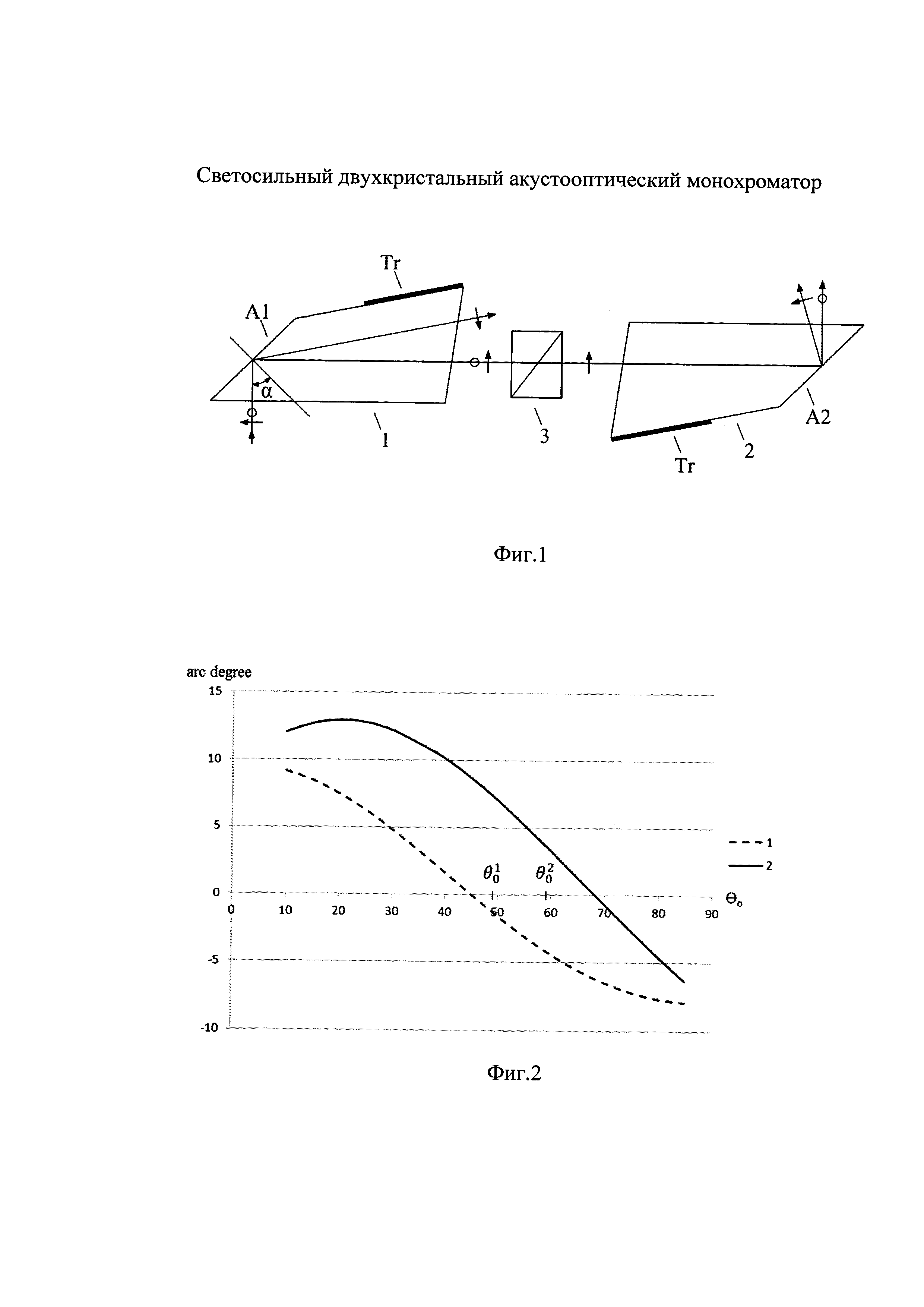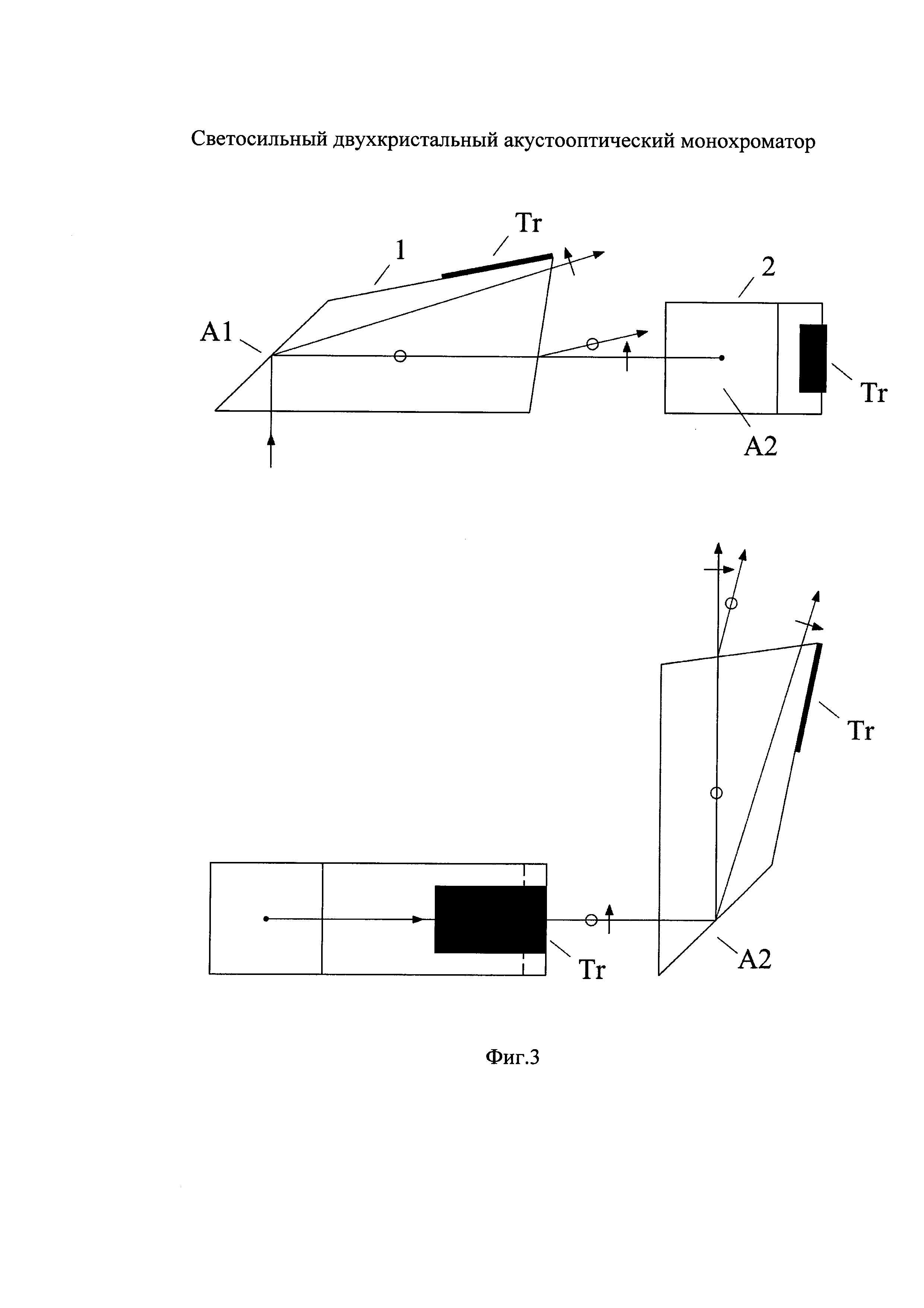 Изобретение относится к прикладной оптике и может быть использовано в акустооптических спектрометрах, газоанализаторах и в спектроскопии комбинационного (рамановского) рассеяния. Известны различные конструкции акустооптических (АО) монохроматоров (US №3756689, опубл. 1973 г.; US №4052121, опубл. 1977 г.; SU №1340395 А1, опубл. 1988 г; SU №1406554, опубл. 1988 г.; US №4720177, опубл. 1988 г.; US №5329397, опубл. 1994 г.; RU №2169936 С2, опубл. 2001 г.). Двухкристальные АО монохроматоры, в которых происходит последовательная дифракция светового излучения, в отличие от одинарных обладают целым рядом достоинств: резкое подавление паразитного пропускания прямого излучения, значительное уменьшение вклада боковых лепестков в аппаратную функцию [1, 2]. Особенно это важно при использовании таких АО монохроматоров для передачи изображения, поскольку в двухкристальных монохроматорах существенно снижаются хроматические искажений. Однако при этом за счет дополнительных элементов уменьшается коэффициент передачи монохроматора. Повышение коэффициента передачи мононохроматоров АО спектрометров, особенно монохроматоров для передачи изображения, - важная и актуальная задача. Эта задача обычно решается несколькими способами - увеличением входной апертуры, увеличением угла зрения, качественным просветлением всех оптических элементов. Однако этот путь практически исчерпан. Известен двухкристальный акустооптический монохроматор, содержащий два АО фильтра, у которых оптический выход первого АО фильтра оптически связан с оптическим входом второго АО фильтра (Мазур М.М. и др. Двойной акустооптический монохроматор на CaMoO4; Оптика и спектроскопия, том 67, вып. 3, 1989 г.; Мазур М.М. и др. Спектрометр с двойным акустооптическим монохроматором; Оптика и спектроскопия, том 81, вып. 3, 1996 г.). Недостатком такого устройства является необходимость использовать две корректирующие призмы, а также использование трех поляризаторов, что приводит к усложнению оптической схемы и уменьшению коэффициента пропускания. Также известен двухкристальный акустооптический монохроматор (патент РФ №2242779), содержащий два АО фильтра, у которых оптический выход первого АО фильтра оптически связан с оптическим входом второго АО фильтра. Недостатком такого устройства является использование трех поляризаторов и уменьшение коэффициента пропускания. Решаемая настоящим изобретением задача – увеличение коэффициента пропускания двухкристального АО монохроматора – обеспечивается за счет уменьшения оптических потерь при применении АО ячеек с отражающей световой пучок гранью А, которая выполняет роль разводящего поляризатора. В результате не нужно использовать входной и выходной поляризаторы, а в некоторых вариантах отпадает необходимость и в промежуточном поляризаторе. Достигаемым техническим результатом при использовании заявленного устройства, является увеличение коэффициента пропускания монохроматора, упрощение конструкции монохроматора. Данный технический результат достигается за счет того, что в светосильном двухкристалическом акустооптическом монохроматоре, состоящем из оптически соединенных входного элемента селекции поляризации света, первой АО ячейки, промежуточного элемента селекции поляризации света, второй АО ячейки, выходного элемента селекции поляризации света, роль входного и выходного 