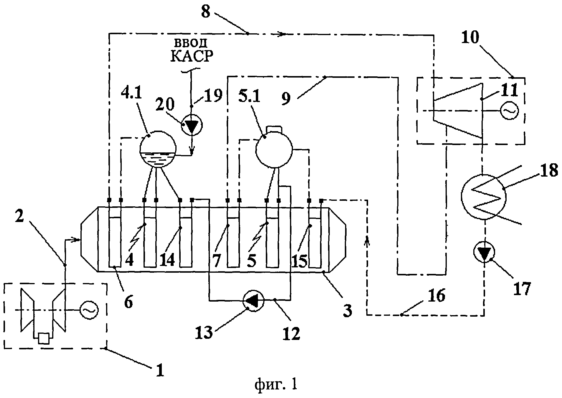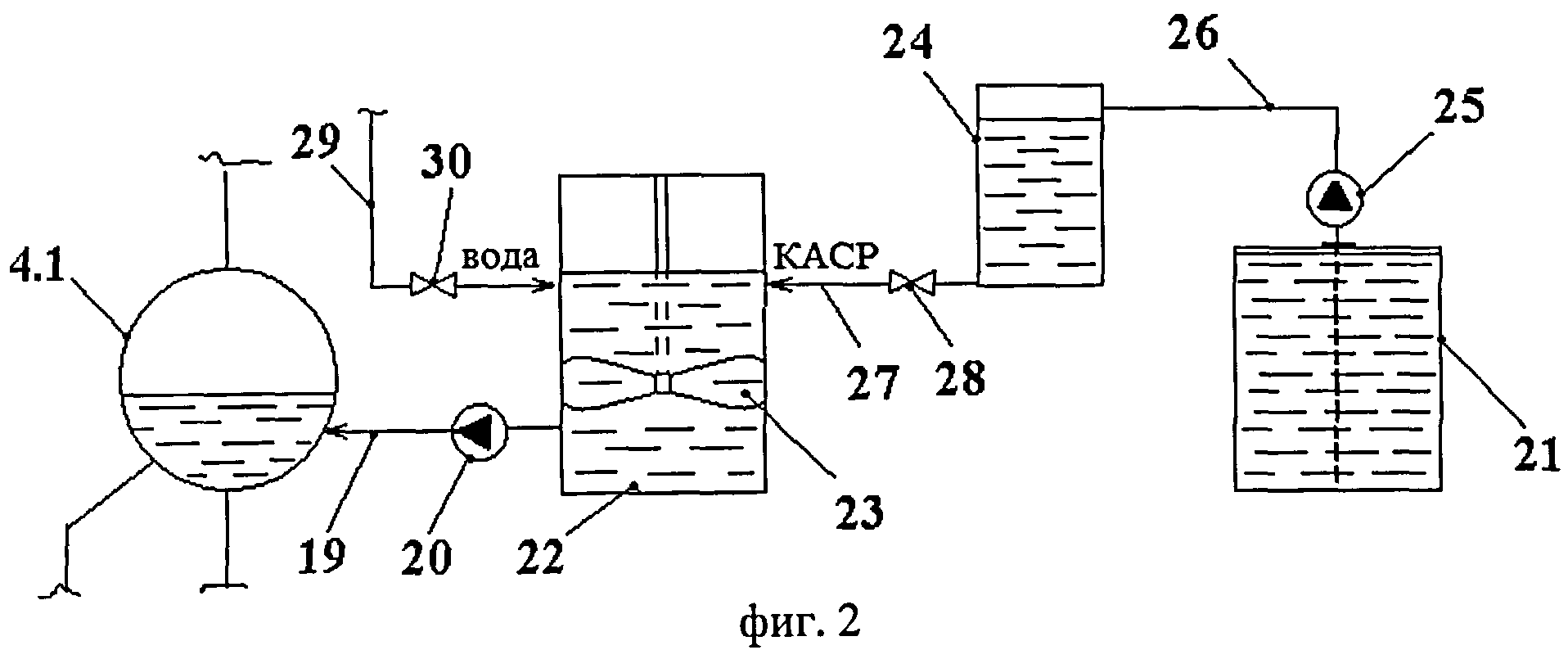Область использования Изобретение относится к области теплоэнергетики и может быть использовано при организации водно-химического режима на основе комплексных аминосодержащих реагентов (КАСР) для пароводяного тракта энергоблока с барабанными котлами и, в частности, с котлами-утилизаторами (КУ) применительно к энергоблокам с парогазовыми установками (ПТУ). Предшествующий уровень техники Известен выбранный в качестве прототипа заявляемого изобретения способ организации водно-химического режима (ВХР) пароводяного тракта энергоблока с барабанными котлами путем дозирования в указанный тракт КАСР (Инструкция по коррекционной обработке комплексным реагентом Epuramin (Эпурамин) теплоносителя котлов давлением (2,4-13,8 МПа, СО 34.37.535-2004). Указанный способ в связи с высоким значением коэффициента распределения используемых реагентов в сторону повышенной концентрации его в паре не гарантирует требуемой величины pH котловой воды. Кроме того, низкое содержание реагента в котловой воде не способствует созданию стабильной защитной аминомагнетитовой пленки на стенках соответствующих поверхностей нагрева, что приводит к их интенсивной коррозии, в особенности в испарительных поверхностях высокого давления КУ ПТУ из-за высоких скоростей водопаровой среды в их выходной части, приводящих к срыву защитной пленки. Раскрытие изобретения Задачей, на решение которой направлено заявляемое изобретение, является организации ВХР на основе КАСР для пароводяного тракта энергоблока с барабанными котлами, в том числе с КУ в составе ПТУ, обеспечивающего эффективную защиту от внутренней коррозии поверхностей нагрева всего пароводяного тракта котла, а достигаемым техническим результатом - обеспечение равномерного распределения концентрации реагента между паром и котловой водой. Достигаемые задача и технический результат изобретения обеспечиваются тем, что в способе организации ВХР пароводяного тракта энергоблока с барабанными котлами путем дозирования в указанный тракт КАСР, согласно изобретению в качестве реагента используют водный раствор смеси моноэтаноламина, 1,3-олеилпропандиамина этоксилированных жирных алкиламинов и диэтиламиноэтанола при следующем соотношении компонентов, мас.%: моноэтаноламин 24,0…26,0, диэтиламиноэтанол 7,0…8,0, 1,3-олеилпропандиамина 2,0…3,0, этоксилированные жирные алкиламины 0,5…1,5, вода - остальное до 100%, дозирование реагента осуществляют в одну точку водяной части пароводяного тракта, а концентрацию указанного реагента по всему пароводяному тракту поддерживают в пределах (2…50) мкг/л. При этом применительно к барабанным КУ с контурами разных давлений в составе ПТУ дозирование реагента преимущественно производят в водяную часть контура высокого давления. Краткое описание фигур На фиг.1 изображена принципиальная схема ПТУ с указанием места КАСР; на фиг.2 - узел приготовления и ввода КАСР в барабан высокого давления КУ. Подробное описание изобретения ПТУ, в пароводяном тракте которой организуется ВХР согласно изобретению, (фиг.1) содержит газотурбинную установку (ГТУ) 1 с выхлопным трактом 2, подключенным ко входу КУ 3. Последний оборудован двумя контурами 4,5 циркуляции котловой воды с соответственно барабаном высокого давления (БВД) 4.1 и барабаном низкого давления БВД 5.1. Паровые отсеки барабанов 4.1 и 5.1 соединены с