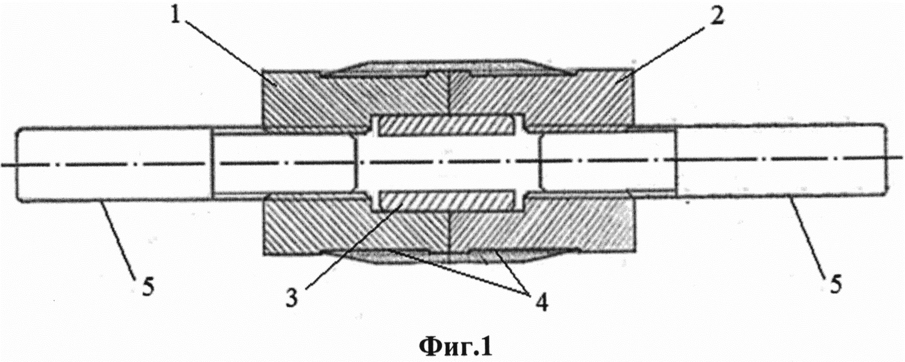 Изобретение относится к методам оценки когезии металлических порошковых покрытий для изделий, изготовленных из металлов и сплавов, и которое может быть использовано в различных отраслях машиностроения для повышения качества и надежности продукции за счет использования газотермических и газодинамического методов нанесения покрытий различного назначения. Известен способ оценки когезионной прочности порошковых металлических покрытий со стальной поверхностью, заключающийся в нанесении покрытия на металлическую подложку и отрыве покрытия от подложки, определения максимальной нагрузки, необходимой для отрыва слоя покрытия, и по ее величине вычисления значения когезии (Патент РФ №2309397, МПК G01N 19/04, 2006 г.). При этом способе оценки свойств покрытия используются образцы в виде металлических пластин (подложки) с нанесенным на них газотермическим покрытием. Для определения когезионной прочности осуществляют разрыв образца в разрывной машине. К недостаткам таких образцов, которые используются для оценки свойств покрытия, следует отнести невозможность получения качественного (без внутренних полостей) газодинамического покрытия на поверхности составной пластины подложки, к которой предъявляются высокие требования по соосности и стыковке сопрягаемых элементов подложки, а также установки испытываемых образцов на разрывной машине, что существенным образом влияет на точность оценки когезионной прочности газотермических покрытий. Наиболее близким к предлагаемому образцу для оценки когезионной прочности является образец, описанный в промышленном стандарте для испытания покрытий, нанесенных газотермическими методами напыления (Японский промышленный стандарт Н8663-1961). Описанный в документах стандарта образец состоит из двух полых частей (половинок) с торцевыми ступенчатыми проточками, которые обеспечивают центрирование частей образца за счет совмещения проточек цилиндрических частей. На этапе подготовки испытаний образца на разрывной машине при нанесении покрытия на образец используется технологическая оснастка в виде шпильки с резьбой и гайки, которыми соединяются и стягиваются две части, после чего образец помещается в растягивающую испытательную машину, на которой проводится оценка разрушения покрытия. Важным при оценке когезионной прочности газодинамического покрытия является исключение факторов, влияющих на качество покрытия в процессе его напыления на подложку при подготовке образца к испытаниям на разрывной машине, в частности не допускаются существенные дефекты поверхности в виде несплошности размером более 20 мкм, а также «затекание» частиц покрытия в зазоры стыка частей подложки. Нанесение покрытия по японскому промышленному стандарту показало невозможность получения качественного слоя металла для проведения испытания на когезию. При совмещении двух частей образца между ними формируется незначительный зазор 50-60 мкм, который несущественен при газотермическом напылении, где используются частицы ≥60 мк. В газодинамическом напылении используют частицы ≤50 мк, которые попадают в зазор и не формируют полноценного покрытия на поверхности образца по краям зазора. При значительной толщине напыления ≥1 мм наносимый металл закрывает всю поверхность образца, включая зазор, но при последующей мех