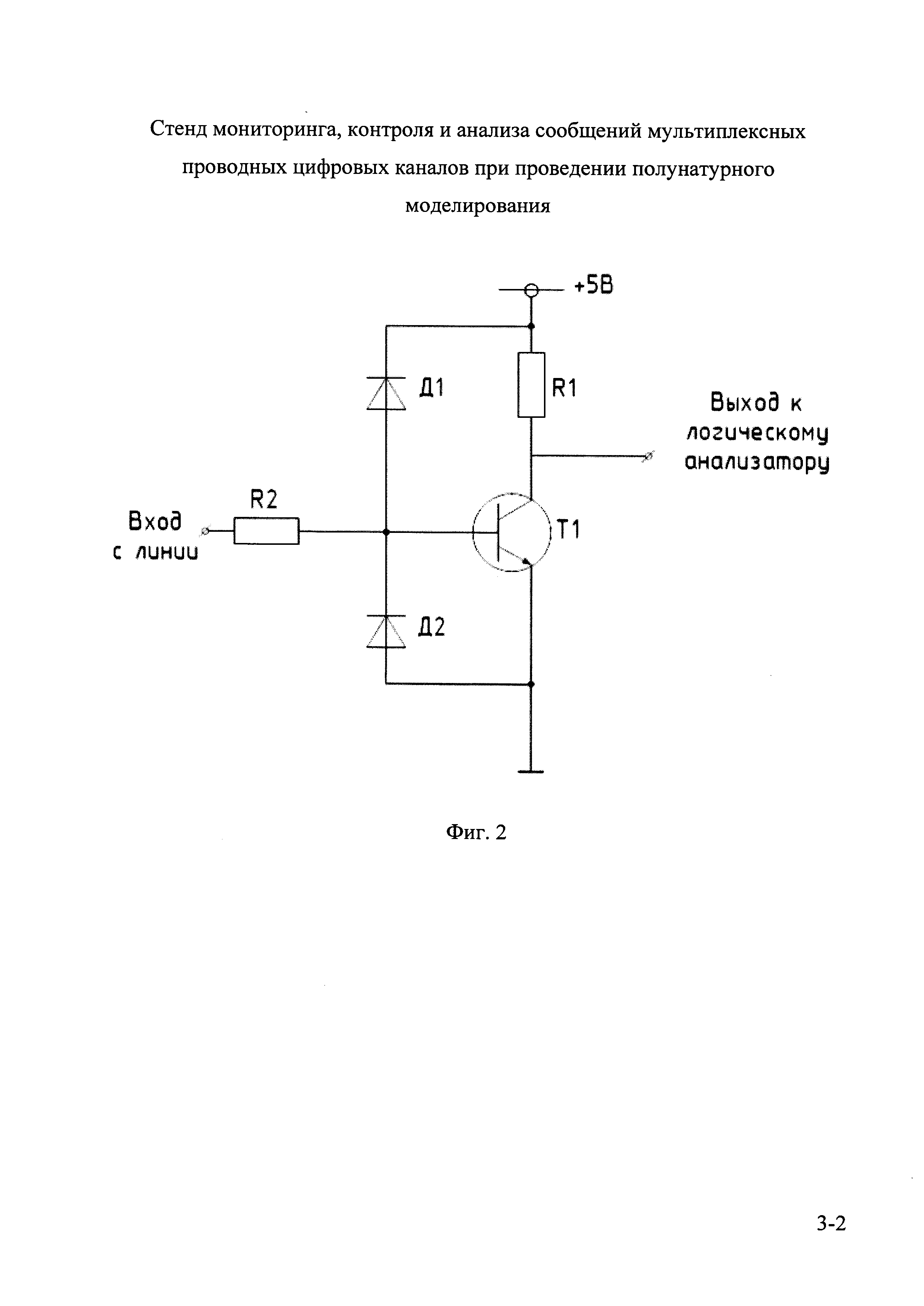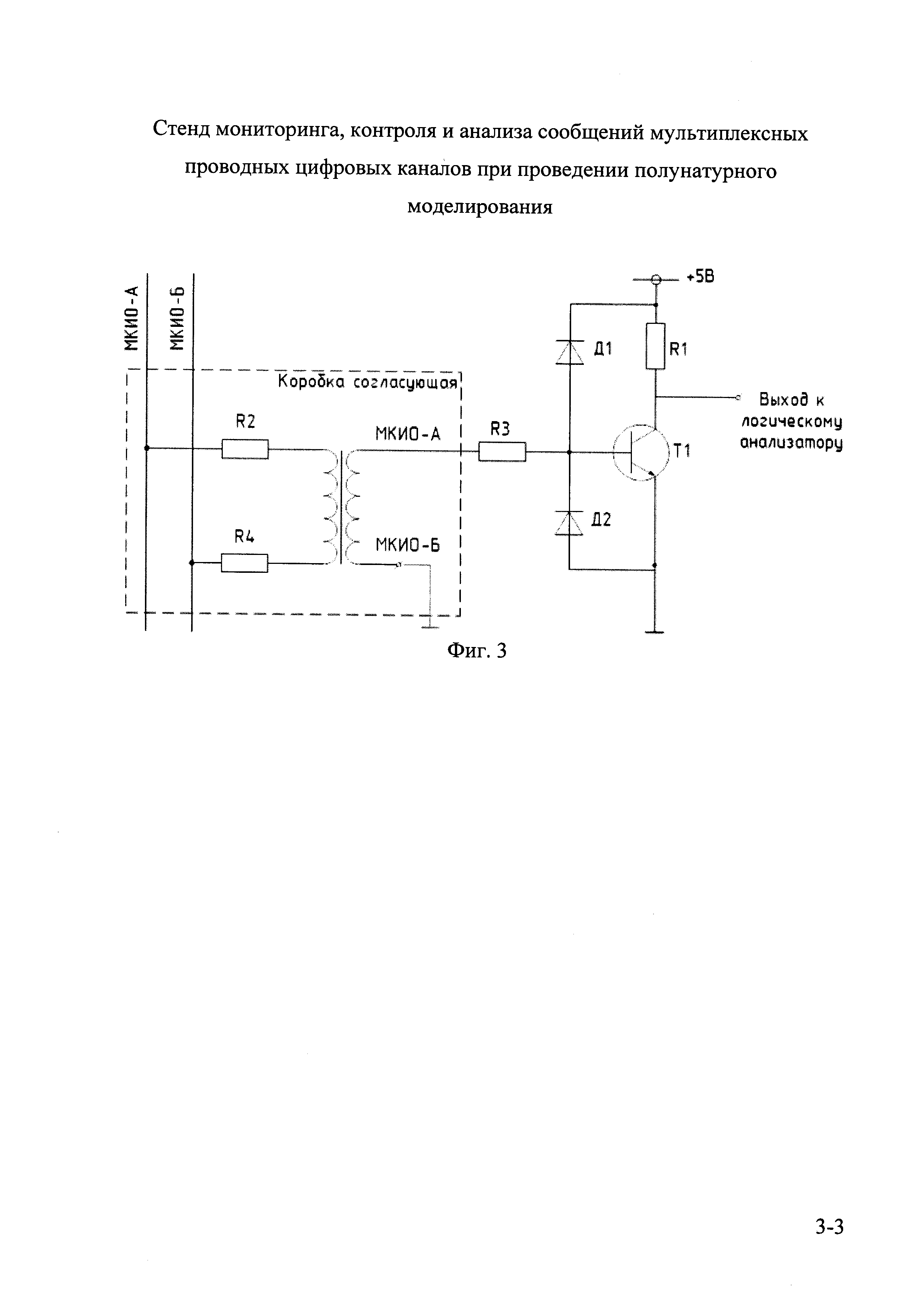 1. Стенд мониторинга, контроля и анализа сообщений мультиплексных проводных цифровых каналов при проведении полунатурного моделирования, характеризующийся тем, что в его составе имеется преобразователь уровня электрических характеристик сигналов, логический анализатор общего назначения, а также персональный компьютер, причем вход преобразователя уровня связан с линией передачи данных цифрового мультиплексного канала, служащего объектом мониторинга, анализа и контроля, выход указанного преобразователя подключен ко входу указанного логического анализатора, а выход указанного логического анализатора связан с указанным персональным компьютером двунаправленной линией передачи данных. 2. Стенд по п. 1, отличающийся тем, что в его составе также имеется универсальный цифровой осциллограф, отдельно подключаемый к линии передачи данных цифрового мультиплексного канала, служащего объектом мониторинга и контроля. 3. Стенд по п. 1, отличающийся тем, что для мониторинга, анализа и контроля цифрового мультиплексного канала по ГОСТ Р 52070-2003 в его составе также имеется согласующая коробка, содержащую согласующую электрическую цепь на основе трансформатора, вход которой подключают к линии передачи данных упомянутого цифрового мультиплексного канала, а выход подключают ко входу преобразователя уровня из состава предлагаемого стенда. 4 Стенд по п. 1, отличающийся тем, что для мониторинга, анализа и контроля цифрового мультиплексного канала по РТМ 1495-75 в его составе также имеется второй преобразователь уровня, подключаемый к линии передачи данных упомянутого цифрового мультиплексного канала совместно с первым преобразователем уровня так, что вход первого преобразователя уровня подключается к первой дифференциальной линии упомянутого цифрового мультиплексного канала, а вход второго преобразователя уровня подключается ко второй дифференциальной линии упомянутого цифрового мультиплексного канала, а выходы обоих упомянутых преобразователей подключаются, соответственно, к первому и второму каналам логического анализатора из состава предлагаемого стенда.