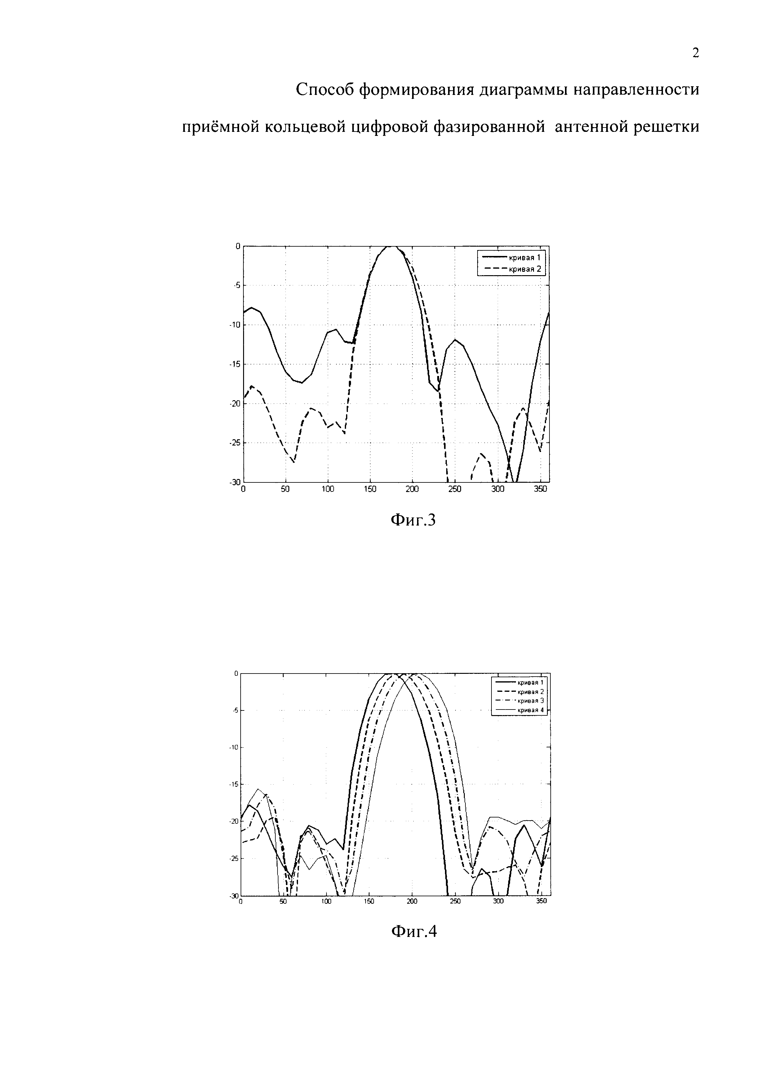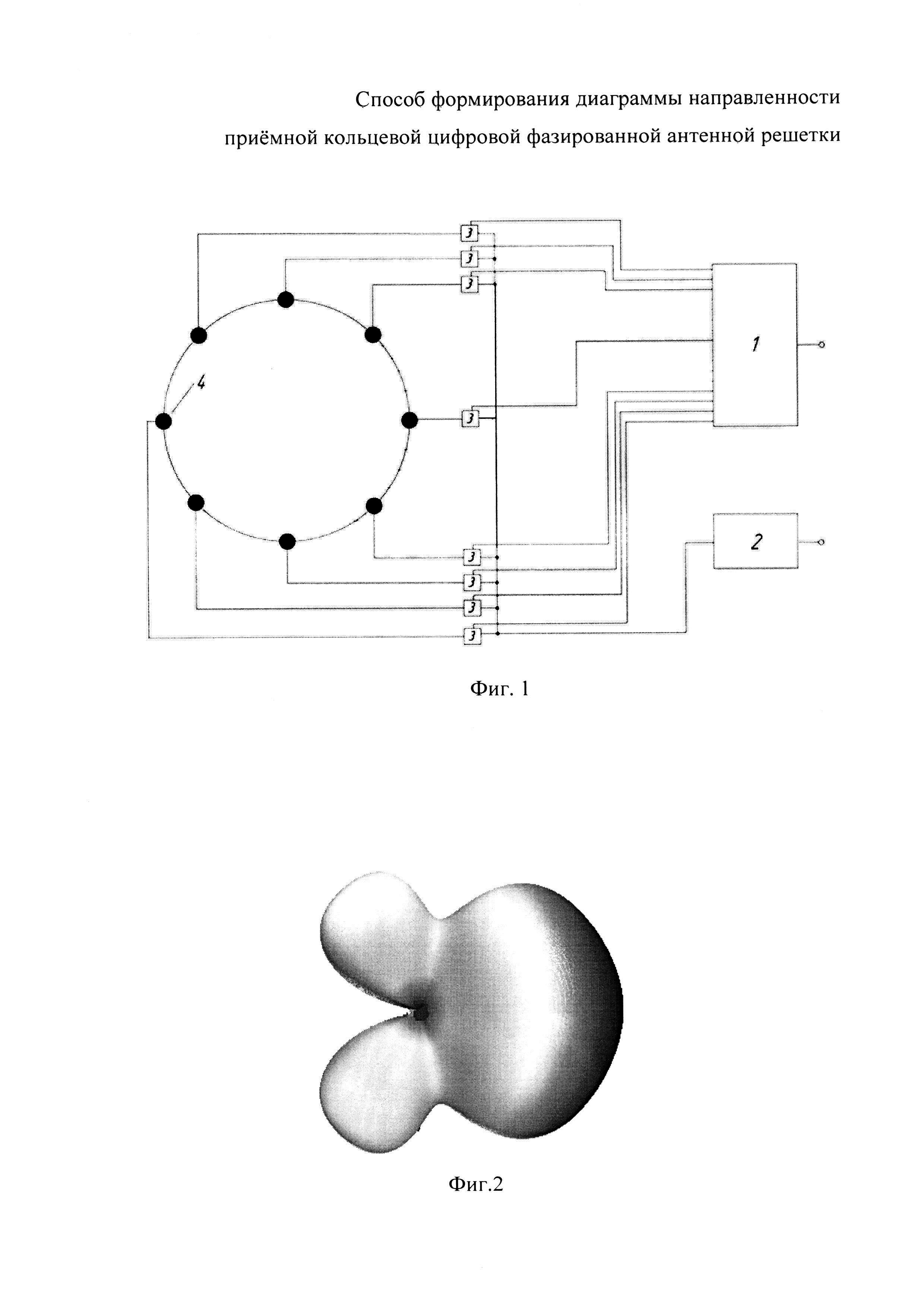Способ формирования диаграммы направленности приемной кольцевой цифровой фазированной антенной решетки, включающий цифровую обработку сигнала, формирование сигналов в соответствии с данными о требуемой диаграмме направленности (ДН) и передачу отдельным приемным трактам сигналов с амплитудно-фазовым распределением, определенным в соответствии с выбранным критерием, отличающийся тем, что амплитуды An и фазы ϕn определяют, оптимизируя два функционала: минимизируя функцию F среднеквадратического отклонения формируемой диаграммы направленности D(ϕ) от заданного распределения поля излучения антенной решетки R(ϕ), характеризующегося заданным уровнем боковых лепестков при данной ширине основного лепестка, и максимизируя функцию G, определяющую отношение сигнал/шум приемной системы, при этом оба функционала используют диаграмму направленности одного излучателя с учетом взаимного влияния элементов.
