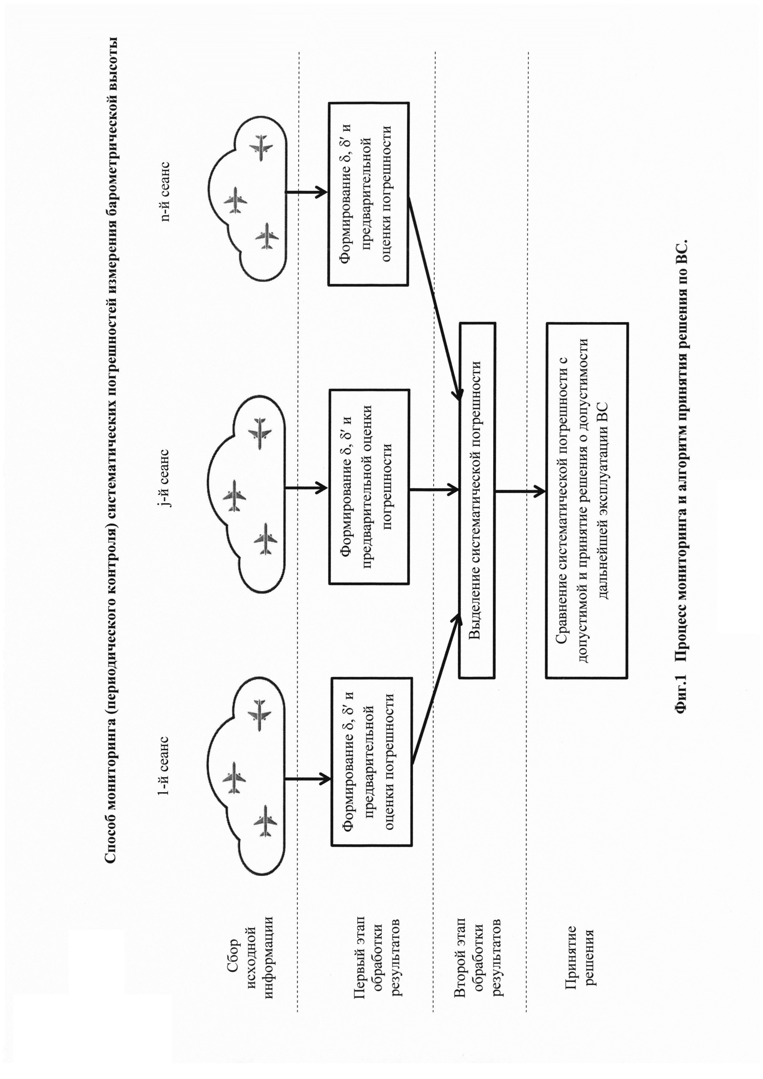 1. Способ мониторинга (периодического контроля) систематических погрешностей измерения барометрической высоты на парке самолетов, оборудованных штатными измерителями барометрической высоты, спутниковыми навигационными приемниками, а также передатчиками, например, системы автоматического зависимого наблюдения вещательного типа (АЗН-В), при полетах в воздушном пространстве с сокращенными минимумами вертикального эшелонирования, заключающийся в том, что выделяют область пространства для мониторинга, с бортов воздушных судов (ВС), находящихся в заданной области пространства, вещают данные о горизонтальных координатах, геометрической и барометрической высоте, переданная информация принимается наземной радиостанцией, на наземной радиостанции для каждого ВС с помощью вычислительного комплекса определяют разность геометрической и барометрической высоты, проводят статистическую обработку полученных данных и определяют погрешность измерения барометрической высоты на ВС, отличающийся тем, что весь объем данных, полученных в выделенной области пространства, разделяется на сеансы наблюдений, каждый из которых определен в пространстве и времени; на первом этапе производится предварительная оценка систематической погрешности измерения барометрической высоты, заключающаяся в следующем: по полученным наземной радиостанцией в заданном диапазоне высоты и горизонтальных координат данным строится зависимость разностей между геометрической и барометрической высотой для всех наблюдаемых самолетов в функции координат и времени; для каждого ВС в каждом сеансе наблюдения определяется разность между разностью геометрической и барометрической высот для ВС и ожидаемой разностью, определенной по полученной функциональной зависимости; на втором этапе - для каждого ВС отбираются сеансы с его участием и по результатам статистической обработки предварительных оценок погрешности выделяется систематическая составляющая погрешности измерения барометрической высоты, которая сравнивается с сравнивается с заданным порогом; ВС, для которых заданный порог погрешности превышен, признаются непрошедшими проверку. 2. Способ мониторинга (периодического контроля на) систематических погрешностей измерения барометрической высоты по п. 1, отличающийся тем, что в заданную область пространства включаются несколько зон с размещенными них наземными радиостанциями, расположенными на любом расстоянии друг от друга, а данные, полученные в сеансах для разных зон, объединяются для совместной обработки и определения систематической погрешности измерения барометрической высоты.