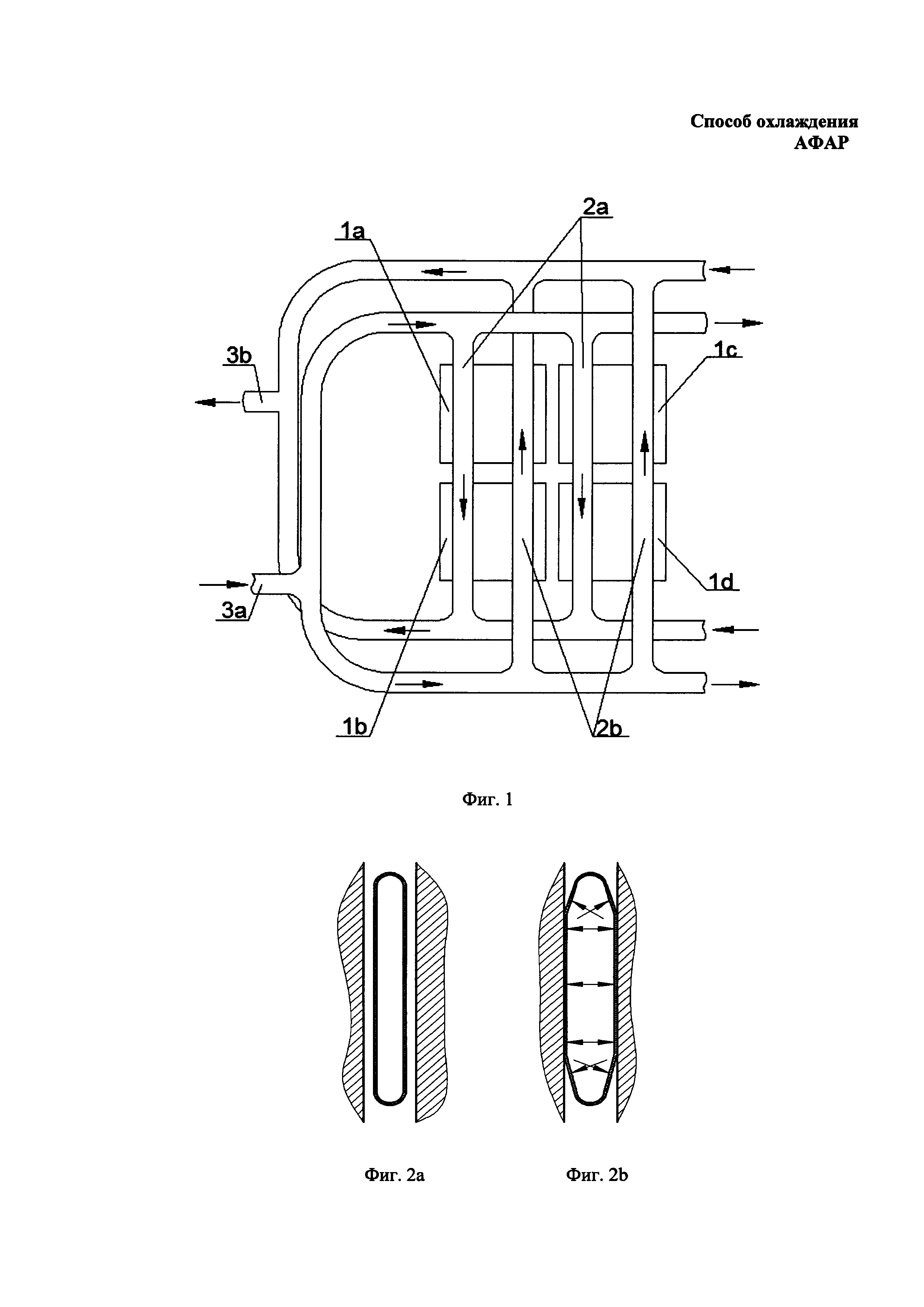 Изобретение относится к области радиолокационной техники и может быть использовано при проектировании и изготовлении активной фазированной антенной решетки (АФАР). В настоящее время используются различные способы охлаждения активных фазированных антенных решеток. Одним из таких способов, получившим широкое применение, является способ охлаждения, основанный на использовании испарительных систем охлаждения (см., например, Крахин О.И., Радченко В.П. «Проблема теплоотвода приемо-передающих модулей и АФАР с высоким уровнем теплового излучения», III Всероссийская конференция «Радиолокация и радиосвязь» - ИРЭ РАН, 26-30 октября 2009). Недостатки известного способа состоят в сложности его реализации. Кроме этого, известны способы охлаждения активных фазированных антенных решеток, включающие размещение охлаждающих средств, имеющих каналы, в контакте с внешней поверхностью стенки корпуса каждого из приемо-передающих модулей, входящих в состав АФАР, и осуществление циркуляции в каналах жидкой среды. В известных способах в качестве охлаждающих средств, как правило, используют жидкостные панели (см., например, Савенко В.А. «Унификация конструкторских решений для построения приемо-передающих модулей АФАР различных диапазонов», Электроника и микроэлектроника СВЧ, Всероссийская конференция, Санкт-Петербург, 3-6 июня 2013). Недостатки известных способов состоят в том, что при их реализации не обеспечивается интенсивное равномерное отведение тепла с поверхности корпусов приемо-передающих модулей, входящих в состав АФАР. Подобный способ принят в качестве ближайшего аналога заявленного способа. Задачей заявленного изобретения является создание способа охлаждения активной фазированной антенной решетки, лишенного указанных недостатков. В результате достигается технический результат, заключающийся в обеспечении интенсивного равномерного отведения тепла с поверхностей корпусов приемо-передающих модулей, входящих в состав АФАР, и, следовательно, интенсивного охлаждения АФАР в целом при ее эксплуатации. Конкретно, указанный технический результат достигается посредством осуществления способа охлаждения активной фазированной антенной решетки (АФАР), включающего размещение охлаждающих средств, имеющих каналы, в контакте с внешней поверхностью стенки корпуса каждого из приемо-передающих модулей, входящих в состав АФАР, и осуществление циркуляции в каналах жидкой среды. В промежутке между боковой стенкой корпуса каждого из приемо-передающих модулей, входящих в состав каждого ряда АФАР, и элементом несущей конструкции полотна АФАР с суммарным зазором, составляющим от 0,1 до 0,5 мм, в зонах, соответствующих расположению тепловыделяющих элементов каждого из приемо-передающих модулей, размещают две трубы, по существу, эллиптического поперечного сечения. В трубы в противоположных направлениях подводят охлажденную жидкую среду. Каждую из труб выполняют из материала, имеющего возможность упругой деформации под давлением жидкой среды, обеспечивающей прижатие каждой из труб к внешней поверхности боковой стенки корпуса каждого из приемо-передающих модулей с толщиной стенки, по меньшей мере, в зоне прижатия составляющей от 0,2 до 0,35 мм. Циркуляцию жидкой среды осуществляют со скоростью, обеспечивающей разность температур между внутренн
