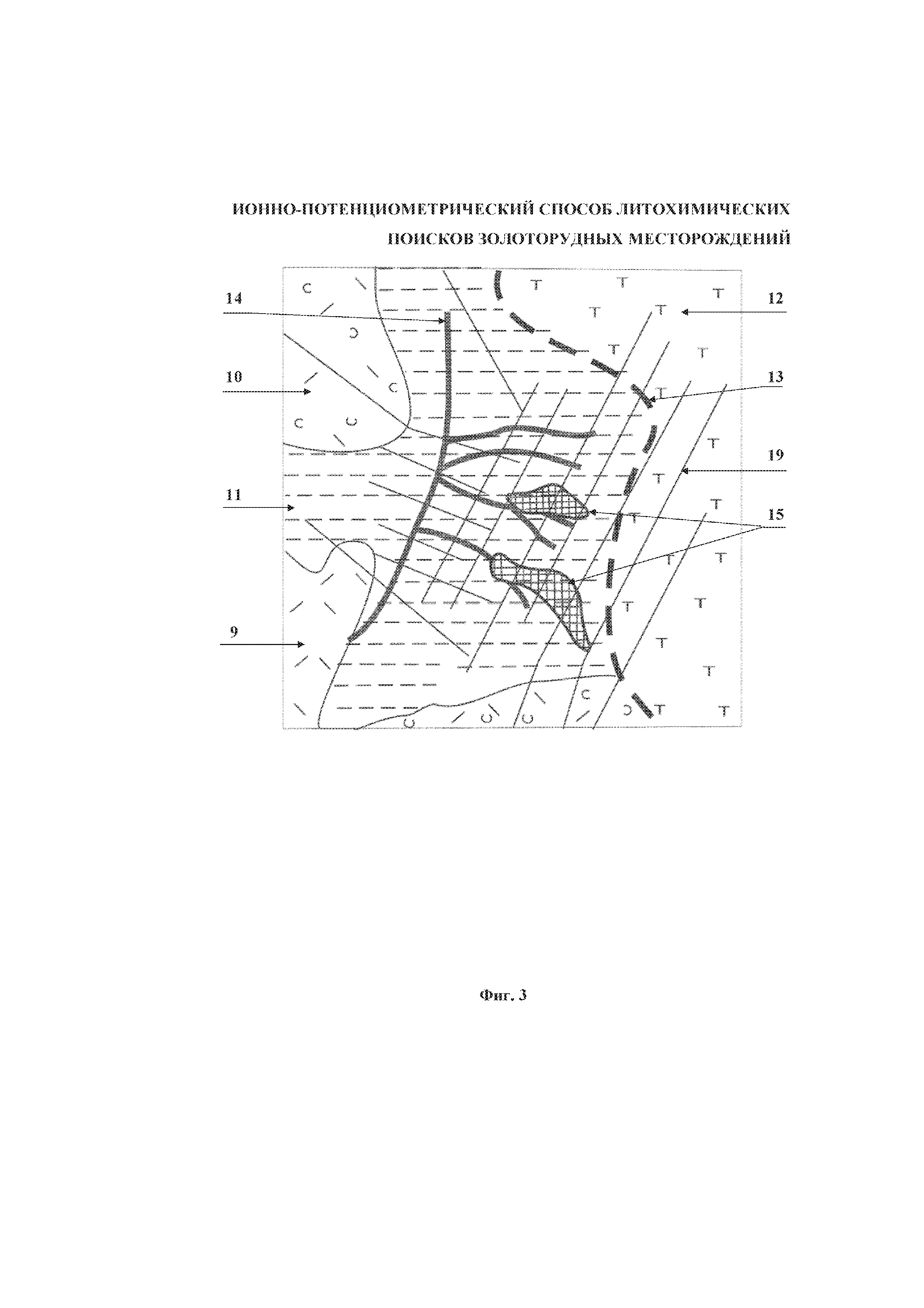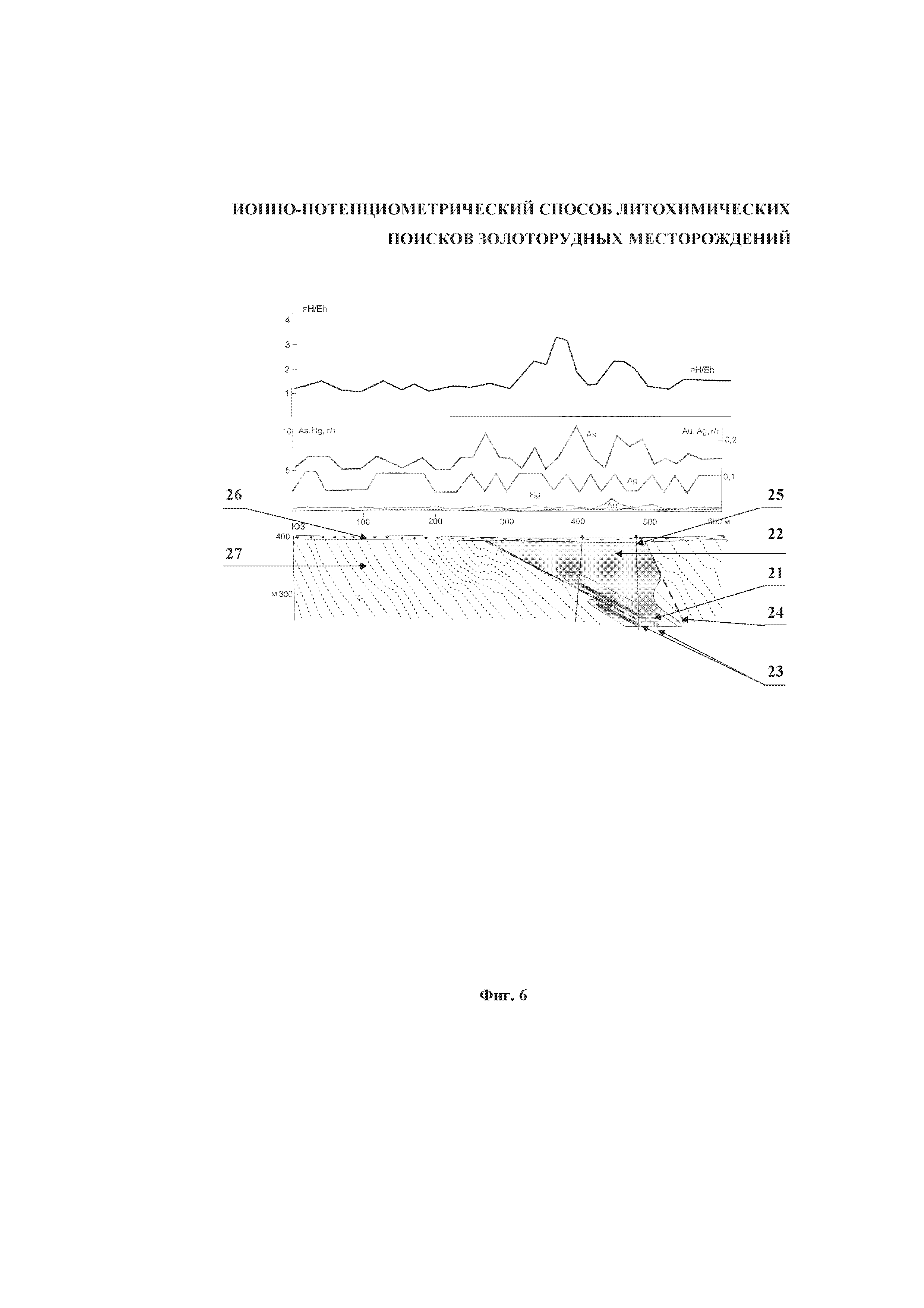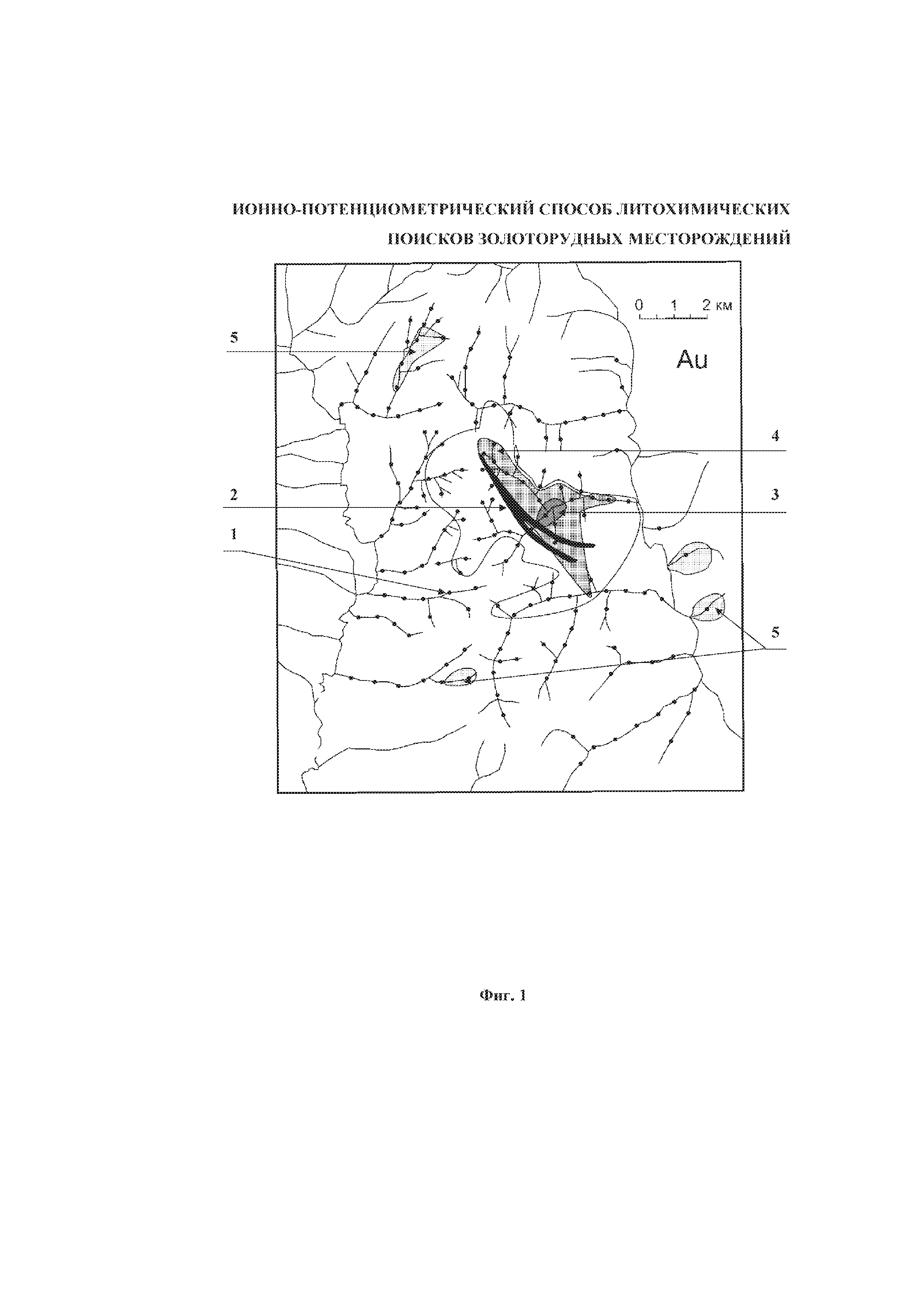 Изобретение относится к способам физико-химического анализа суспензий, приготовленных из почвенных проб, и может быть использован при поисках месторождений полезных ископаемых. Известен «НАНОТЕХНОЛОГИЧЕСКИЙ СПОСОБ ОПРЕДЕЛЕНИЯ НАЛИЧИЯ И КОЛИЧЕСТВЕННОГО СОДЕРЖАНИЯ РЕДКИХ И РАССЕЯННЫХ ХИМИЧЕСКИХ ЭЛЕМЕНТОВ В ГОРНЫХ ПОРОДАХ, РУДАХ И ПРОДУКТАХ ИХ ПЕРЕРАБОТКИ» RU 2370764 [2], основанный на химическом анализе пробы, химическому анализу подвергают раствор, приготовленный из пробы исследуемых объектов горных пород и деионизированной воды, который проводят методом масс-спектрометрии и одновременно на определение их количественного содержания, при достижении величин пределов обнаружения, мкг/л: 0.01 (Au), 0.02 (Pt), 0.03 (Pd), 0.005 (Ag), 0.005 (Rh), 0.02 (Ru), 0.006 (Ir), 0.006 (Re), 0.003 (Tl), 0.03 (Cd), 0.04 (Hg), 0.1 (Те), 0.01 (Sb), 0.06 (As), 0.03 (Ge), 0.01(Ga), 0.03 (Mo), 0.03 (W), 0.001 (U), 0.6 (Se), 0.005 (Bi), 0.01 (In), 0.03 (Sc). Недостатком устройства является высокая трудоемкость способа и чрезмерное количество данных для обработки. Наиболее близким техническим решением является «Способ определения металлогенической специализации кор выветривания» RU 2065187 [1], включающий отбор почвенных проб, физико-химический (лабораторный) анализ проб, определения в них концентрации элементов-индикаторов. Недостатком является высокая трудоемкость и низкая скорость проведения анализов, низкая воспроизводимость, низкая релевантность при интерпретации результатов. Техническим результатом предлагаемой полезной модели является уменьшение трудоемкости и повышение скорости (экспрессности) проведения анализов, повышение воспроизводимости анализов, повышение релевантности результатов. Технический результат достигается тем, что ионно-потенциометрический способ литохимических поисков золоторудных месторождений, включающий отбор почвенных проб, физико-химический (лабораторный и полевой) анализ проб, характеризуется тем, что для каждой пробы определяются потенциалы pH и Eh, значения которых используются для дальнейшего графического анализа. Графический анализ может проводиться, например, путем сопоставления значений pH и Eh по результатам лабораторного и полевого анализа проб в соответствующих точках наблюдения, выделения аномальных значений с отрисовкой изолиний и построением графиков и т.д. Пробы возможно высушивать до воздушно сухого состояния, просеивать через сито 0,25 мм, готовить почвенную (породную) суспензию из фракции менее 0,25 мм путем смачивания пробы дистиллированной водой в соотношении 1:1 (20 г пробы на 20 мл воды) при Т=25 ºС, после перемешивания суспензию отправляют на анализ. Указанный способ позволяет минимизировать погрешности воспроизводимости анализа за счет уменьшения влияния погодных условий при отборе проб. Для графического анализа может использоваться нормированный по фону показатель pH/Eh, обладающий высокой релевантностью и информационной способностью. Измерения возможно производить в лаборатории ионоселективными электродами и непосредственно на месте отбора проб портативными pH-Eh-мерами, что позволит дополнительно снизить влияние помех на результат и повысить релевантность результатов. Область применения. Поиски золоторудных месторождений в различных геологических и ландшафтно-геохимических условиях, в том числе скрытых месторождений залегающих на глубинах 150-200 м от дневной поверхности, а также п