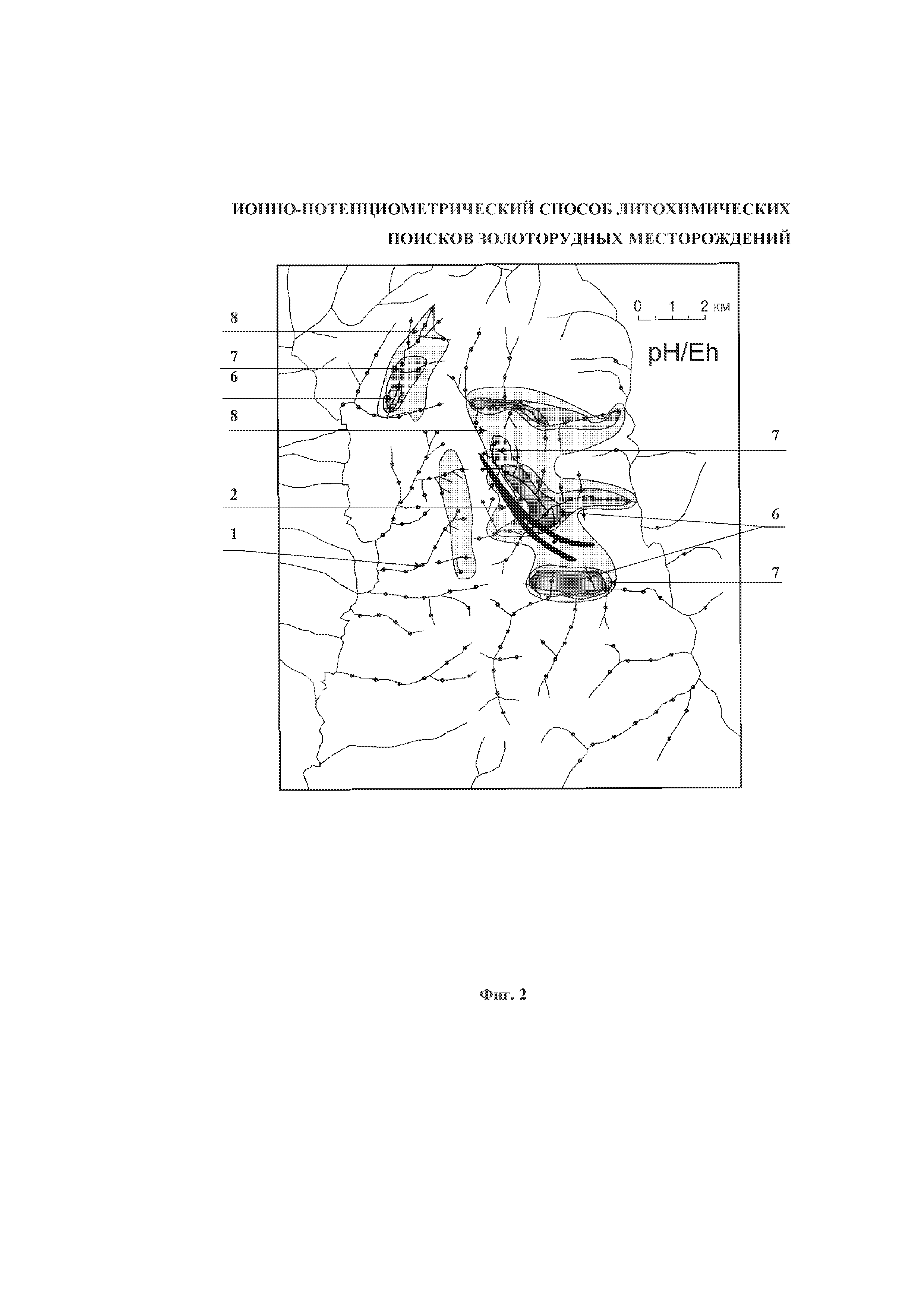 Ионно-потенциометрический способ литохимических поисков золоторудных месторождений, включающий отбор почвенных проб, физико-химический анализ проб, определение для каждой пробы потенциалов рН и Eh, значения которых используют для дальнейшего графического анализа, причем пробы высушивают до воздушно-сухого состояния и просеивают через сито 0,25 мм, готовят породную суспензию из фракции менее 0,25 мм путем смачивания пробы дистиллированной водой в соотношении 1:1 по весу при Т=25°С, после перемешивания суспензию отправляют на анализ, для графического анализа используют нормированный по фону показатель pH/Eh, измерения производят ионоселективными электродами, причем лабораторные измерения производят непосредственно на месте отбора проб портативными рН и Eh-метрами, причем оценка аномалий слагается из трех последовательных операций: 1) предварительная классификация аномалий по типам и ожидаемой степени перспективности; 2) геологический осмотр аномалий на местности с контрольно-детализационным пробоотбором; 3) окончательная оценка аномалии с рекомендациями по производству дальнейших работ или ее обоснованная отбраковка.