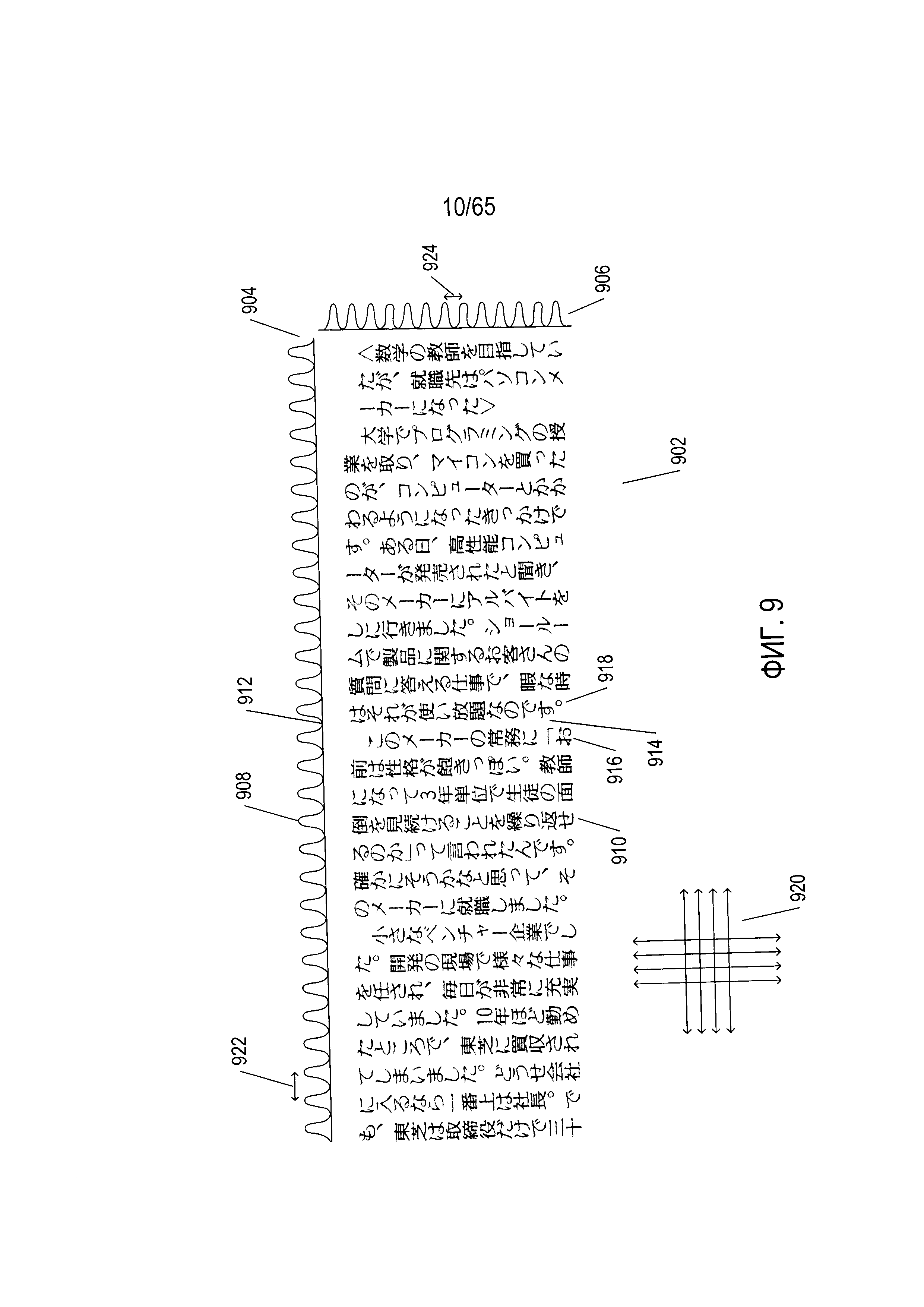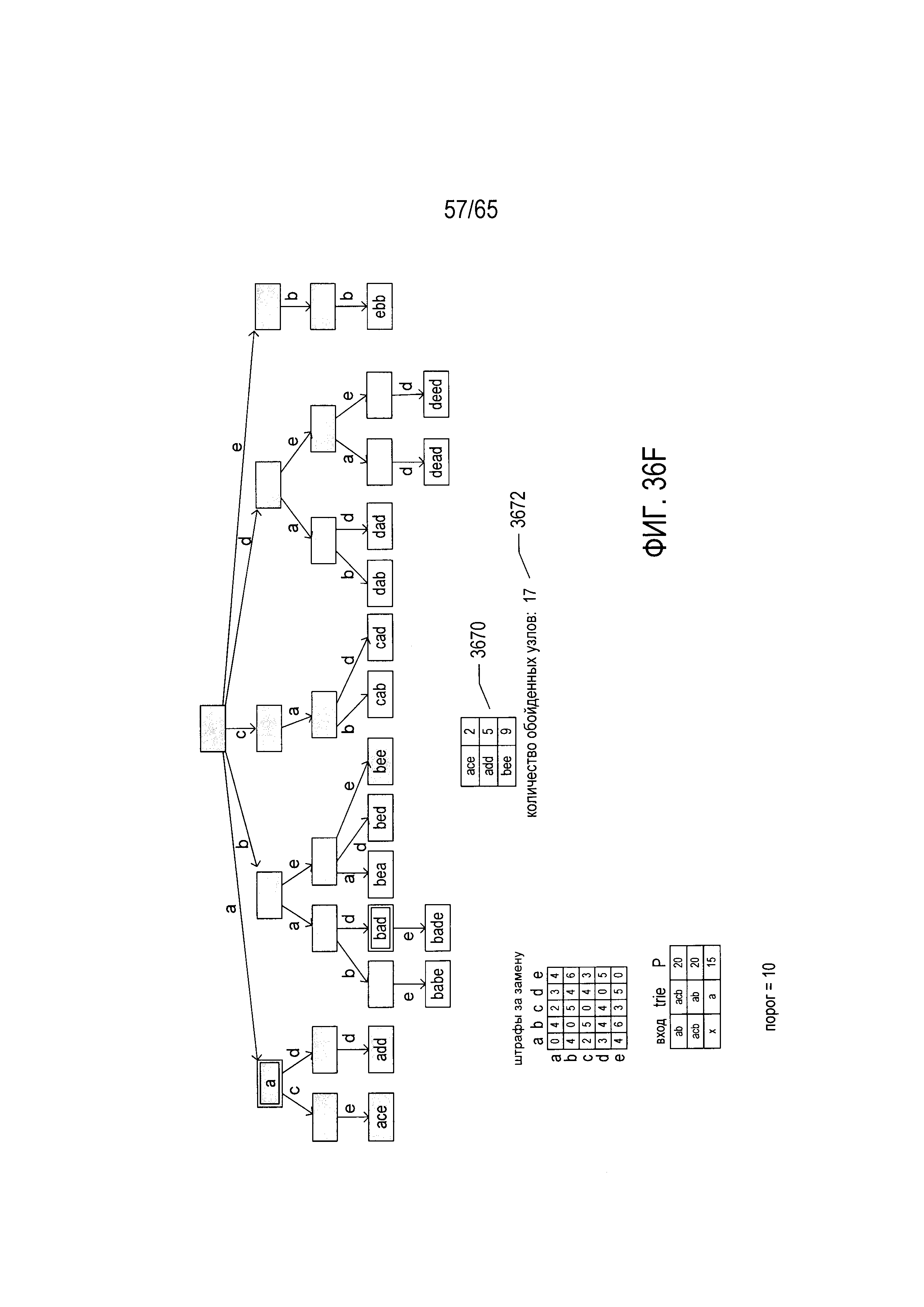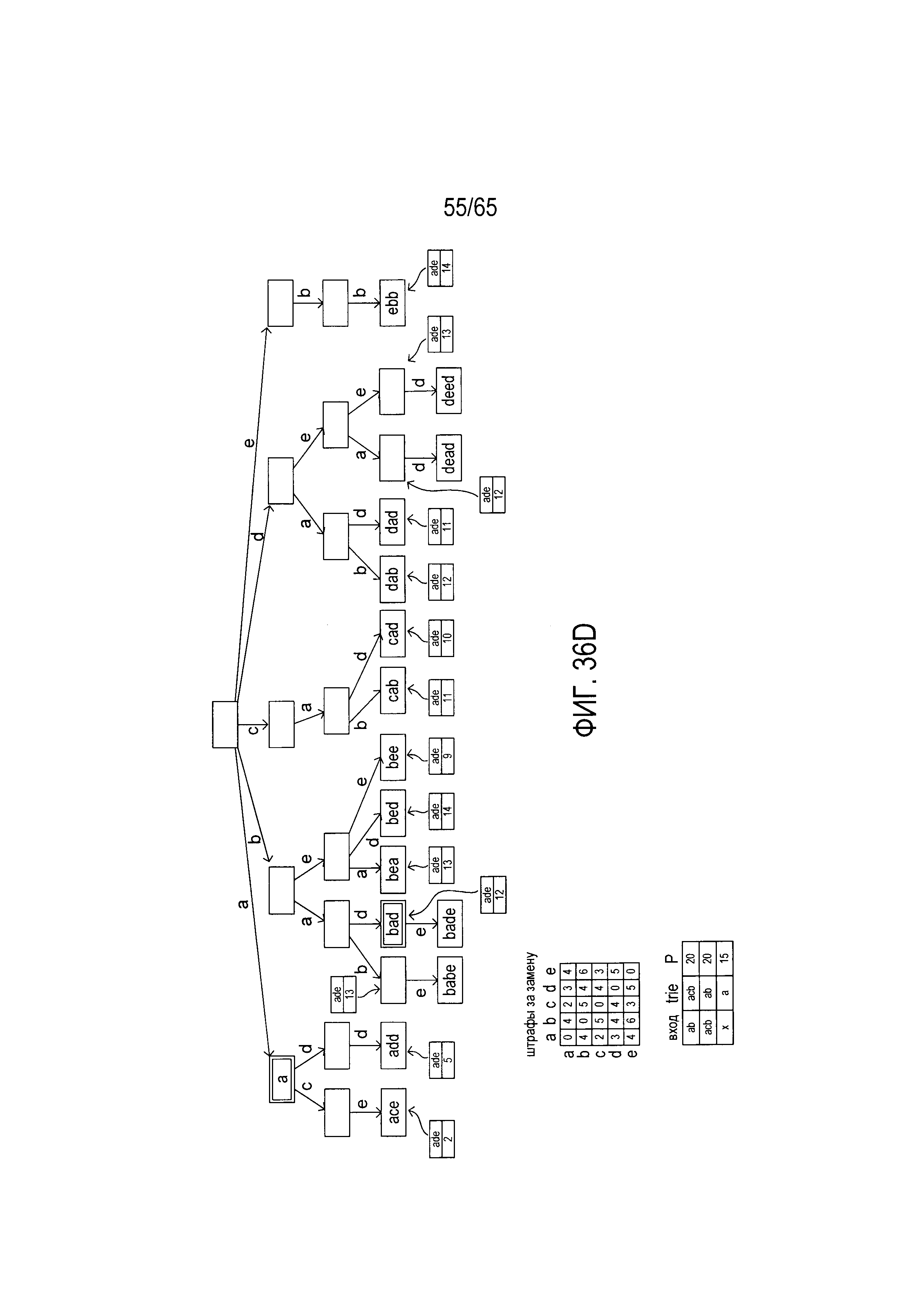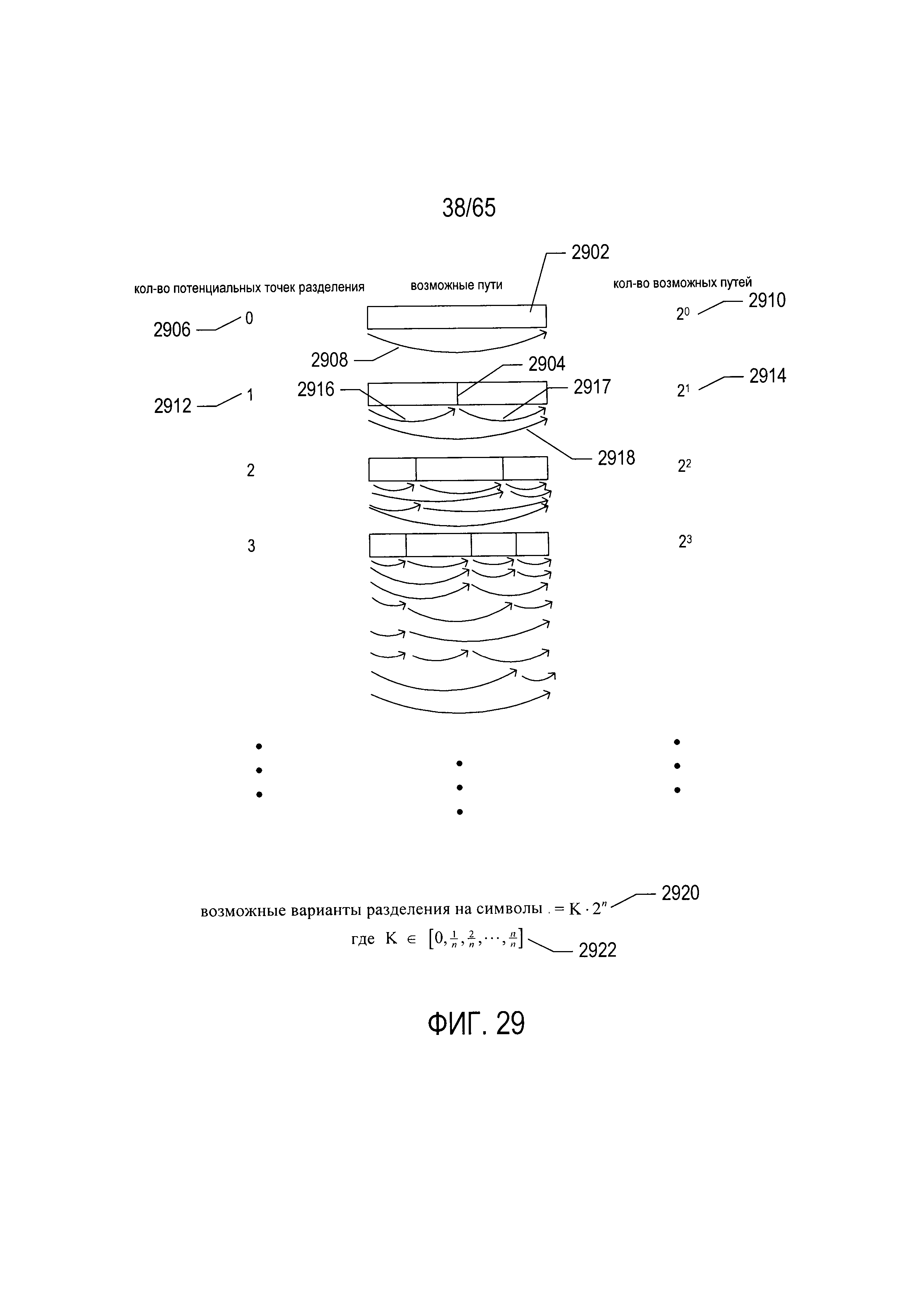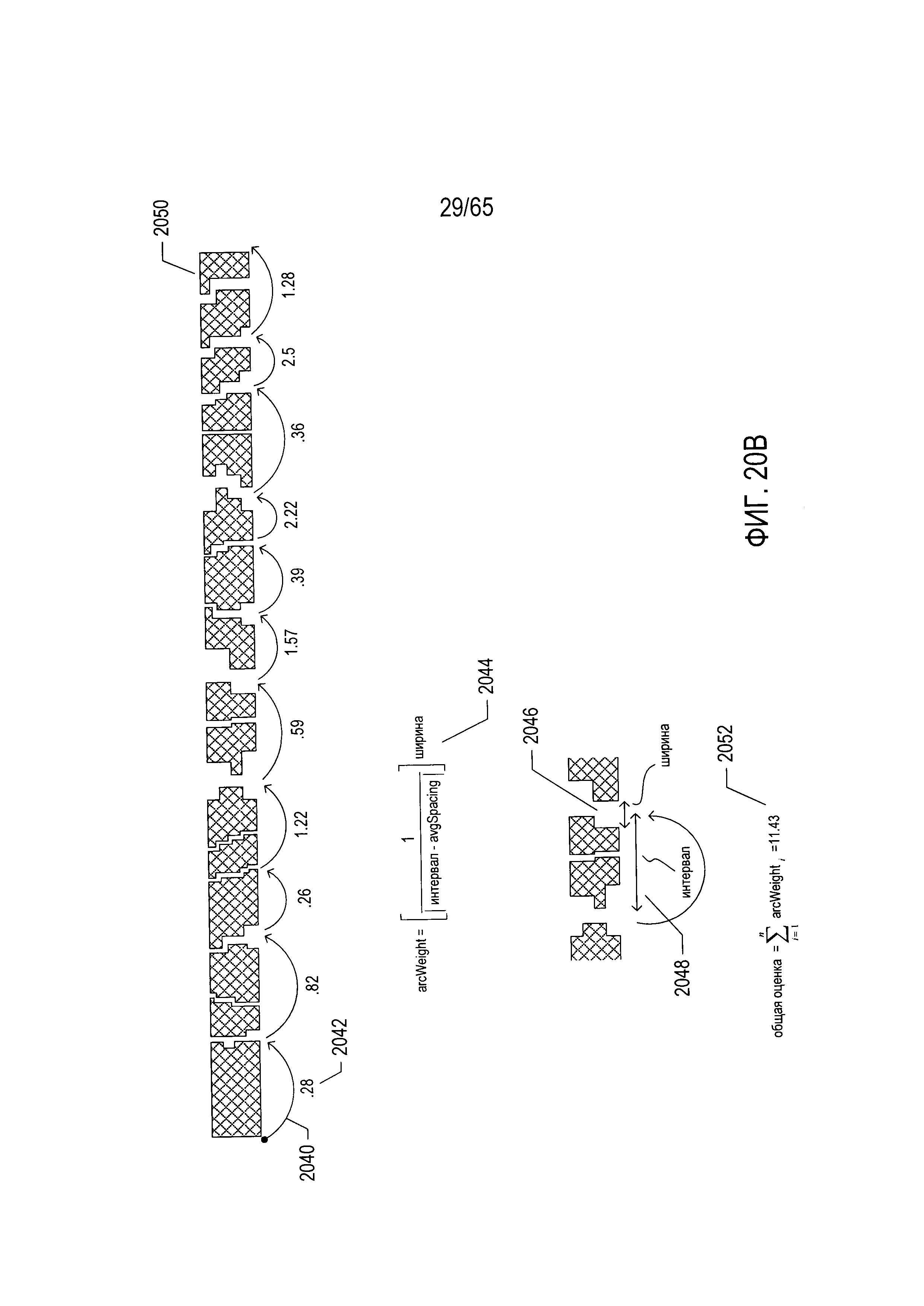 (2922). Постоянная Κ представляет собой процесс отсечения всех возможных путей обхода, осуществляемый в традиционных устройствах OCR, с целью выделения только путей обхода с достаточной вероятностью высокого значения показателей качества. Таким образом, количество вариантов разложения строк текста на символы увеличивается экспоненциально вместе с количеством потенциальных точек разделения символов, идентифицированных в строке текста. Очевидно, что минимизация количества потенциальных точек разделения может существенно снизить вычислительную нагрузку способа OCR и позволит эффективно выполнять задачу OCR, которая в противном случае была бы трудноосуществимой с вычислительной точки зрения. Тем не менее, одно лишь уменьшение количества потенциальных точек разделения символов не решает проблему вычислительной сложности. Напротив, следует не только сократить количество потенциальных точек разделения, но и обеспечить, чтобы в оставшееся после сокращения множество потенциальных точек разделения символов входили потенциальные точки разделения с наиболее высокой вероятностью представления фактических точек разделения символов. В противном случае вычислительная сложность будет снижаться за счет снижения вероятности корректной конвертации изображения текста в соответствующую кодировку текста. Кроме того, устройство и способ настоящего изобретения позволяют избегать образования необоснованных и непродуктивных путей обхода, как описано ниже.