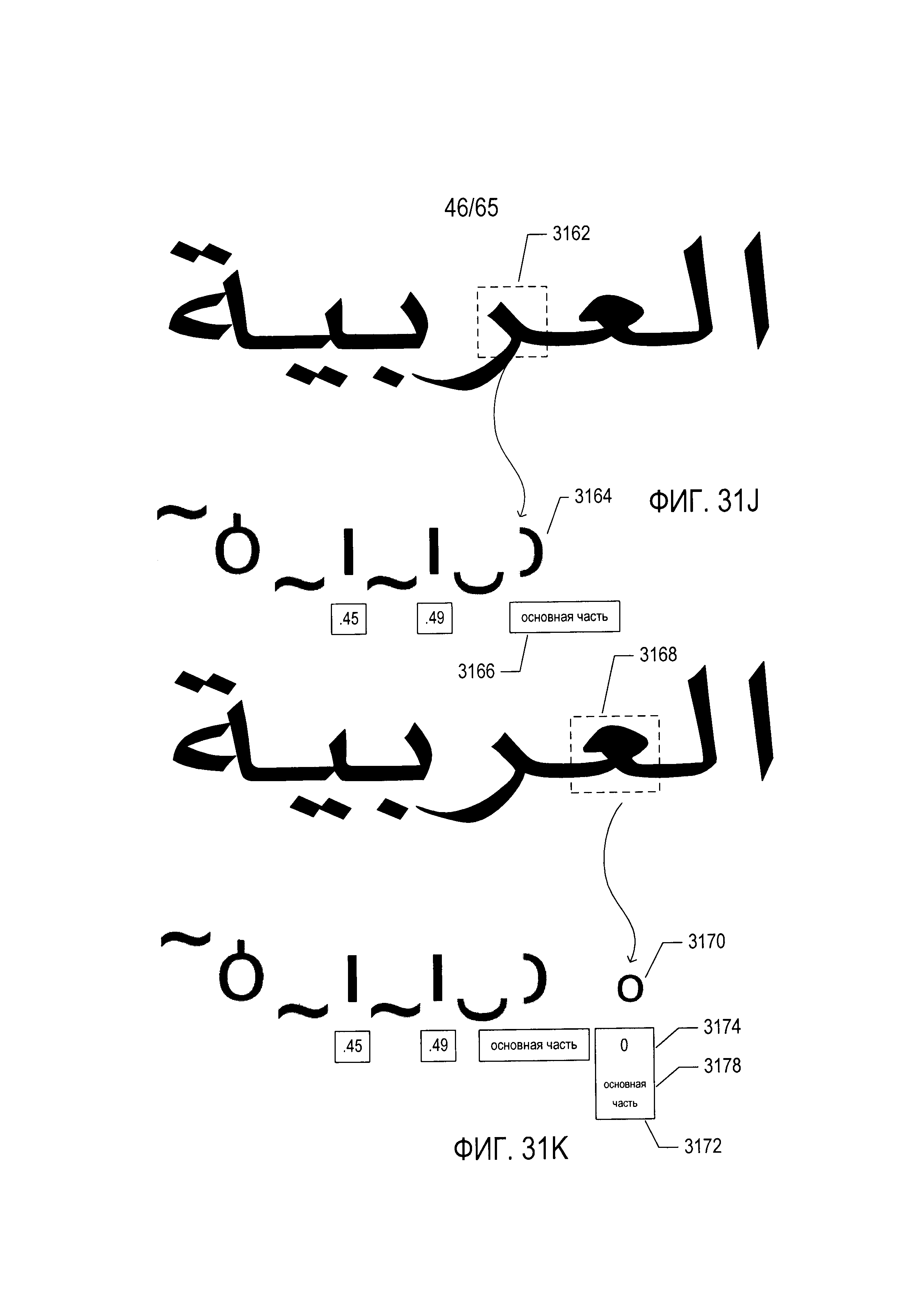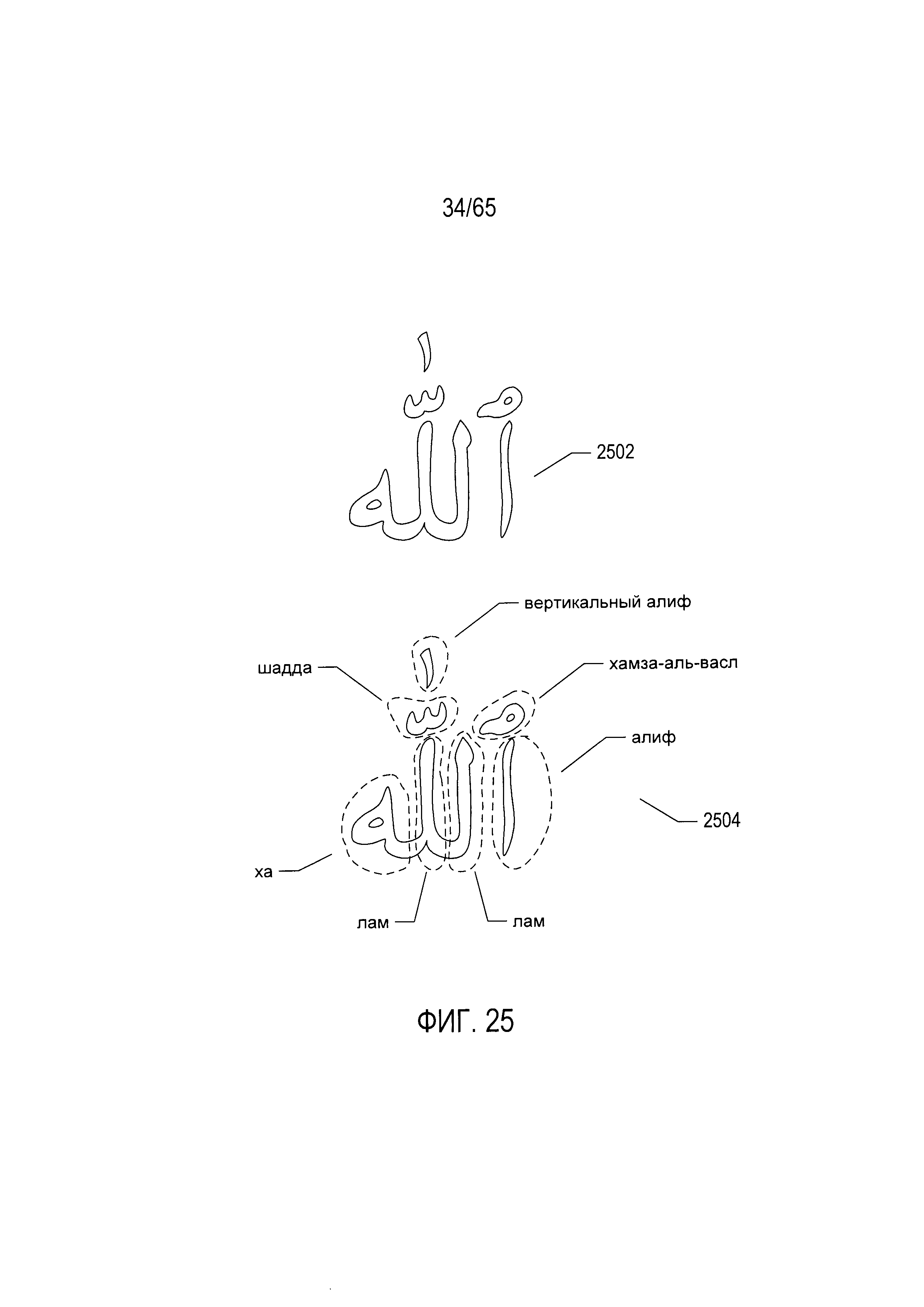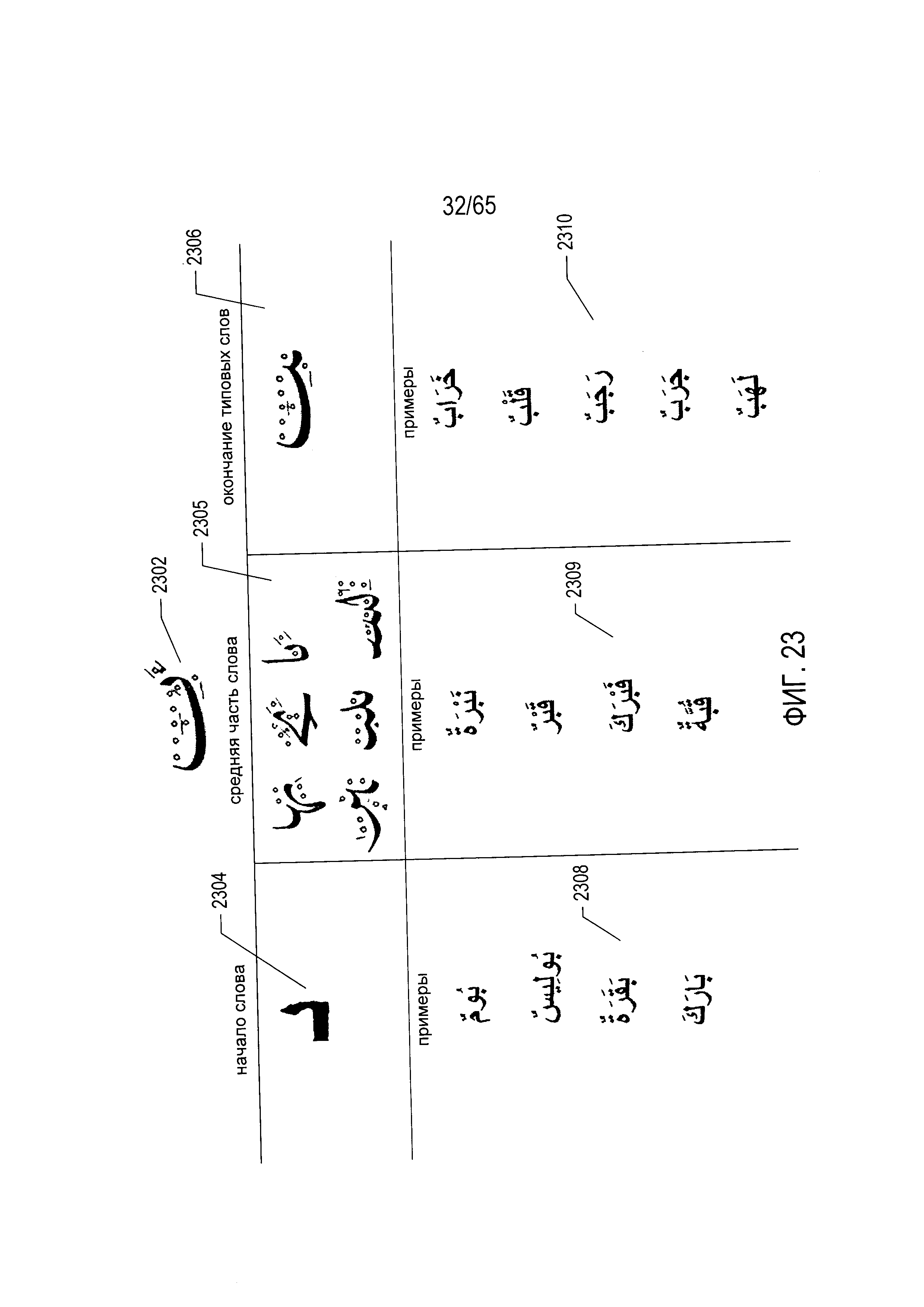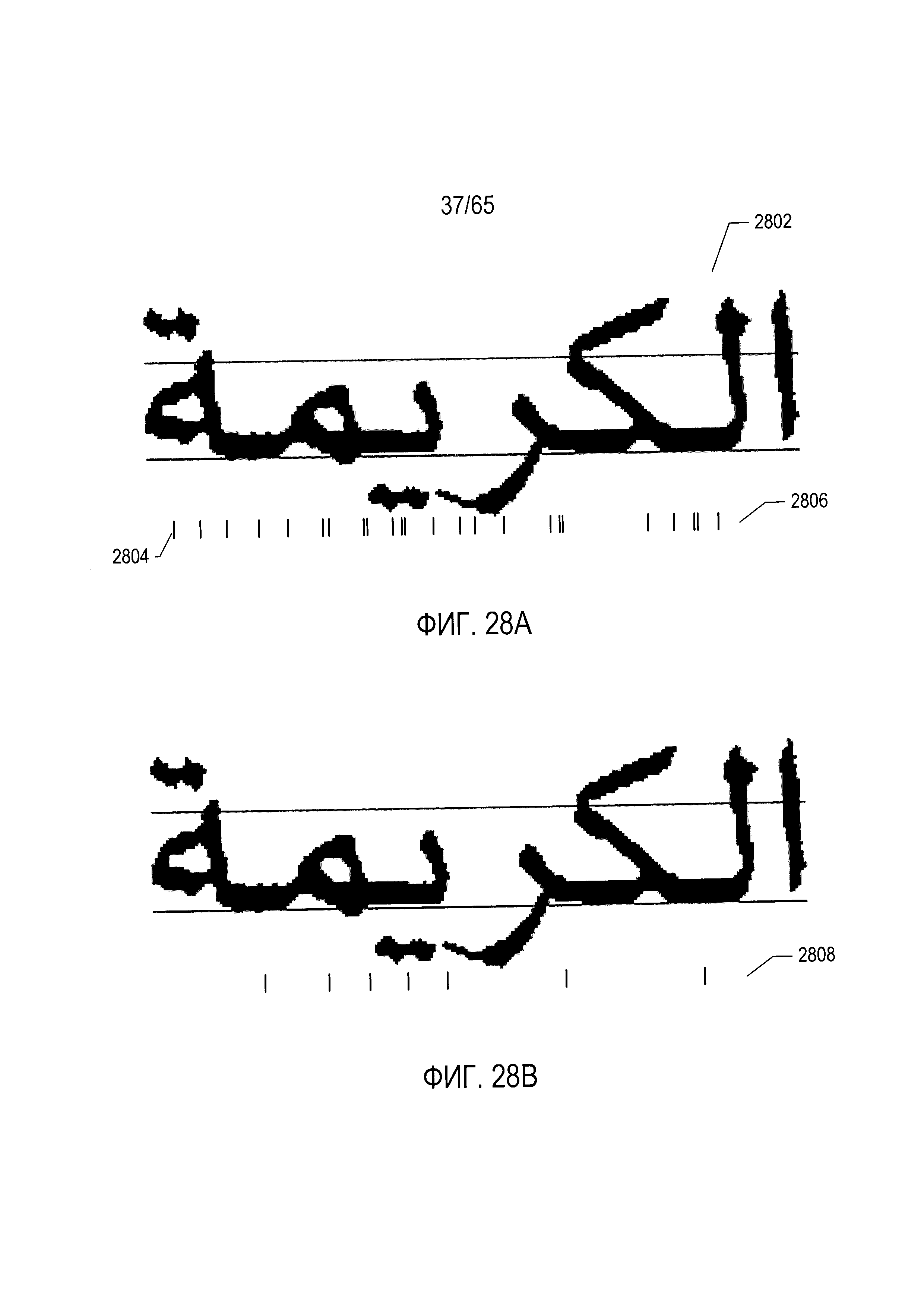 ОБЛАСТЬ ТЕХНИКИ Настоящая заявка относится к автоматической обработке изображений отсканированных документов и других изображений, содержащих текст, а именно к способам и устройствам преобразования изображений документов, содержащих текст на арабском языке, а также текст на других языках, в которых при образовании слов алфавитные символы соединяются вместе в слитную последовательность, в электронные документы. УРОВЕНЬ ТЕХНИКИ Уже на протяжении долгого времени для записи и хранения информации используются печатные, машинописные и рукописные документы. Несмотря на современную тенденцию к отказу от бумажного делопроизводства печатные документы продолжают широко использоваться в коммерческих организациях, учреждениях и домах. С развитием современных компьютерных систем создание, хранение, поиск и передача документов в электронном виде превратилась, наряду с непрекращающимся применением печатных документов, в чрезвычайно эффективный и экономически выгодный альтернативный способ записи и хранения информации. Ввиду многочисленных преимуществ современных средств хранения и передачи информации на основе электронных документов с точки зрения как эффективности, так и экономической выгоды, происходит регулярное преобразование печатных документов в электронные с использованием различных способов и устройств, в том числе преобразование печатных документов в цифровые изображения отсканированных документов с использованием электронных оптико-механических сканирующих устройств, цифровых камер и других устройств и систем с последующей автоматической обработкой изображений отсканированных документов для получения электронных документов, закодированных в соответствии с одним или более всевозможных стандартов кодирования электронных документов. В качестве одного примера, в настоящее время есть возможность использовать настольный сканер и современные программы оптического распознавания символов (OCR), которые, выполняясь на персональном компьютере, позволяют преобразовывать печатный документ в соответствующий электронный документ, который можно просматривать и редактировать с помощью программы обработки текстов. Хотя на текущем этапе своего развития современные программы OCR позволяют автоматически преобразовывать в электронные документы сложные печатные документы, содержащие рисунки, рамки, границы строк и другие нетекстовые элементы, а также текстовые символы множества распространенных алфавитных языков, остаются нерешенными проблемы преобразования печатных документов, содержащих текст на арабском языке и текст на других языках, в которых при образовании слов и их фрагментов символы соединяются в слитную последовательность. РАСКРЫТИЕ ИЗОБРЕТЕНИЯ Настоящая заявка относится к способам и устройствам преобразования изображений документов, содержащих текст на арабском языке и текст на других языках, в которых символы, соединяясь вместе, образуют слитные слова и фрагменты слов, в соответствующие электронные документы. В одном варианте реализации в рамках способа и устройства обработки изображений документов, к которым относится настоящая заявка, применяются многочисленные методы и средства, позволяющие эффективно осуществлять преобразование изображений документов в электронные докум