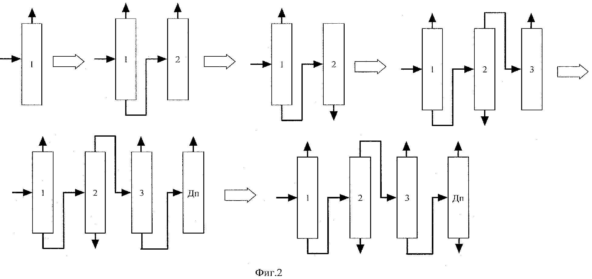 Отбираемый из нижней части первой колонны газовый поток подают в промежуточную по высоте точку следующей колонны, в которой из верхней и нижней частей также осуществляют отборы газовых потоков, каждый