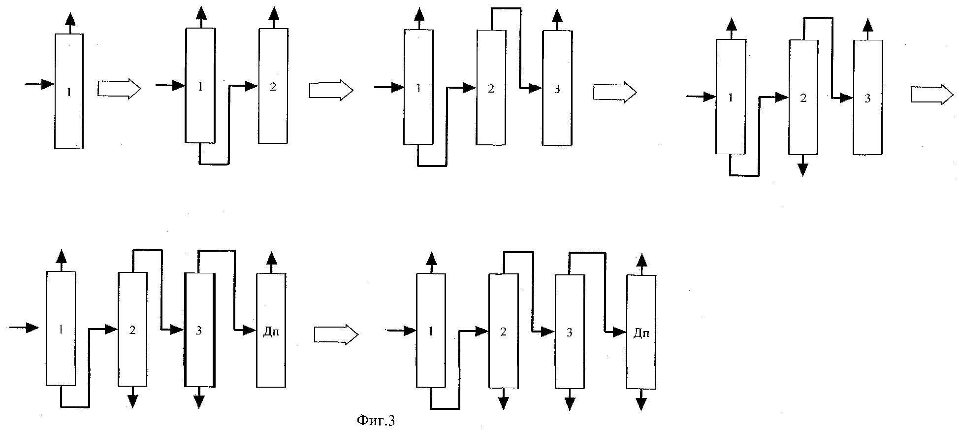 потока из верхней части второй колонны подают в промежуточную по высоте точку третьей колонны с запаздыванием после его начала, а отбор газового потока из верхней части третьей колонны начинают
