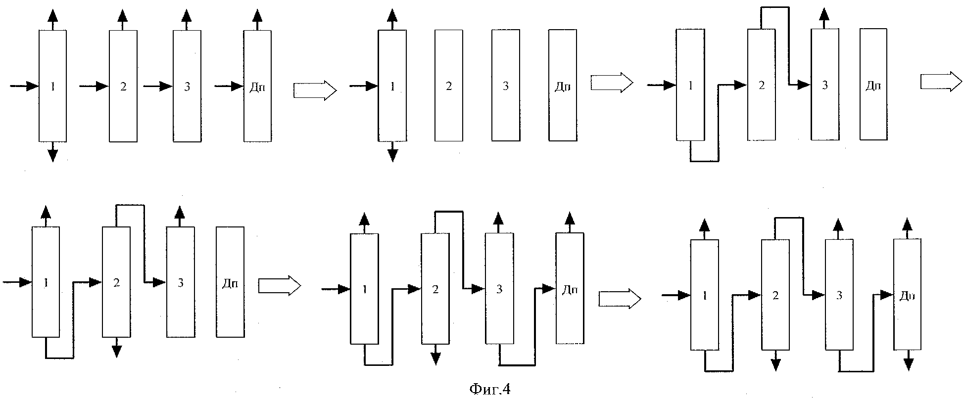 дополнительной колонны, после чего с различными задержками по времени начинают отбор газового потока из верхней части первой колонны и отборы газового потока из нижних частей второй, третьей и