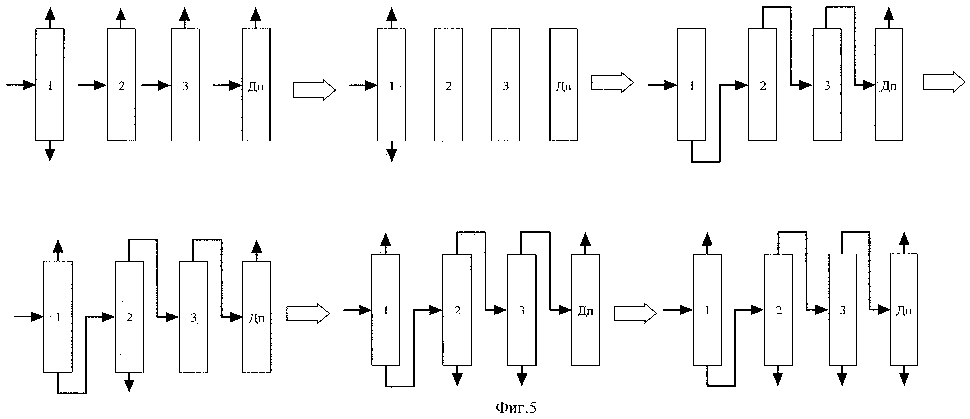 отборы газовых потоков из нижних частей всех колонн начинают с запаздыванием относительно отборов газовых потоков из их верхних частей (использование п.1. формулы изобретения). В первой колонне время