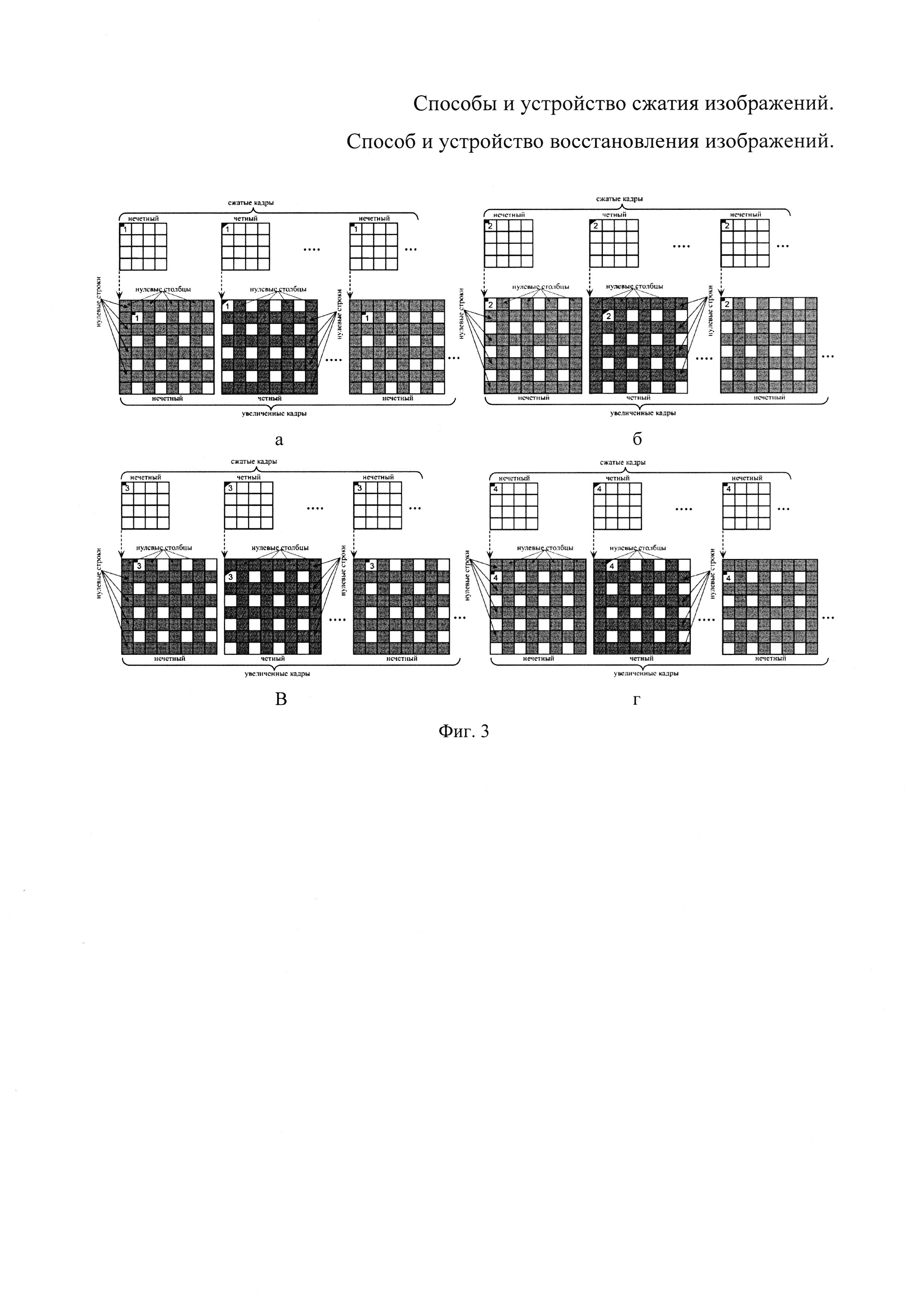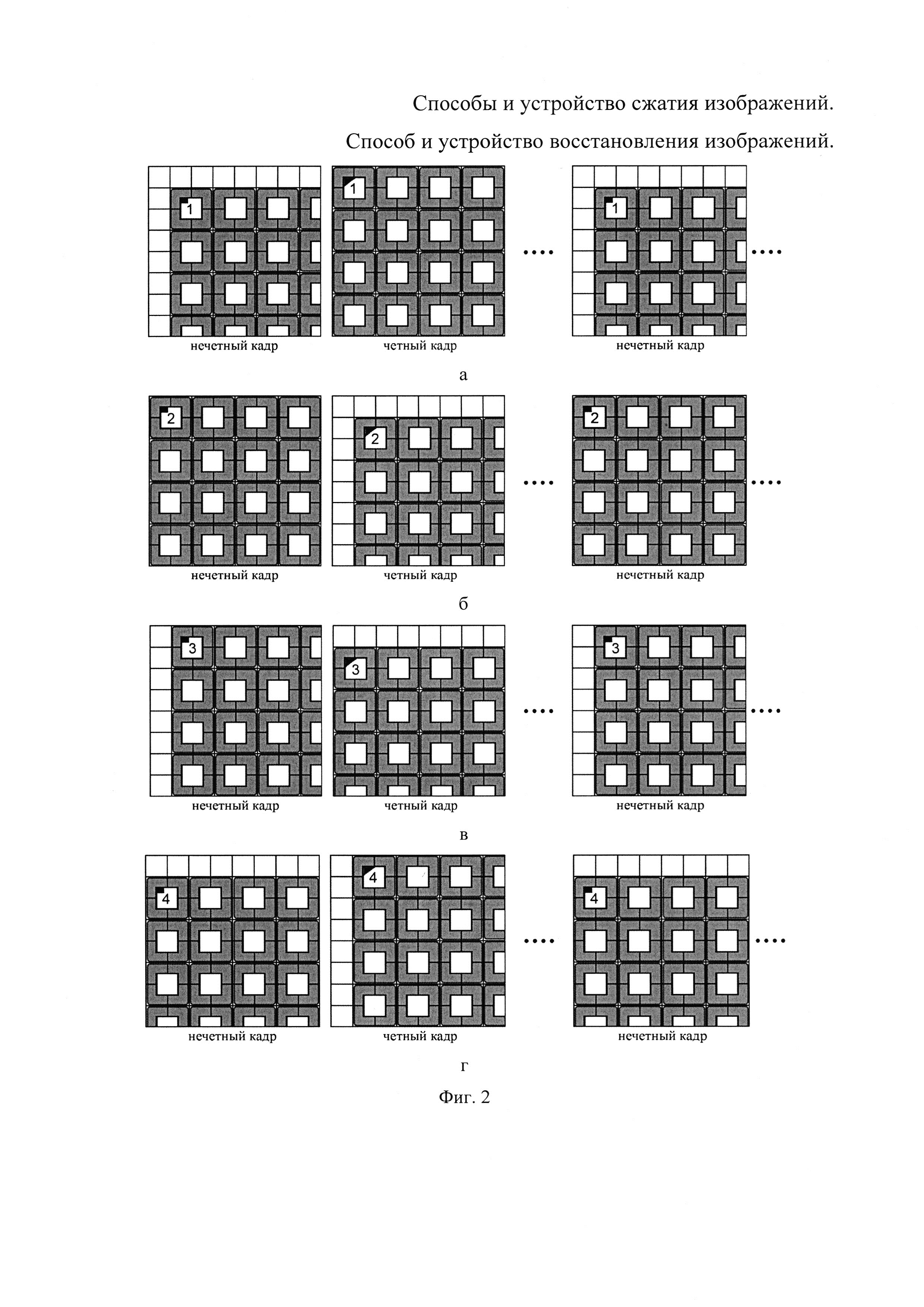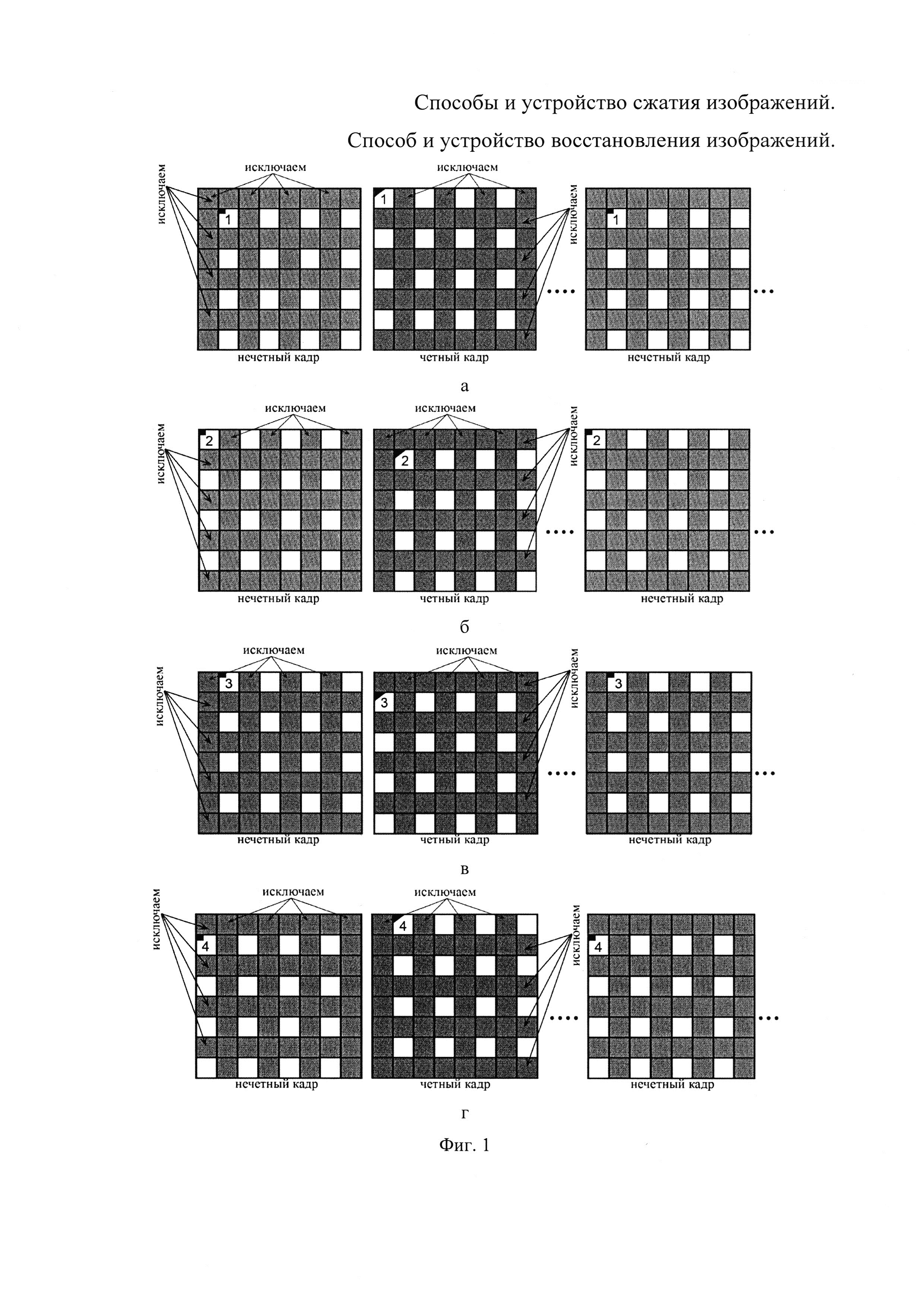 1. Область техники, к которой относится изобретение Изобретение относится к способам сжатия и восстановления видеоизображений с целью их хранения и передачи, которые могут быть использованы как совместно с широко используемыми способами сжатия, описанными в стандартах Н.263, H.264/AVC, H.265/HEVC, SHVC, так и независимо от них. 2. Уровень техники В самых популярных современных форматах передачи и хранения видеоданных Н.263, H.264/AVC, H.265/HEVC, SHVC фирмы Toshiba, (описанные, например в (Андрейко Д.Н. Комаров П.Ю. Игнатов Ф.М. Основные методы сжатия данных в передаче цифровых видеоизображений URL: http://cyberleninka.ru/article/n/osnovnye-metody-szhatiya-dannyh-v-peredache-tsifrovyh-videoizobrazheniy (дата обращения 12.04.2017); Дворкович В.П., Дворкович А.В., Грызов Г.Ю. Новые возможности стандарта видеокодирования HEVC // Цифровая обработка сигналов, 2013, №3. С. 2-8; Будик A. Toshiba SHVC: эффективная конвертация HD в 4K // 3D News, 2014. URL: https://3dnews.ru/905806 (дата обращения 20.02.2017))) применяется не одна технология сжатия, а используется так называемый гибридный подход, использующий сочетание ряда процедур, таких как, разбиение на блоки, вычисление межкадровых разностей, внутри- и межкадровое предсказание, компенсация движения, различные модификации дискретного косинусного преобразования, квантование и др. Дальнейшее увеличение степени сжатия в рамках гибридного подхода возможно только путем совершенствования и оптимизации применяемых в нем алгоритмов, возможности которых на сегодняшний день ограничены достигнутой степенью сжатия и практически исчерпаны. Кроме того, Реализация таких алгоритмов в реальном времени требует дорогостоящего оборудования, что бывает не всегда приемлемо, например, для промышленного телевидения, ввиду дороговизны и высоких требований, предъявляемых к простоте обслуживания и к стабильности параметров в жестких условиях применения. Предлагаемое изобретение представляет собой сравнительно простой способ сжатия изображений и комплементарный ему способ восстановления изображений, обеспечивающие дополнительное к возможностям вышеупомянутых стандартизованных способов сжатия видеоинформации сжатие в четыре раза с возможностью ее последующего восстановления в реальном масштабе времени. В качестве прототипа предлагаемого изобретения могут быть использованы способ и устройство описанные в заявке на изобретение «Устройство и способ обработки изображений» (Заявка RU 2012141996, H04N 19/50, от 31.03.2011). Причем описанные в упомянутой заявке устройство и способ сжатия отличаются, среди прочего, тем, что в упомянутом устройстве имеется модуль выборки, выполняющий сжатие исходного изображения методом передискретизации с помощью прореживания значений пикселей сжимаемого изображения, а упомянутый способ предусматривает операцию передискретизации сжимаемого изображения с помощью прореживания значений пикселей в пределах одного кадра сжимаемых видеоданных, выполняемую с помощью вышеописанного модуля выборки. Также, описанные в упомянутой и взятой в качестве прототипа заявке на изобретение устройство и способ восстановления изображений отличаются тем, что упомянутое устройство содержит модуль реконструирования, выполненный с возможностью интерполяции с использованием значений пикселей, выбранных посредством вышеупомянутого модуля выборки, а упомянутый способ предусматривает операцию интерполяции с исп