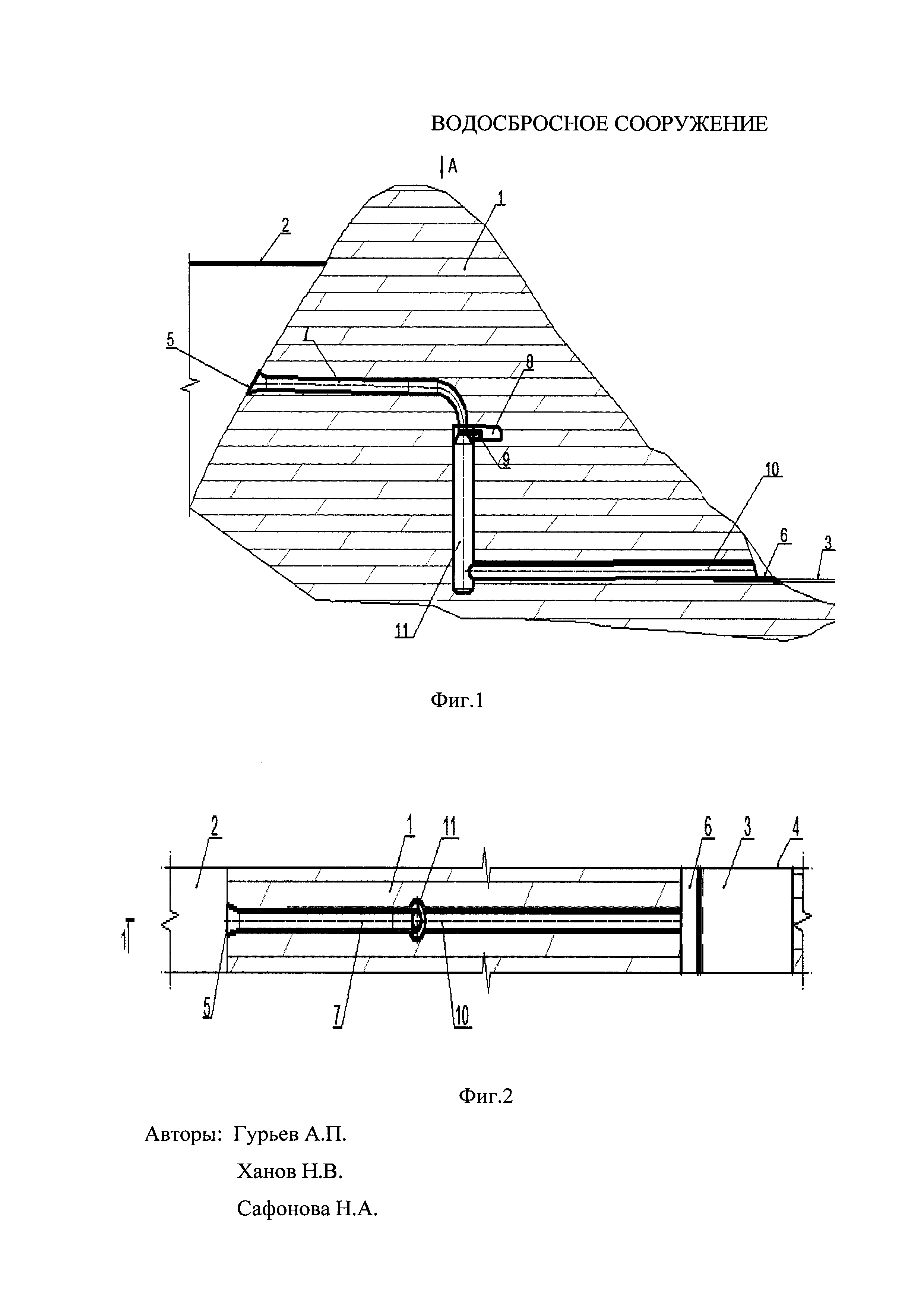 1. Водосбросное сооружение, размещенное между верхним и нижним бьефом водотока, включающее водозаборное устройство и концевое устройство, соединенные водоводом, в разрыве которого смонтирована камера с затворами и энергогасящее устройство, отличающееся тем, что концевой участок водовода со стороны верхнего бьефа выполнен с вертикальным отклонением вниз и примыкает сверху к затворной камере, а энергогасящее устройство, выполненное в виде вертикально расположенной цилиндрической шахты, торцом верхнего участка соосно присоединено к затворной камере, а нижним участком через боковое отверстие соединено отводящим водоводом с концевым устройством. 2. Водосбросное сооружение по п.1, отличающееся тем, что отводящий водовод выполнен с обратным уклоном. 3. Водосбросное сооружение по п.1, отличающееся тем, что концевое устройство выполнено расширяющимся в плане.