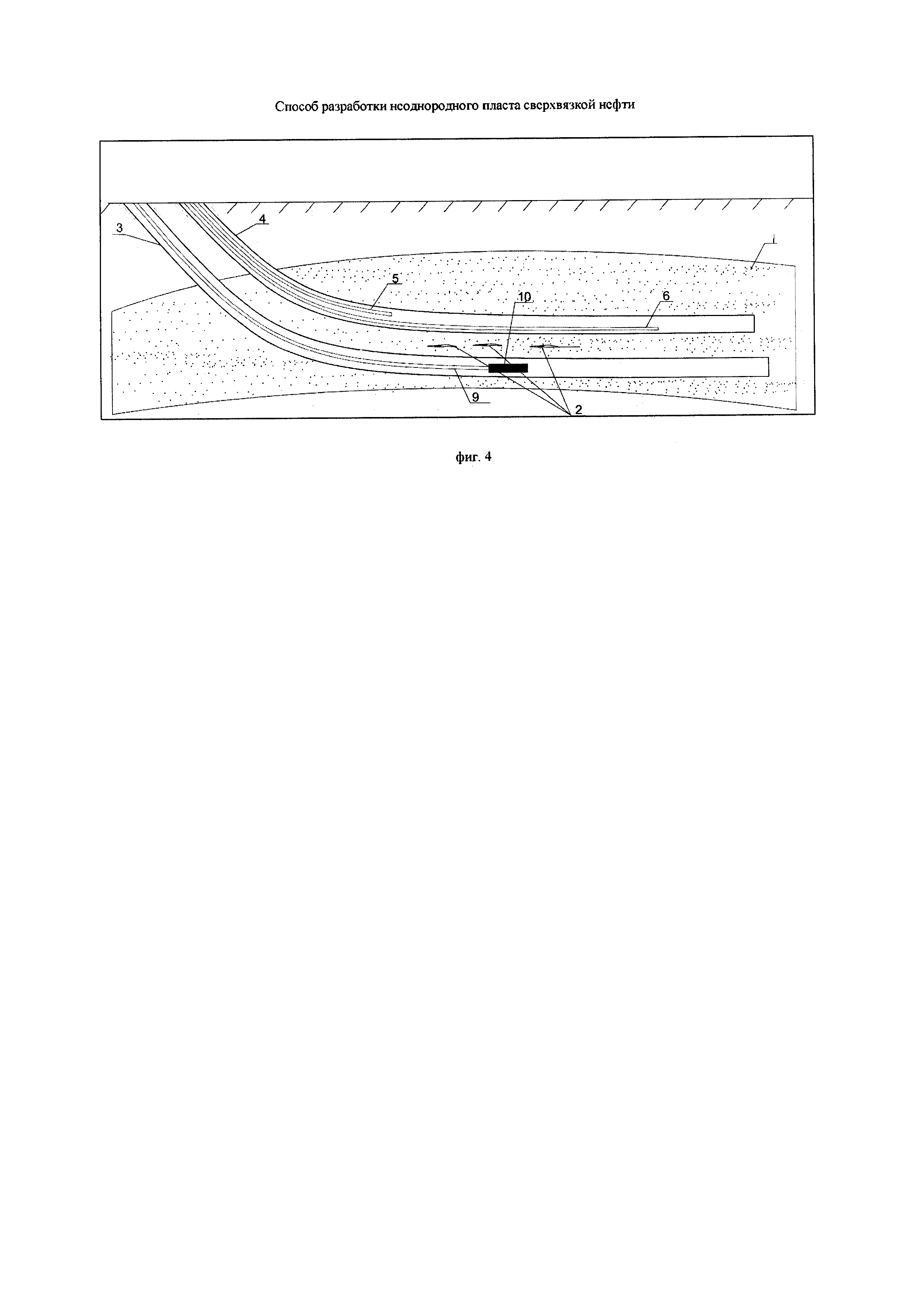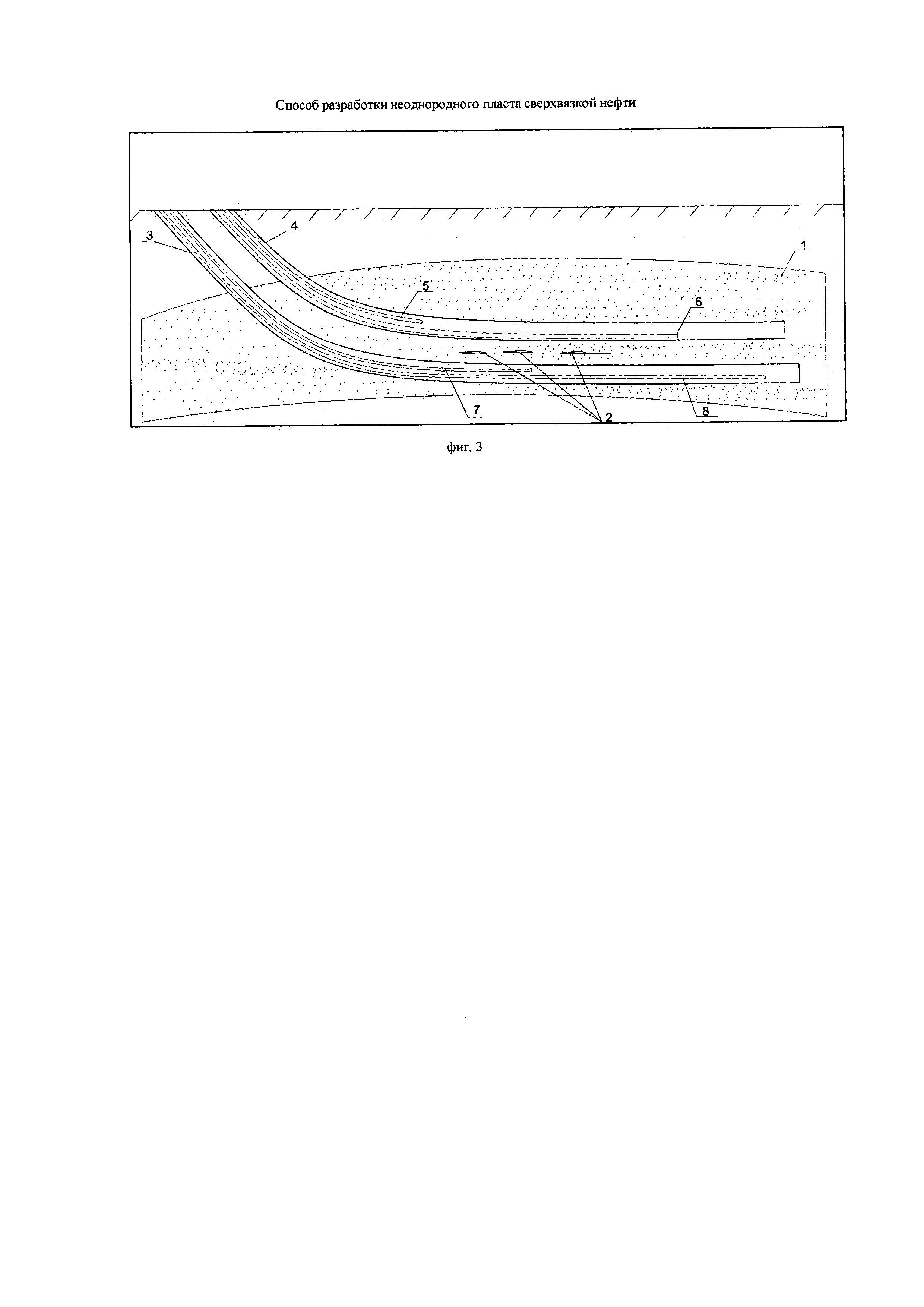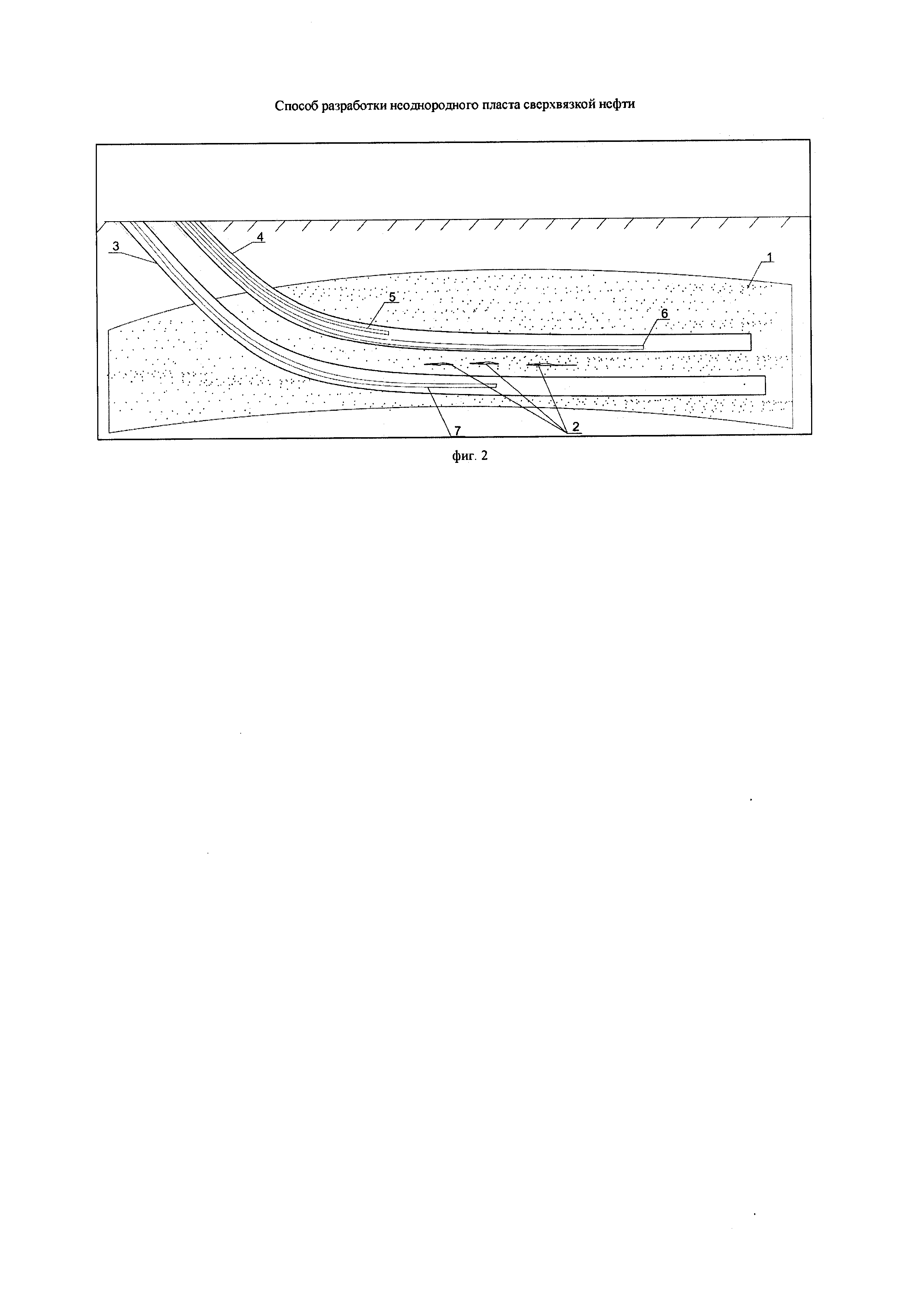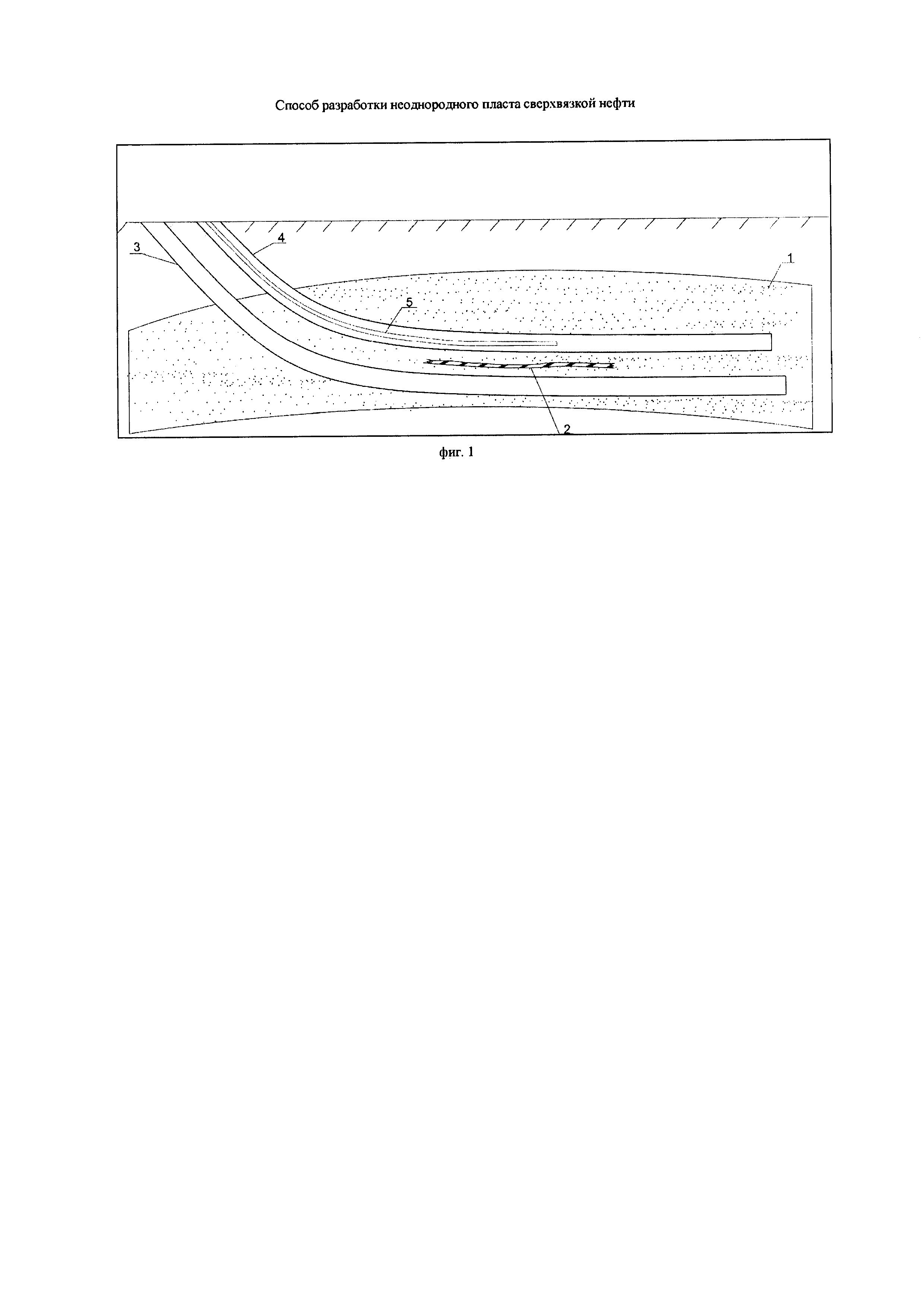 Способ разработки неоднородного пласта сверхвязкой нефти, включающий использование пары горизонтальных - нагнетательной и добывающей - скважин, горизонтальные участки которых размещены параллельно один над другим в вертикальной плоскости продуктивного пласта, оснащенных колоннами насосно-компрессорных труб - НКТ, закачку теплоносителя в разные интервалы горизонтальных стволов скважин, прогрев продуктивного пласта с созданием паровой камеры, отбор продукции через добывающую скважину по колоннам НКТ и контроль технологических параметров пласта и скважины, осуществляют равномерный прогрев паровой камеры путем регулирования режима закачки теплоносителя или отбора продукции скважин, отличающийся тем, что до строительства горизонтальных скважин участок разбуривают сеткой оценочных вертикальных скважин, проводят комплексные геофизические исследования скважин - ГИС, по результатам обобщения полученных материалов и лабораторных исследований керна получают предварительные геометрические и геолого-физические параметры залежи сверхвязкой нефти, уточняют контуры нефтеносности, выявляют наличие уплотненных и глинистых пропластков и проектируют размещение пар одноустьевых горизонтальных скважин в участках пласта с наименьшим количеством таких пропластков, после строительства горизонтальных скважин в них также проводят ГИС по определению уплотненных и глинистых пропластков, а также нефтенасыщенности вдоль горизонтальных стволов парных скважин, причем концы колонн двух НКТ в нагнетательной скважине располагают в первой и второй половинах горизонтального ствола в зонах с наибольшей нефтенасыщенностью, а концы одной или двух колонн НКТ для закачки пара в добывающей скважине размещают со смещением по горизонтали относительно концов НКТ нагнетательной скважины не менее чем на 15 м, в нагнетательной скважине производят обработку призабойной зоны соляной кислотой и глинокислотой в тех частях, где между нагнетательной и добывающей скважинами выявлены наиболее обширные уплотненные и глинистые пропластки, после технологической выдержки, достаточной для растворения уплотнений и глинистых пропластков, в обе скважины через колонны НКТ закачивают пар до создания гидродинамической связи между скважинами, останавливают закачку на выдержку для термокапиллярной пропитки и остывания ствола добывающей скважины, в которой проводят термобарометрические измерения посредством ГИС, по результатам которых в горизонтальном стволе добывающей скважины выявляют переходные зоны с температурой между большим и меньшим прогревом, а среди выявленных зон определяют зону с изменением угла набора кривизны не более 2 градусов на 10 м, в которой размещают спускаемый на колонне НКТ насос, для контролирования процесса равномерного прогрева паровой камеры производят регулируемую закачку пара через колонны НКТ нагнетательной скважины и регулируемый отбор продукции насосом со съемом термограммы вдоль ствола добывающей скважины посредством оптоволоконного кабеля и замером температуры на приеме насоса при наличии датчика.