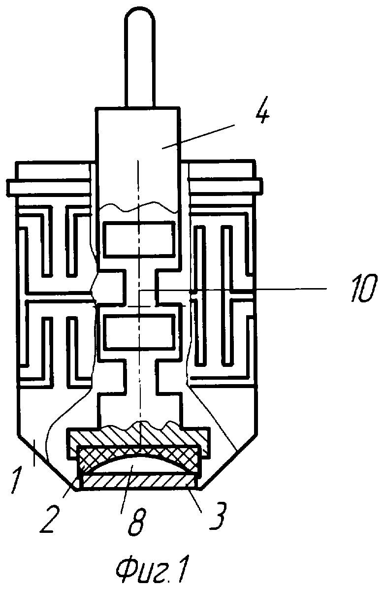 катода выполнен с углублением 7 под катод. В этом углублении выполнена полость 8 с формой поверхности второго порядка. Глубина полости 8 составляет 0,5÷0,75 высоты подогревателя.