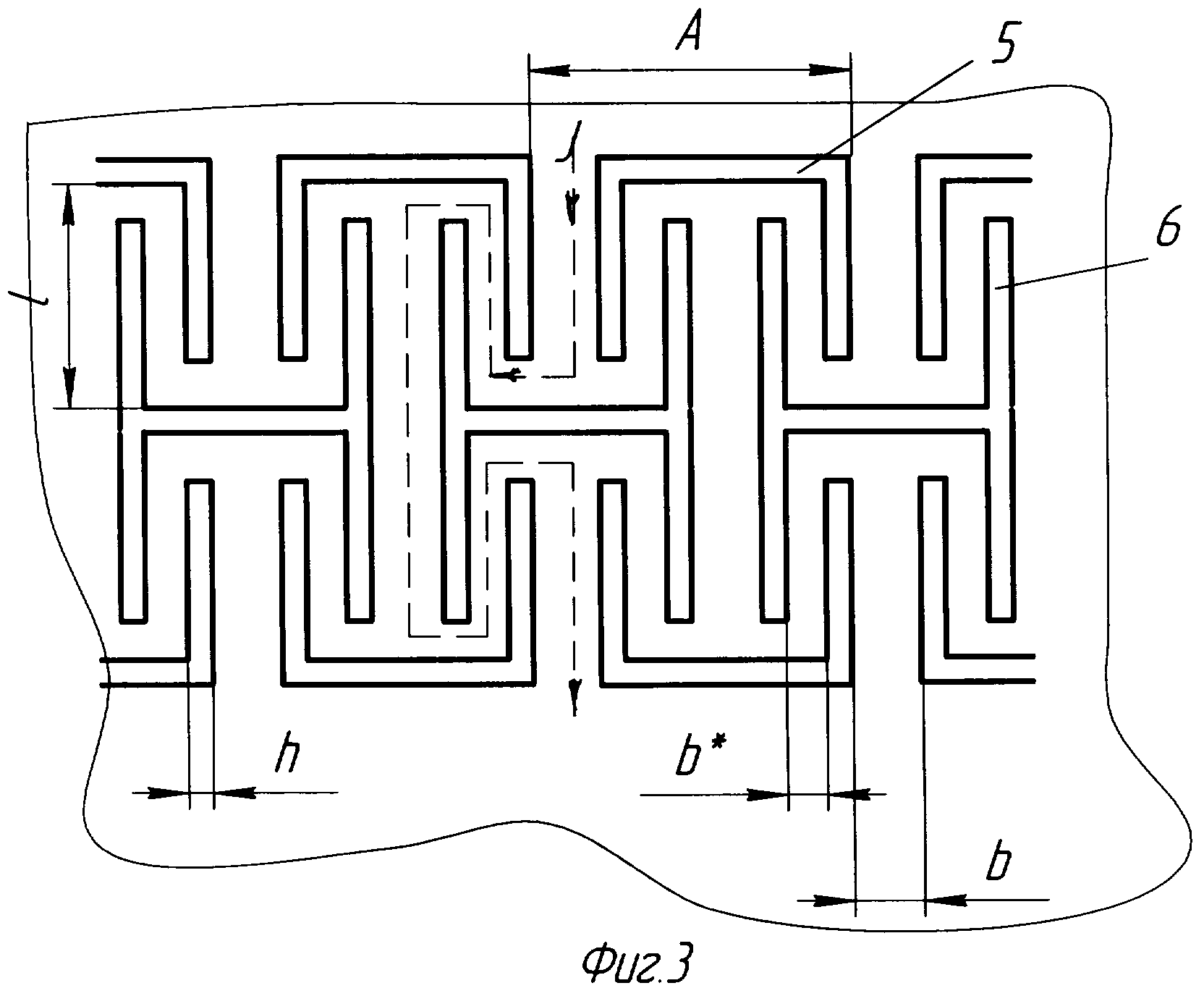 b=(A-4h):3, отношение поперечного сечения перемычек ряда к длине пути прохождения тока между крайними рядами: 1:(35÷40), а соотношение длины перемычки - l между смежными рядами прорезей к ее