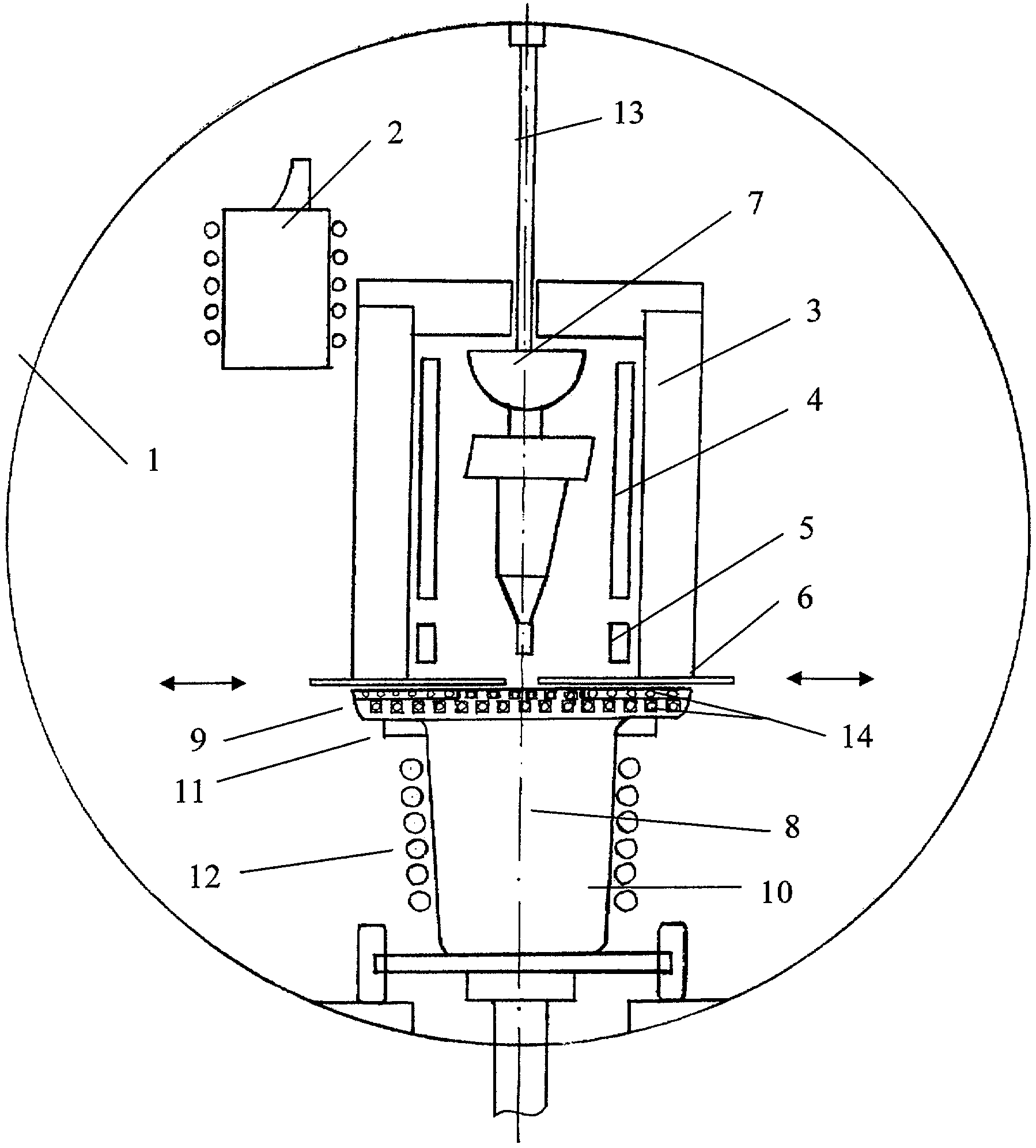 1. Устройство для получения отливок с направленной и монокристаллической структурой, содержащее вертикальную вакуумную камеру, внутри которой размещена индукционная плавильная печь, печь подогрева форм с керамической формой, механизм перемещения формы, экран, разделяющий зону нагрева и зону охлаждения, выполненный раздвижным в горизонтальной плоскости, емкость для кристаллизации отливок, отличающееся тем, что печь подогрева форм снабжена двумя нагревателями верхней и нижней зоны и имеет прямоугольную форму в горизонтальном сечении с соотношением длины к ширине 1:(0,15÷0,4), причем отношение высоты нагревателя верхней зоны к высоте нагревателя нижней зоны составляет 1:(0,1÷0,16), емкость для кристаллизации отливок содержит жидкометаллический охладитель и тепловой экран из пористого термостойкого материала, расположенного на поверхности жидкометаллического охладителя, причем форма и размеры верхней части емкости соответствуют размерам наружной стенки печи подогрева форм, а размеры нижней части емкости - размерам внутренней стенки печи подогрева форм. 2. Устройство по п.1, отличающееся тем, что в месте сопряжения нижней и верхней частей емкости для кристаллизации отливок расположена водоохлаждаемая рубашка. 3. Устройство по п.1, отличающееся тем, что нижняя часть стенки емкости для кристаллизации отливок дополнительно снабжена нагревательными элементами. 4. Устройство по п.1, отличающееся тем, что соотношение высот верхней и нижней частей емкости для кристаллизации отливок равно 1:(6-15).