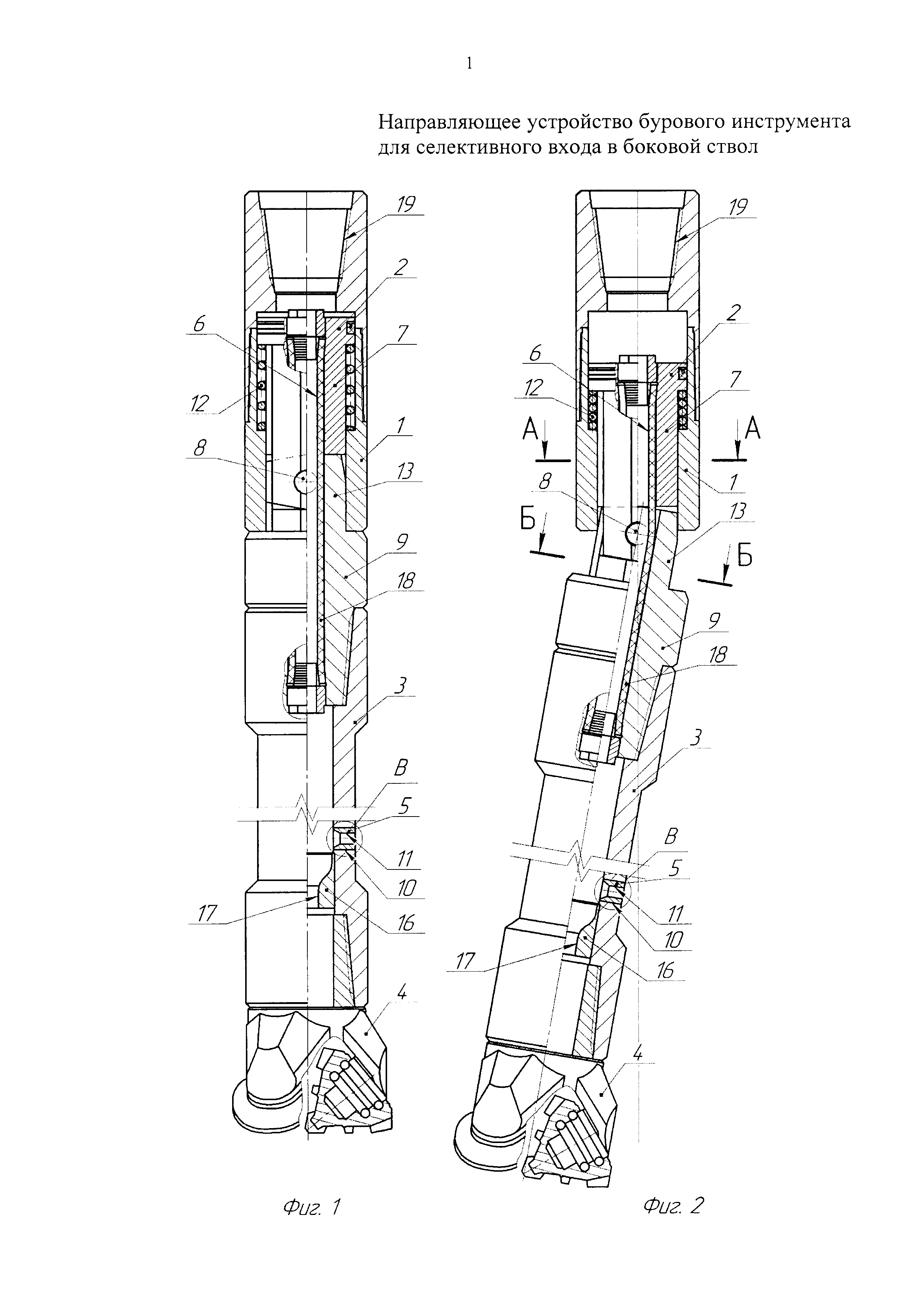 Направляющее устройство бурового инструмента для селективного входа в боковой ствол, включающее соединенный с колонной труб ствол с механизмом изменения направления движения с полым хвостовиком для соединения с буровым инструментом, причем ствол соединен с механизмом изменения направления движения с возможностью регулируемой передачи вращения, а хвостовик оснащен отклонителем, гидравлически связанным с внутренней полостью хвостовика и через канал механизма изменения направления движения с колонной труб, отличающееся тем, что механизм изменения направления движения выполнен в виде верхнего поршня с полым штоком, шарнирно соединенным с переводником хвостовика, а отклонитель - в виде радиального канала с тарированным отверстием, при этом поршень механизма изменения направления движения подпружинен вверх и вставлен в ствол с возможностью ограниченного продольного перемещения вниз с выходом шарнирного соединения из ствола, причем шток поршня и верхняя часть переводника снабжены снаружи продольными проточками или выборками под соответствующие внутренние плоскости или выступы ствола для передачи вращения, ниже радиального канала в хвостовике установлен жиклер с проходным каналом, причем поперечное сечение канала механизма изменения направления движения и канала жиклера выполнены такой площади, чтобы обеспечить при прокачке жидкости перепад давлений, необходимый соответственно для выдвижения поршня из ствола и отклонения хвостовика при помощи радиального канала и шарнирного соединения.