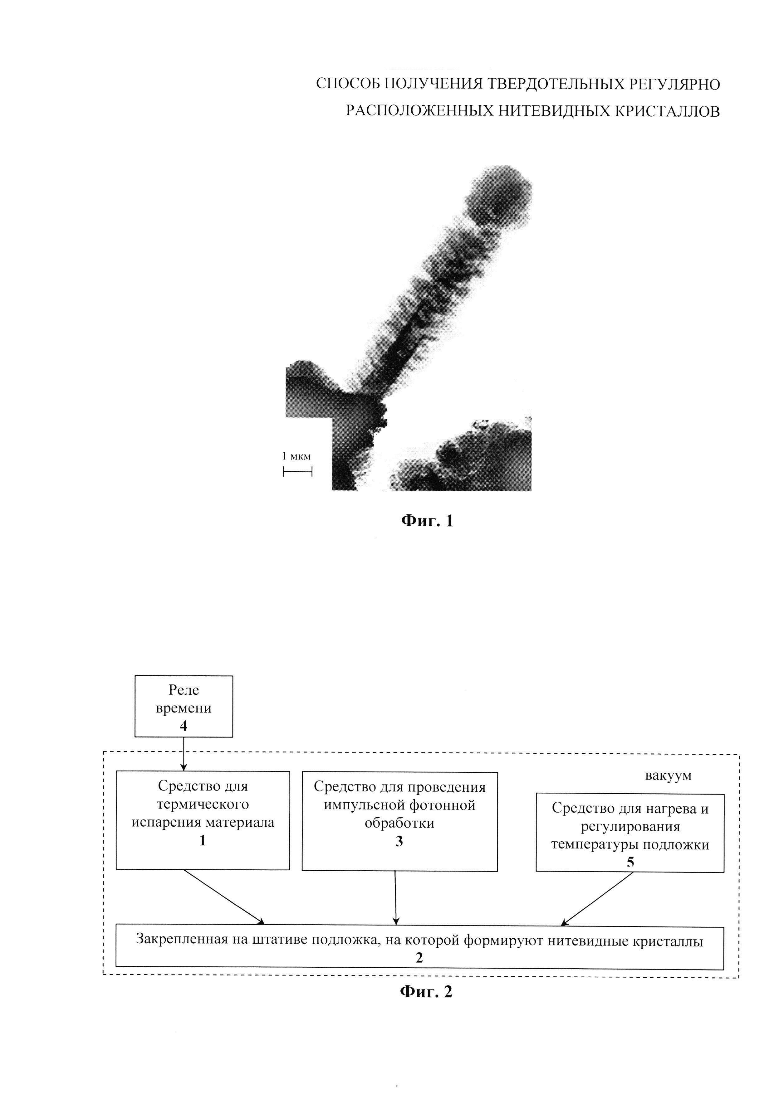 Изобретение относится к технологии формирования упорядоченных структур на поверхности твердого тела и может быть использовано для получения нитевидных кристаллов из различных материалов, пригодных для термического испарения. На подложку, имеющую морфологию в виде упорядоченных пор и/или других упорядоченных неоднородностей нано- и/или микрометрового размера 2, осуществляют термическое осаждение 1 материала, предназначенного для формирования нитевидных кристаллов. Температуру подложки выбирают таким образом, чтобы обеспечить диффузионное движение атомов по подложке, но не допустить плавления конденсируемого материала. Одновременно с термическим испарением 1 проводят импульсную фотонную обработку (ИФО) 3 поверхности подложки, обеспечивая тем самым дополнительный нагрев приповерхностного слоя. Мощность ИФО выбирают максимально большой (1,6÷2,4 Вт/см), при которой реиспарение конденсируемых атомов незначительно. Для получения нитевидных кристаллов максимальной длины конденсацию проводят до тех пор, пока интегральная (суммарная) толщина полученного конденсата не станет равной 1 мкм. Технический результат - получение твердотельных регулярно расположенных на подложке нитевидных кристаллов необходимой длины (до 10 мкм) из различных металлов и полупроводников, пригодных для термического испарения, обладающих стойкостью к внешней среде (температуре, давлению, свету), на поверхности любой подложки, содержащей упорядоченные дефекты. 3 з.п. ф-лы, 2 ил.