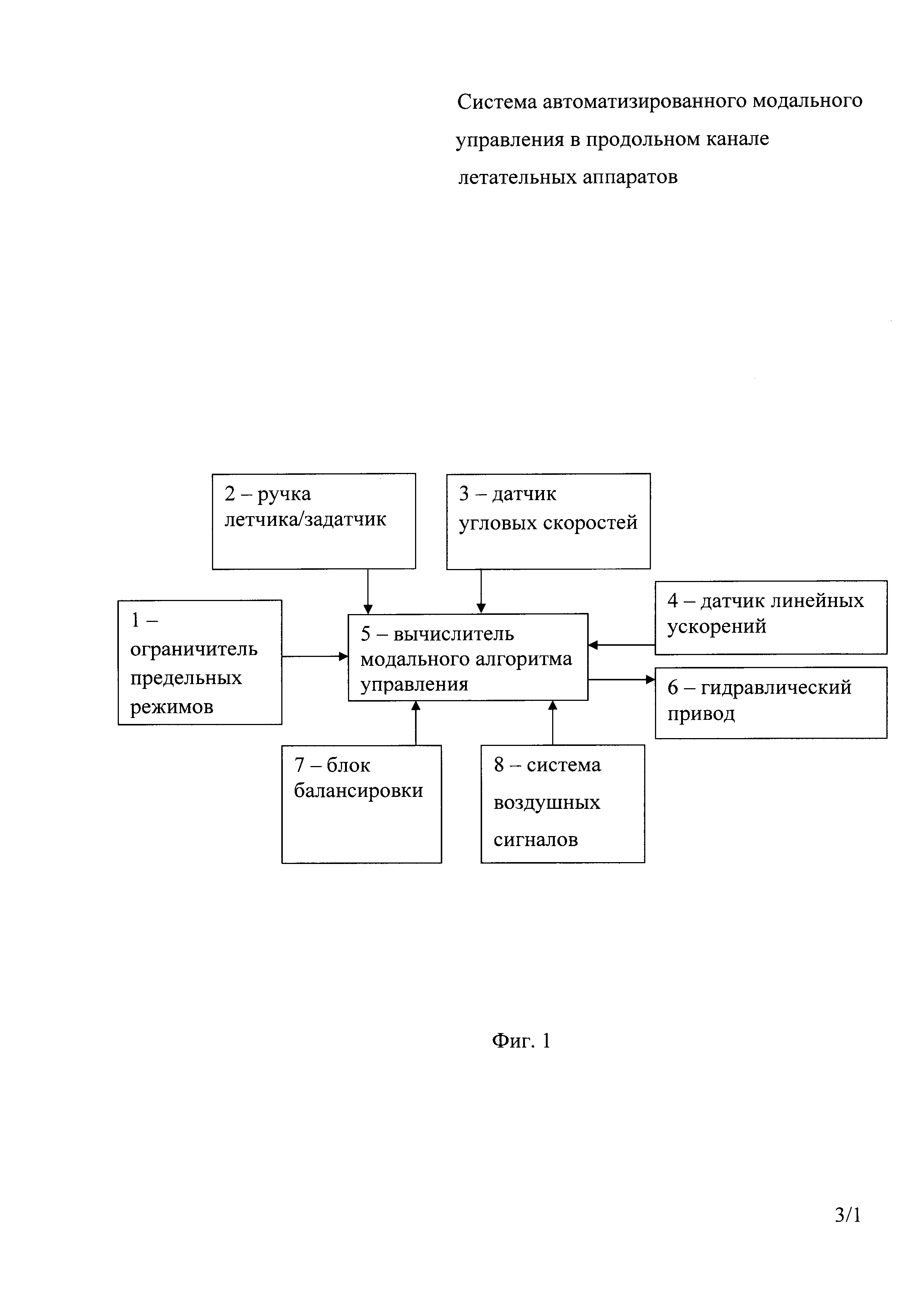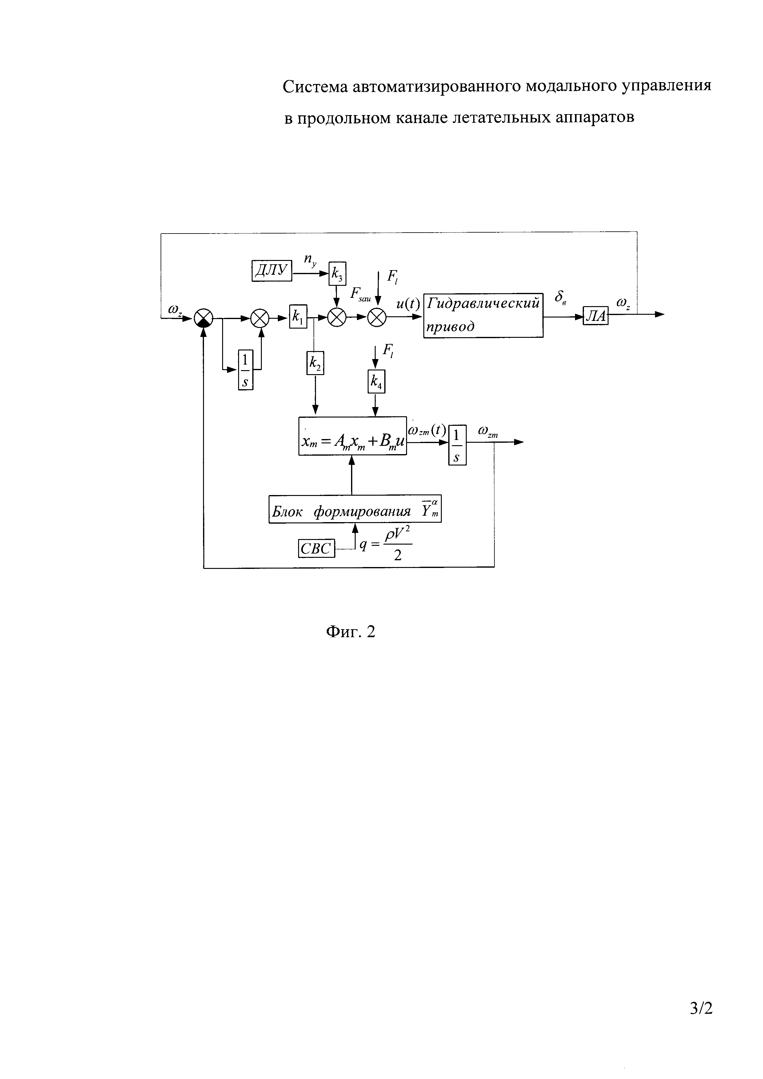 Система автоматизированного модального управления в продольном канале летательного аппарата, содержащая последовательно соединенные ручку пилота/задатчик тангажа и вычислитель автопилота угла тангажа, гидравлический привод и селектор минимального сигнала в составе сервопривода, выходной сигнал которого определяет угол отклонения руля высоты летательного аппарата, датчик угла тангажа летательного аппарата, имеющий выход, подключенный ко второму входу вычислителя автопилота угла тангажа, ограничитель предельных режимов (ОПР), состоящий из последовательно соединенных задатчика максимального угла атаки, вычислителя автомата ограничения угла атаки, выход которого подключен к входу сервопривода, датчик угловой скорости тангажа (ДУС) летательного аппарата, имеющий выход, подключенный к входу вычислителя автомата ограничения угла атаки, выход вычислителя автопилота угла тангажа подключен ко второму входу селектора минимального сигнала, а также блок балансировки, отличающаяся тем, что дополнительно введен вычислитель алгоритма модального управления (ВАМУ), содержащий блок формирования сигнала усредненного приведенного коэффициента подъемной силы где: Fl - сигнал с ручки пилота, ki - масштабные коэффициенты закона управления, ωz - выходной сигнал датчика угловая скорость тангажа ЛА, ωzm - выходной сигнал с желаемой эталонной модели, ny - нормальная перегрузка.