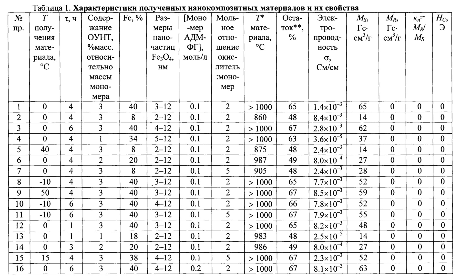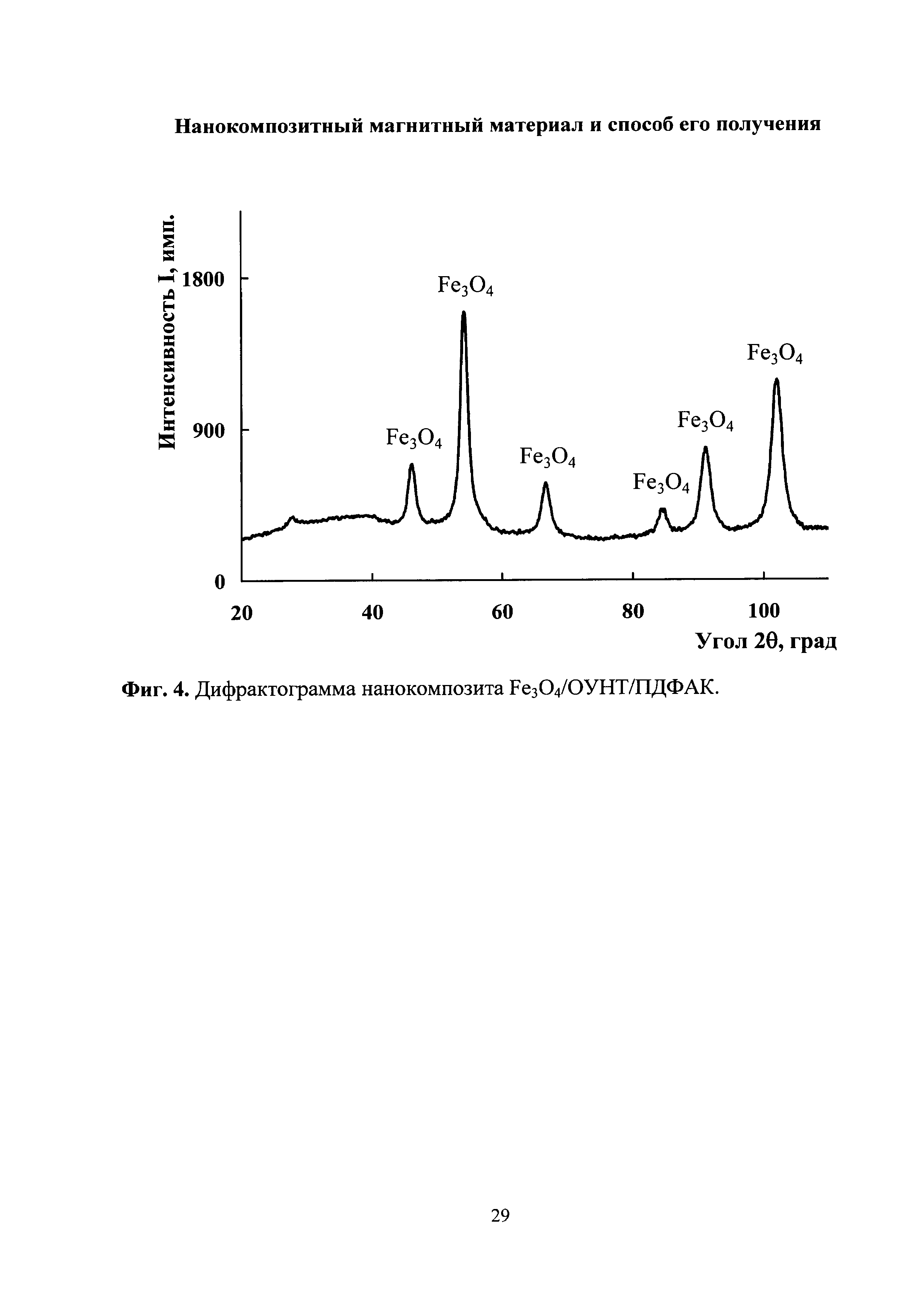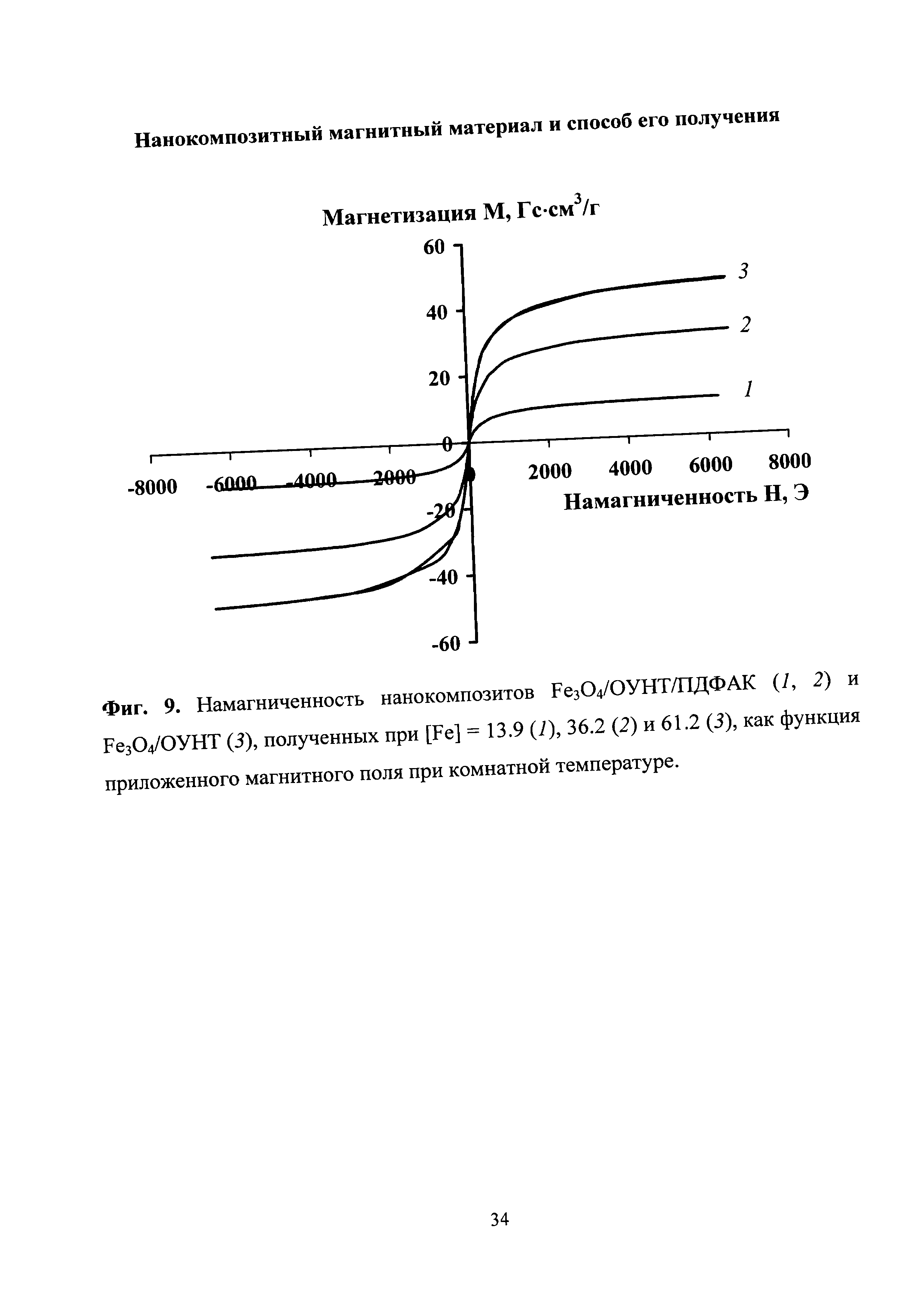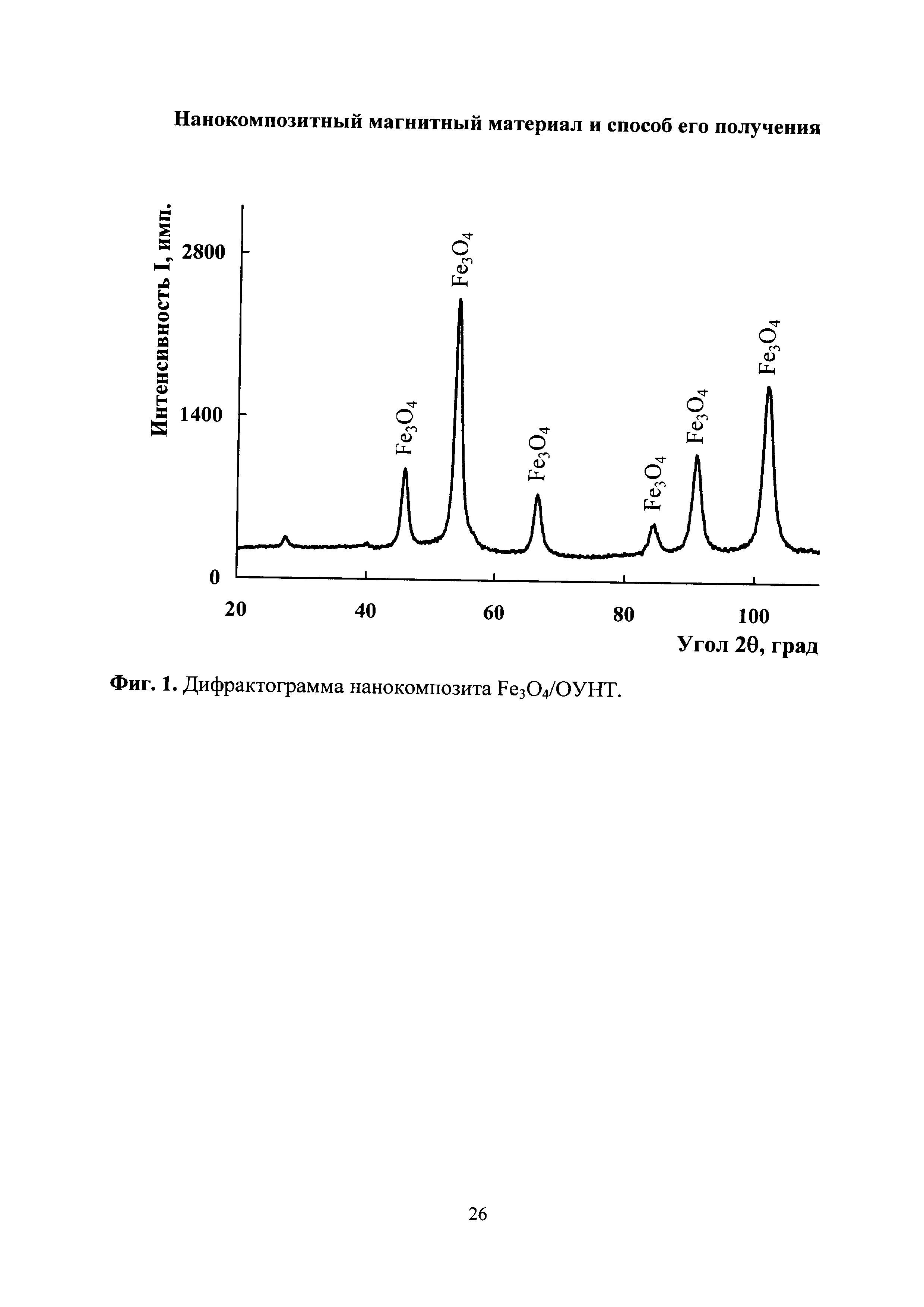 Изобретение относится к области создания новых нанокомпозитных материалов на основе электроактивных полимеров с системой сопряжения и магнитных наночастиц Fe3O4, закрепленных на углеродных нанотрубках, и может быть использовано в органической электронике и электрореологии, для создания датчиков и нанозондов, электрохимических источников тока, перезаряжаемых батарей, сенсоров и биосенсоров, суперконденсаторов, солнечных батарей и других электрохимических устройств, в системах магнитной записи информации, медицине, гипертермии, для электромагнитных экранов, для очистки воды, как антистатические покрытия и материалы, поглощающие электромагнитное излучение в различных диапазонах длины волны, электрокатализаторы и др. Современный уровень развития технологий требует создания материалов нового поколения с улучшенными функциональными характеристиками. Такими материалами являются гибридные наноматериалы, сочетание органических и неорганических компонентов в которых обеспечивает комплекс требуемых свойств. Особое место среди них занимают гибридные наноматериалы, в которых органический компонент представляет собой проводящий полимер с системой сопряжения, а неорганическим компонентом являются магнитные наночастицы. Гибридные наноматериалы, включающие полимеры с системой сопряжения [1, 2], благодаря электронному взаимодействию органического и неорганического компонентов способны проявлять замечательные электрические, оптические, магнитные, электрохимические свойства. Интерес к таким материалам растет, о чем свидетельствует большой поток научной литературы, посвященной различным аспектам создания и исследования гибридных наноматериалов. Также не ослабевает интерес исследователей к углеродным нанотрубкам (УНТ) [3] благодаря присущим им замечательным физико-химическим свойствам. Перспективы создания полимерных композитных материалов, включающих УНТ, связаны с возможным проявлением синергетического эффекта и, как следствие, расширением областей практического применения. Сферы использования УНТ: космические технологии и авиастроение, медицинские технологии, оборонная промышленность, энергоэффективность и энергосбережение. В литературе рассматриваются два класса гибридных нанокомпозитов: нанокомпозиты, в которых магнитные наночастицы диспергированы в матрице полимера с системой сопряжения, и магнитные нанокомпозиты, представляющие собой дискретные композитные наночастицы со структурой ядро-оболочка, в которых ядром является магнитная наночастица, а оболочка представляет собой полимер с системой сопряженных связей. При этом полимерная оболочка играет роль стабилизатора, предотвращая агрегирование наночастиц. Наиболее близкими к предложенным являются металлополимерный нанокомпозитный магнитный материал на основе полианилина (ПАНи) и наночастиц Fe3O4 и способ получения этого магнитного материала окислительной полимеризацией анилина в присутствии наночастиц Fe3O4 в кислой среде (рН 2.5) под действием Н2О2 в качестве окислителя [4]. Магнитные наночастицы имеют размеры 10-12 нм. Недостатком известного материала и способа является низкая намагниченность насыщения - MS не выше 6.2 Гс⋅см3/г. При этом реакцию полимеризации проводят в течение 20 ч. Кроме того, термостойкость (термостабильность) материала 