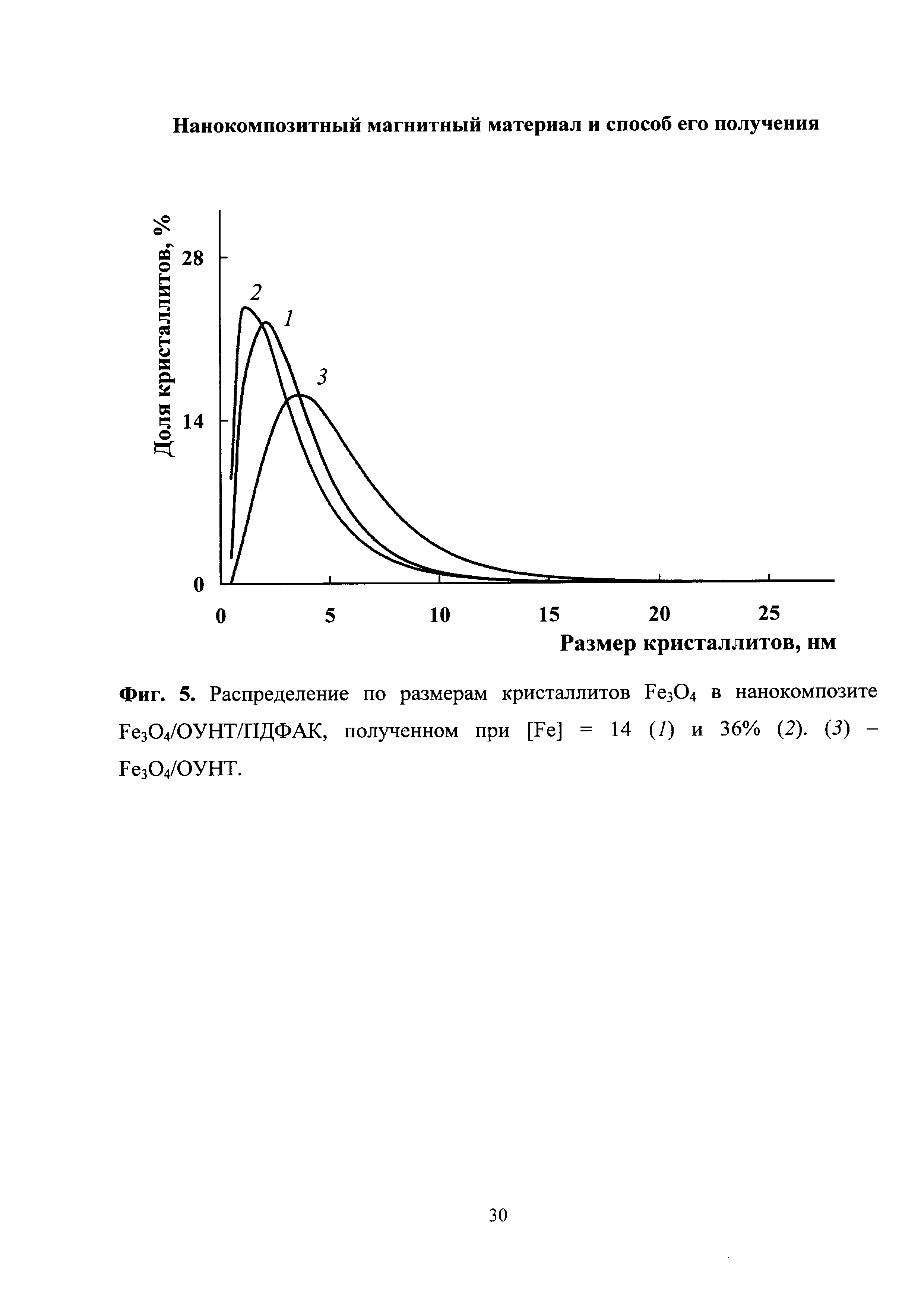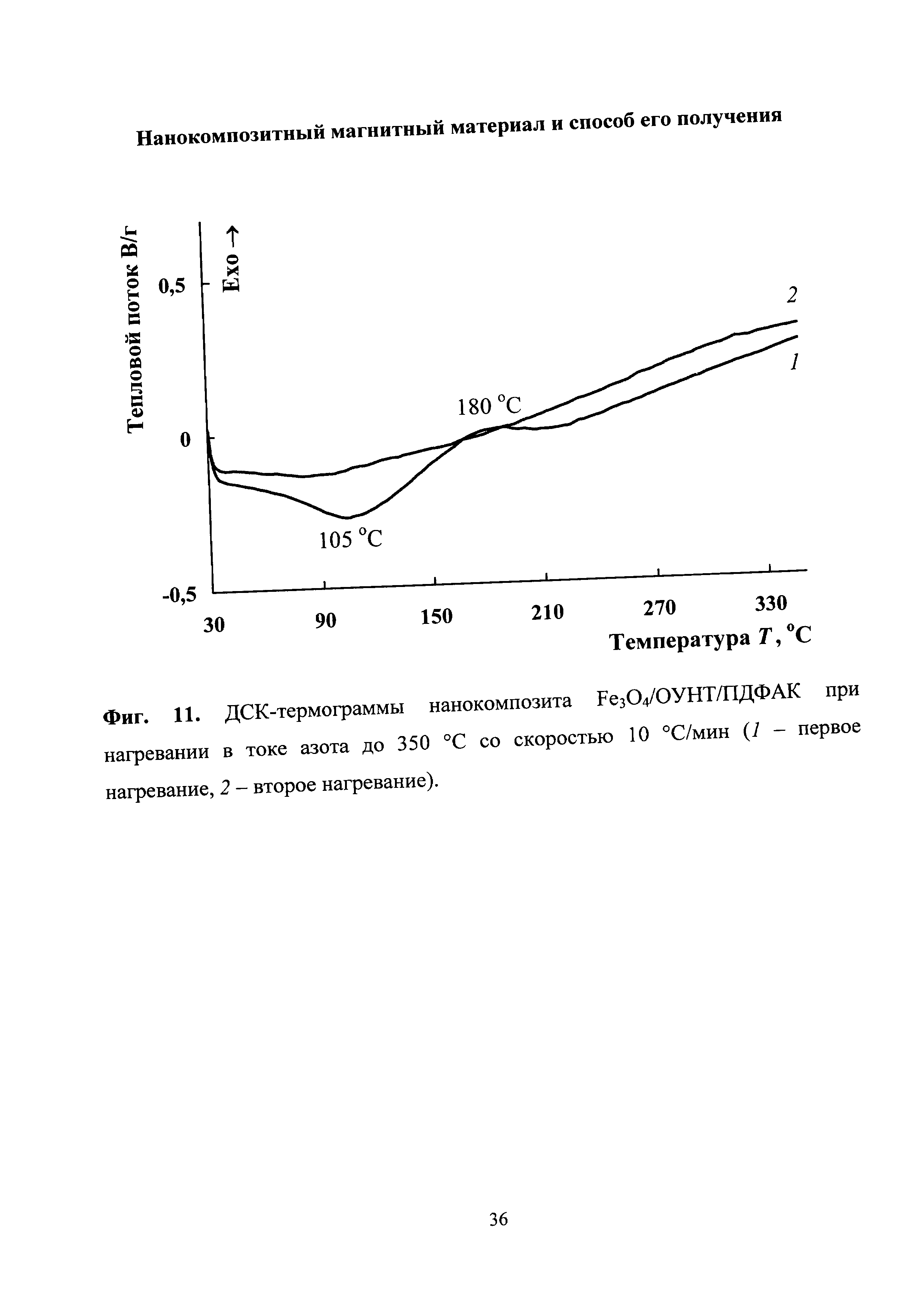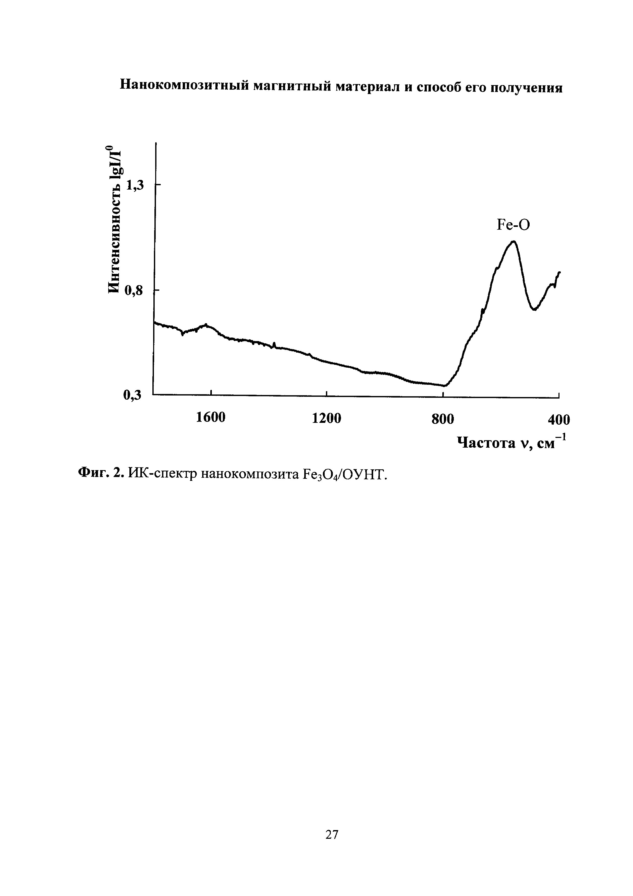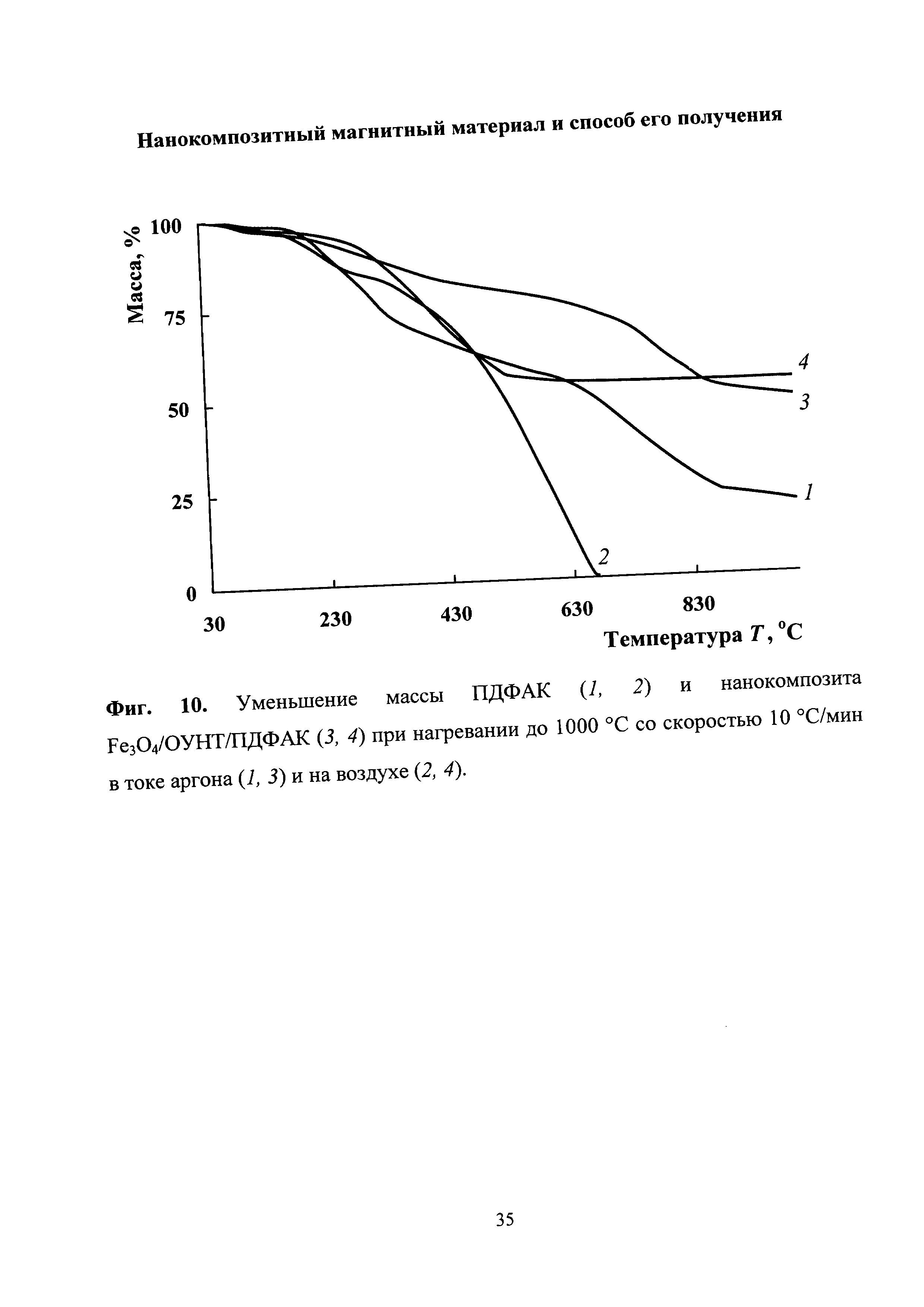 Изобретение относится к области создания новых нанокомпозитных материалов на основе электроактивных полимеров с системой сопряжения и магнитных наночастиц Fe3O4, закрепленных на углеродных нанотрубках, и может быть использовано в органической электронике и электрореологии, для создания датчиков и нанозондов, электрохимических источников тока, перезаряжаемых батарей, сенсоров и биосенсоров, суперконденсаторов, солнечных батарей и других электрохимических устройств, в системах магнитной записи информации, медицине, гипертермии, для электромагнитных экранов, для очистки воды, как антистатические покрытия и материалы, поглощающие электромагнитное излучение в различных диапазонах длины волны, электрокатализаторы и др. Современный уровень развития технологий требует создания материалов нового поколения с улучшенными функциональными характеристиками. Такими материалами являются гибридные наноматериалы, сочетание органических и неорганических компонентов в которых обеспечивает комплекс требуемых свойств. Особое место среди них занимают гибридные наноматериалы, в которых органический компонент представляет собой проводящий полимер с системой сопряжения, а неорганическим компонентом являются магнитные наночастицы. Гибридные наноматериалы, включающие полимеры с системой сопряжения [1, 2], благодаря электронному взаимодействию органического и неорганического компонентов способны проявлять замечательные электрические, оптические, магнитные, электрохимические свойства. Интерес к таким материалам растет, о чем свидетельствует большой поток научной литературы, посвященной различным аспектам создания и исследования гибридных наноматериалов. Также не ослабевает интерес исследователей к углеродным нанотрубкам (УНТ) [3] благодаря присущим им замечательным физико-химическим свойствам. Перспективы создания полимерных композитных материалов, включающих УНТ, связаны с возможным проявлением синергетического эффекта и, как следствие, расширением областей практического применения. Сферы использования УНТ: космические технологии и авиастроение, медицинские технологии, оборонная промышленность, энергоэффективность и энергосбережение. В литературе рассматриваются два класса гибридных нанокомпозитов: нанокомпозиты, в которых магнитные наночастицы диспергированы в матрице полимера с системой сопряжения, и магнитные нанокомпозиты, представляющие собой дискретные композитные наночастицы со структурой ядро-оболочка, в которых ядром является магнитная наночастица, а оболочка представляет собой полимер с системой сопряженных связей. При этом полимерная оболочка играет роль стабилизатора, предотвращая агрегирование наночастиц. Наиболее близкими к предложенным являются металлополимерный нанокомпозитный магнитный материал на основе полианилина (ПАНи) и наночастиц Fe3O4 и способ получения этого магнитного материала окислительной полимеризацией анилина в присутствии наночастиц Fe3O4 в кислой среде (рН 2.5) под действием Н2О2 в качестве окислителя [4]. Магнитные наночастицы имеют размеры 10-12 нм. Недостатком известного материала и способа является низкая намагниченность насыщения - MS не выше 6.2 Гс⋅см3/г. При этом реакцию полимеризации проводят в течение 20 ч. Кроме того, термостойкость (термостабильность) материала 