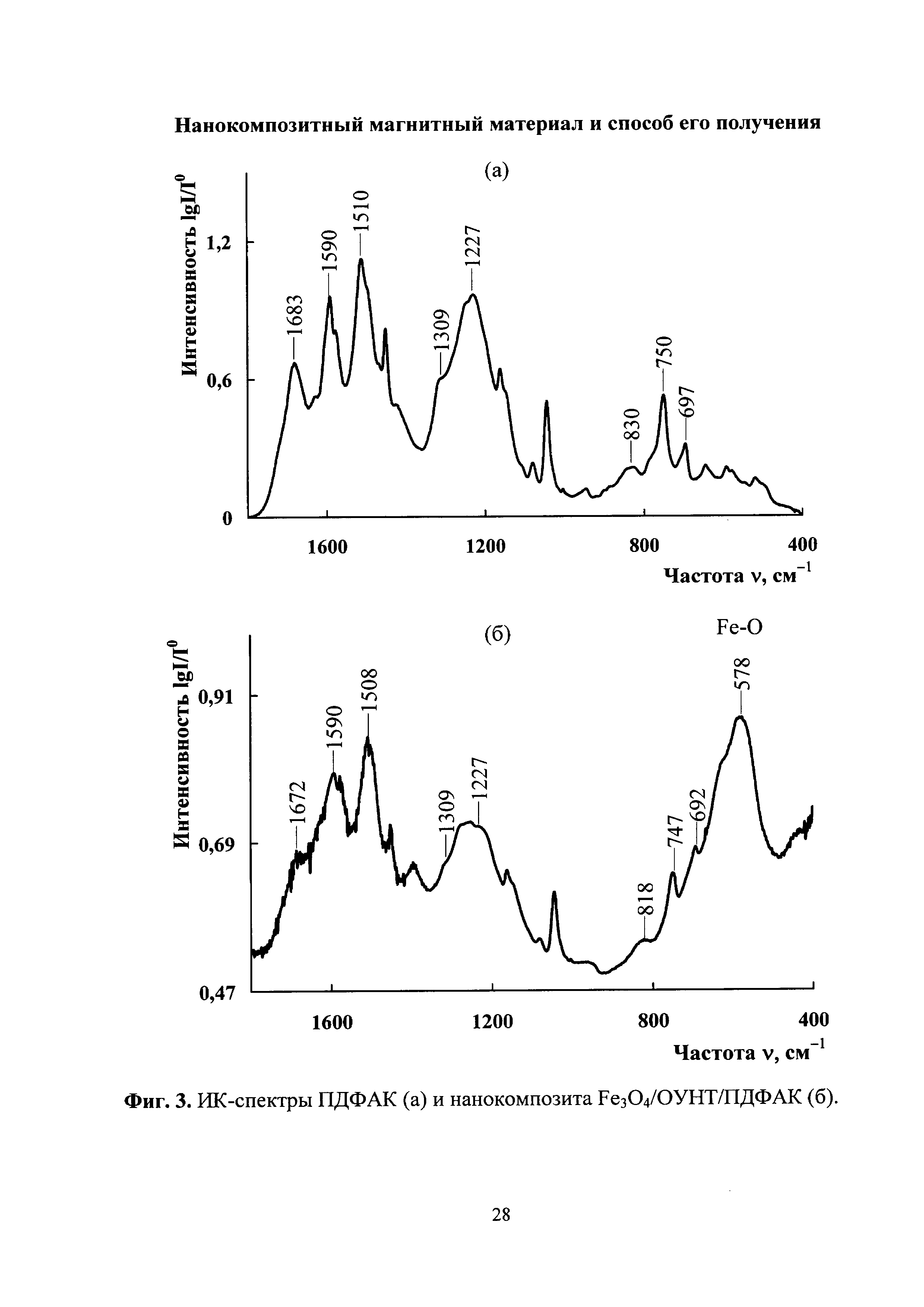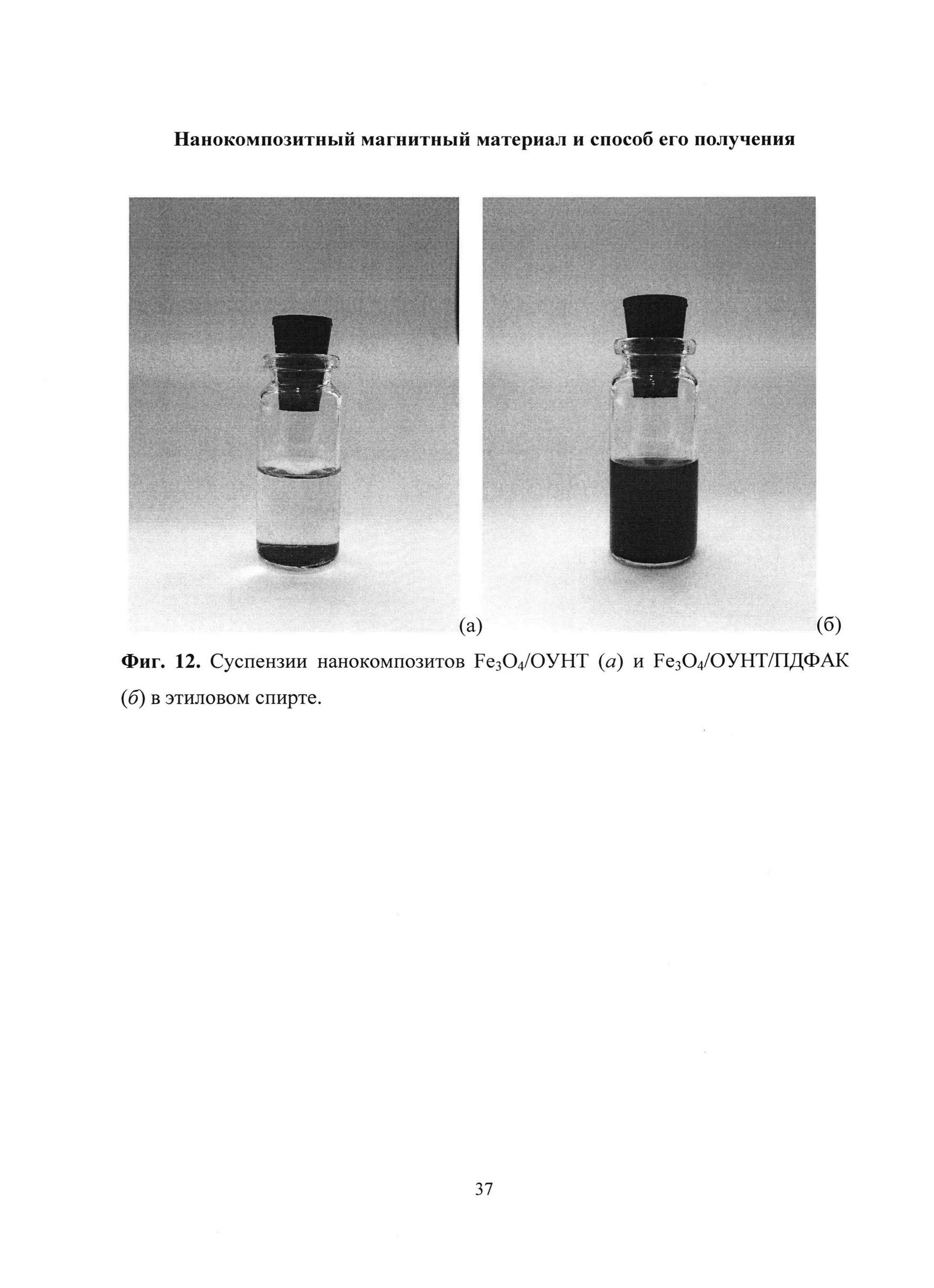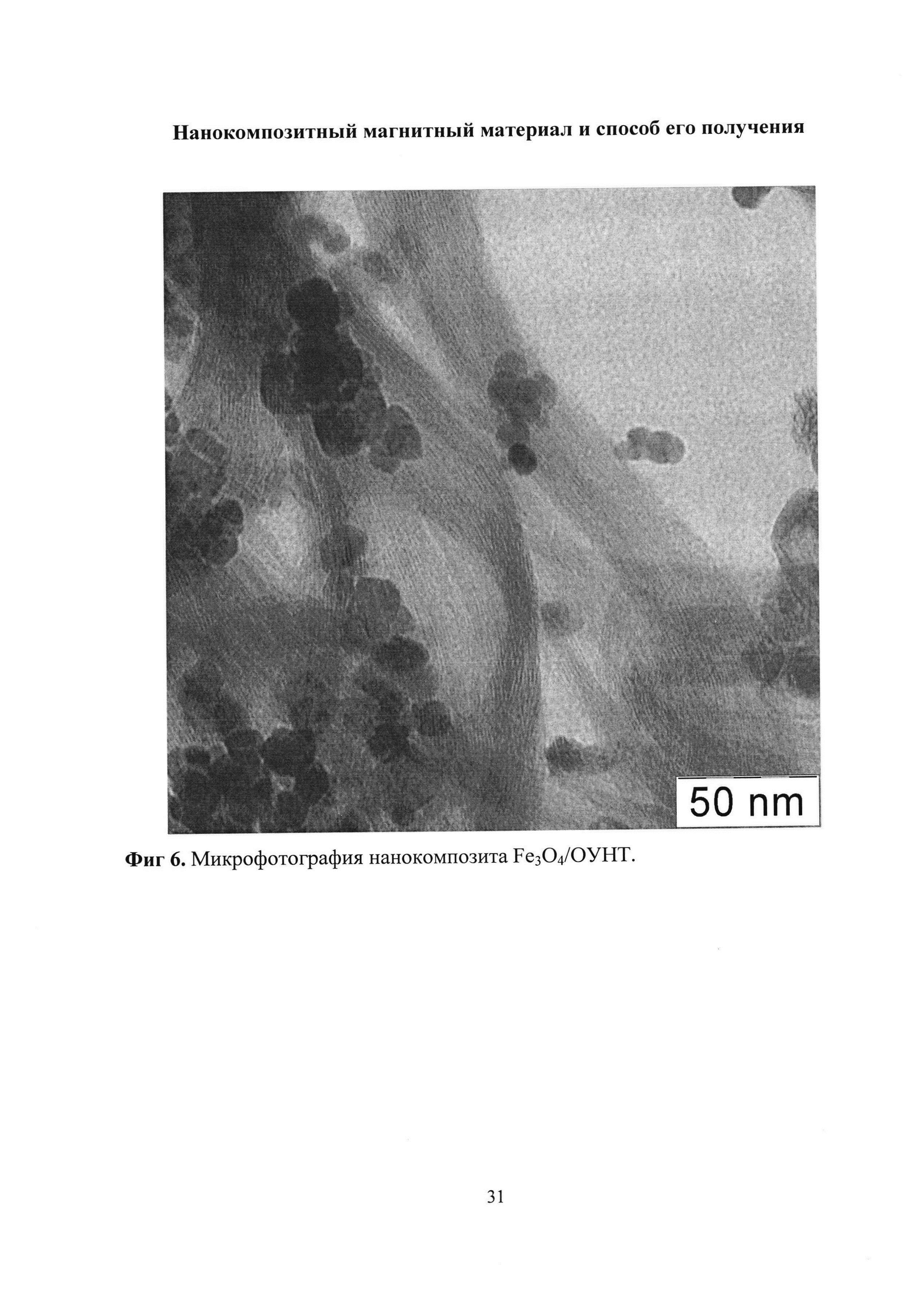 Изобретение относится к области нанокомпозитных материалов на основе электроактивных полимеров с системой сопряжения и магнитных наночастиц FeO, закрепленных на углеродных нанотрубках. Нанокомпозитный магнитный материал включает полимер - полидифениламин-2-карбоновую кислоту (ПДФАК) и одностенные углеродные нанотрубки (ОУНТ), на которых закреплены наночастицы FeOпри содержании в материале наночастиц FeO1-53 масс. % от массы ПДФАК и ОУНТ 1-3 масс. % от массы мономера. В способе получения нанокомпозитного магнитного материала in situ окислительной полимеризацией мономера на поверхности нанокомпозита FeO/ОУНТ в присутствии водного раствора окислителя, в качестве мономера используют дифениламин-2-карбоновую кислоту (ДФАК). Наночастицы FeOзакрепляют на поверхности ОУНТ путем гидролиза смеси солей железа (II) и (III) в мольном соотношении 1:2 в растворе гидроксида аммония в присутствии ОУНТ. Указанный мономер растворяют в смеси органического растворителя - хлороформа и NHOH, взятых в объемном соотношении 12:1, до концентрации мономера в растворе 0.05-0.2 моль/л и перед окислительной полимеризацией добавляют к раствору наночастицы FeO, закрепленные на поверхности ОУНТ. Нанокомпозитный материал по изобретению обладает одновременно электропроводящими и суперпарамагнитными свойствами, высокой однородностью и термостабильностью и намагниченностью насыщения, а также способностью образовывать стабильные магнитные жидкости, что позволяет эффективно использовать его в органической электронике и электрореологии, для создания датчиков и нанозондов, электрохимических источников тока, перезаряжаемых батарей, сенсоров и биосенсоров, суперконденсаторов, солнечных батарей и других электрохимических устройств. 2 н.п. ф-лы, 1 табл., 12 ил.