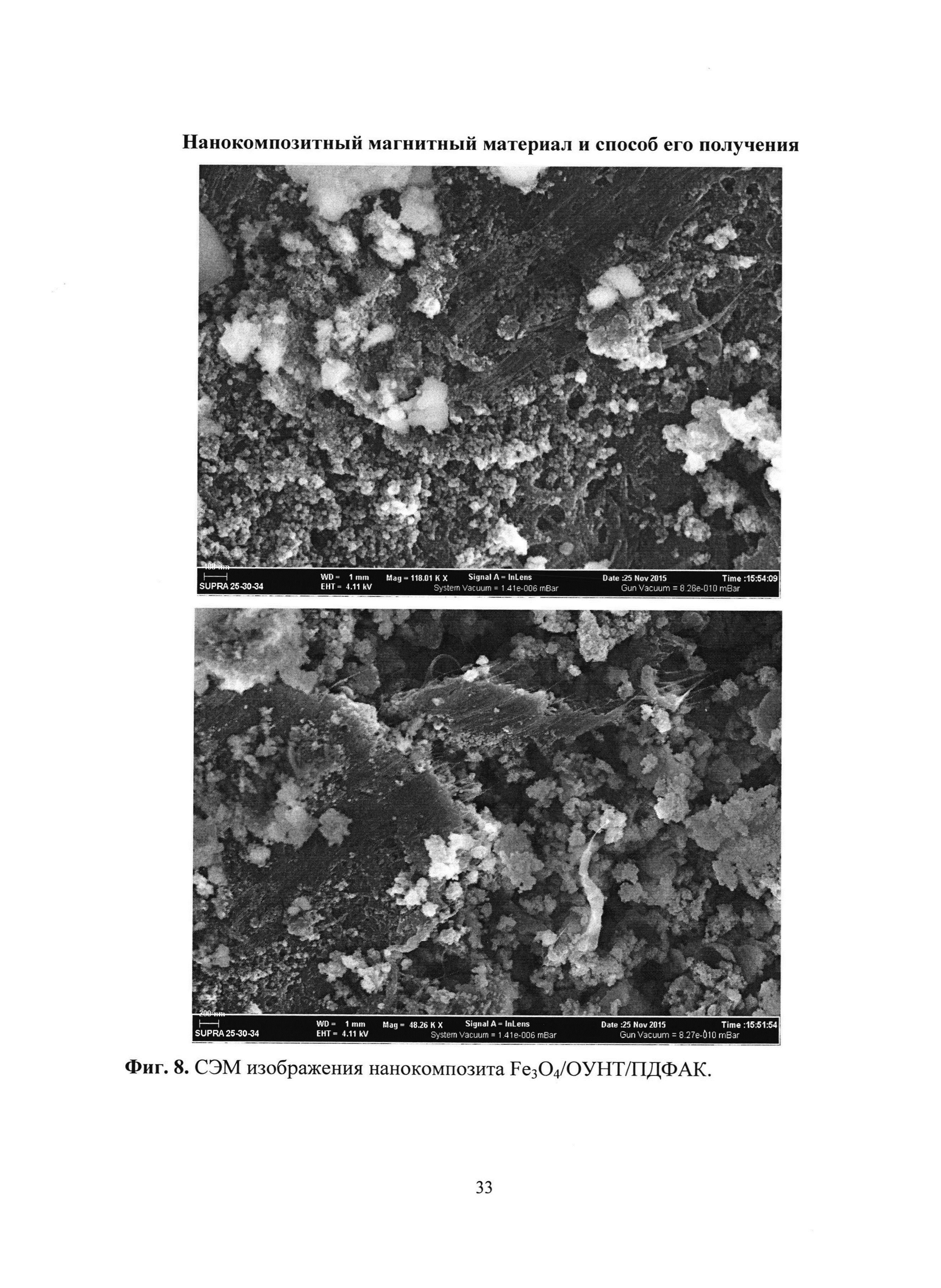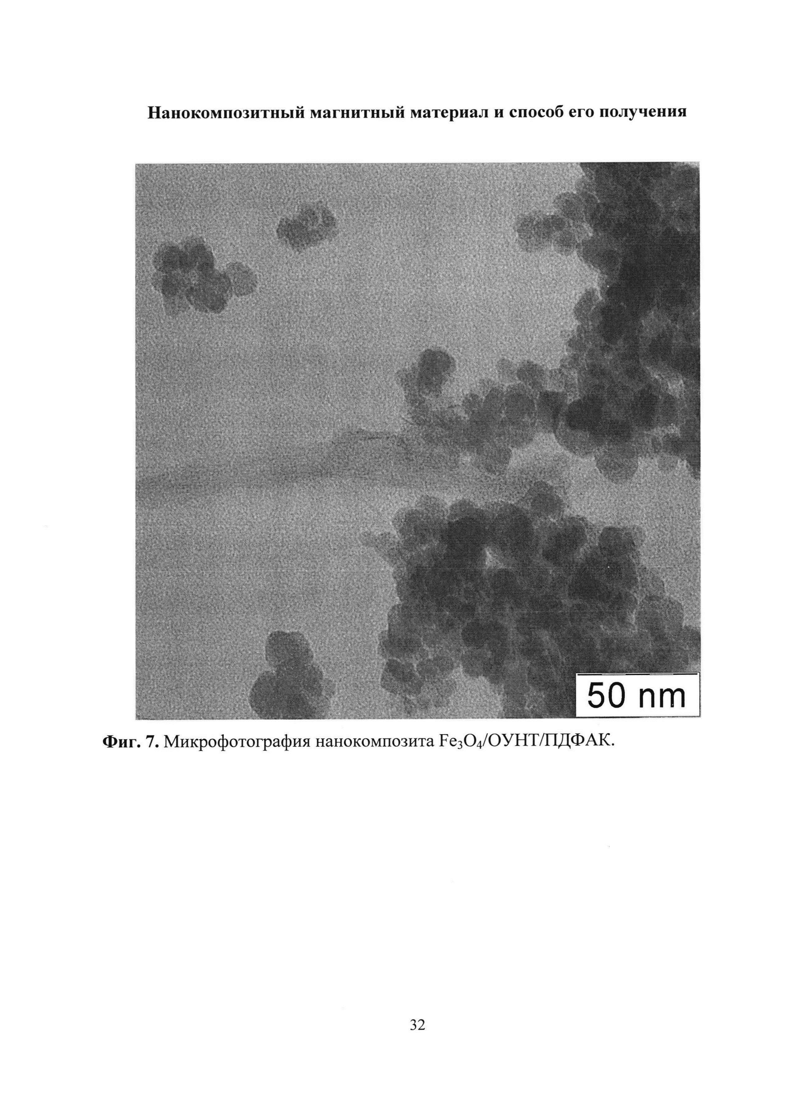 1. Нанокомпозитный магнитный материал, включающий полимер и наночастицы Fe3O4, отличающийся тем, что материал дополнительно содержит одностенные углеродные нанотрубки ОУНТ, на которых закреплены наночастицы Fe3O4, а в качестве полимера - полидифениламин-2-карбоновую кислоту ПДФАК при содержании в указанном материале наночастиц Fe3O4 1-53 масс. % от массы ПДФАК и ОУНТ 1-3 масс. % от массы мономера - дифениламин-2-карбоновой кислоты ДФАК. 2. Способ получения нанокомпозитного магнитного материала in situ окислительной полимеризацией мономера на поверхности нанокомпозита Fe3O4/ОУНТ в присутствии водного раствора окислителя, отличающийся тем, что для получения материала по п. 1 в качестве мономера используют дифениламин-2-карбоновую кислоту ДФАК, наночастицы Fe3O4 закрепляют на поверхности ОУНТ путем гидролиза смеси солей железа (II) и (III) в мольном соотношении 1:2 в растворе гидроксида аммония в присутствии ОУНТ, указанный мономер растворяют в смеси органического растворителя - хлороформа и NH4OH, взятых в объемном соотношении 12:1, до концентрации мономера в растворе 0.05-0.2 моль/л и перед окислительной полимеризацией добавляют к раствору наночастицы Fe3O4, закрепленные на поверхности ОУНТ.