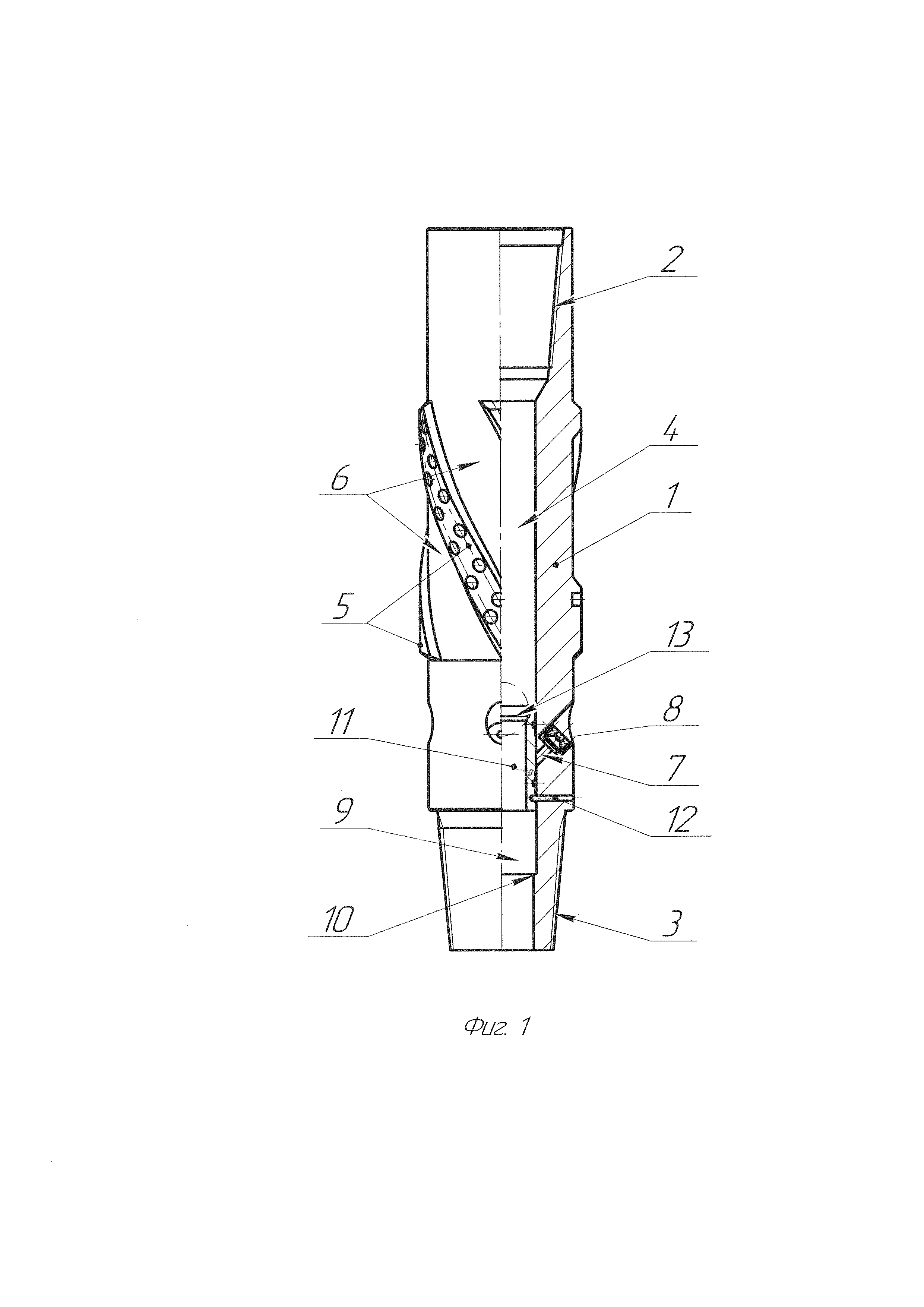 Изобретение относится к нефтегазодобывающей промышленности, а именно к опорно-центрирующим устройствам, используемым в компоновке низа бурильной колонны при наклонно направленном и/или горизонтальном бурении нефтяных и газовых скважин. Известен калибратор ствола скважины (патент RU №2377385, МПК Е21В 17/10, опубл. 27.12.2009 г. Бюл. №36), включающий верхнюю и нижнюю присоединительную резьбы, внутренний канал для подвода промывочной жидкости к забою, три или более лопастей с армированными рабочими поверхностями, разделенных между собой промывочными пазами, причем длина лопастей L (мм) связана с рабочим диаметром калибратора Dк (мм) следующим соотношением: L/Dк=(0,7÷0,95) Недостатками данного калибратора являются отсутствие промывки пазов и охлаждения лопастей при больших скоростях проходки, а также слабое вымывание шлама вдоль ствола скважины. Известно также устройство для очистки скважины от шлама (патент RU №109496, МПК Е21В 21/00, опубл. 20.10.2011 г. Бюл. №29), содержащее бурильную трубу и установленный на ней шнек, причем в качестве шнека использован однозаходовый шнек с четырьмя лопастями. При этом толщина шнека равна 30-35 мм, а высота лопасти составляет 50-60 мм, угол наклона каждой лопасти шнека к осевой линии бурильной колонны равен 55°, в лопастях шнека на каждом шаге витка установлены по две гидромониторные насадки диаметром 6 мм под углом 55° к осевой линии бурильной трубы влево по направлению шнека. Недостатками данного устройства являются сложность изготовления, связанная с большой длиной и стабильными параметрами по всей длине, большое количество гидромониторных отверстий и открытый центральный канал, что приводит к снижению напора прокачиваемой через них жидкости и слабой очистке от шлама стенок скважины. Наиболее близким по технической сущности и достигаемому результату является калибратор ствола скважины (патент RU №2531982, МПК Е21В 17/10, Е21В 10/26, опубл. 27.10.2014 г. Бюл. №30), включающий верхнюю и нижнюю присоединительные резьбы, внутренний канал для подвода промывочной жидкости к забою, лопасти с армированными рабочими поверхностями, разделенные между собой промывочными пазами, из внутреннего канала в этих пазах выполнены каналы для дополнительного нагнетания поднимающейся со стороны забоя промывочной жидкости под острым углом к оси с соплом-насадкой на конце или без таковой, при этом каналы для дополнительного нагнетания промывочной жидкости выполнены в два или более ярусов один над другим в одном или более промывочных пазах. Недостатком данного калибратора является то, что большое количество гидромониторных каналов и открытого центрального канала приводят к снижению напора прокачиваемой через них жидкости и слабой очистке от шлама стенок скважины. Технической задачей предлагаемого изобретения является создание конструкции калибратора ствола скважины, позволяющей качественно очищать стенки скважины от шлама за счет направления всего потока жидкости после бурения через гидромониторные каналы. Техническая задача решается калибратором ствола скважины, включающим корпус с верхней и нижней присоединительными резьбами и центральным каналом для подвода промывочной жидкости к забою, лопасти с армированными рабочими поверхностями, разделенные между собой промывочными пазами, гидромониторные каналы с соплом-насадкой на конце или 