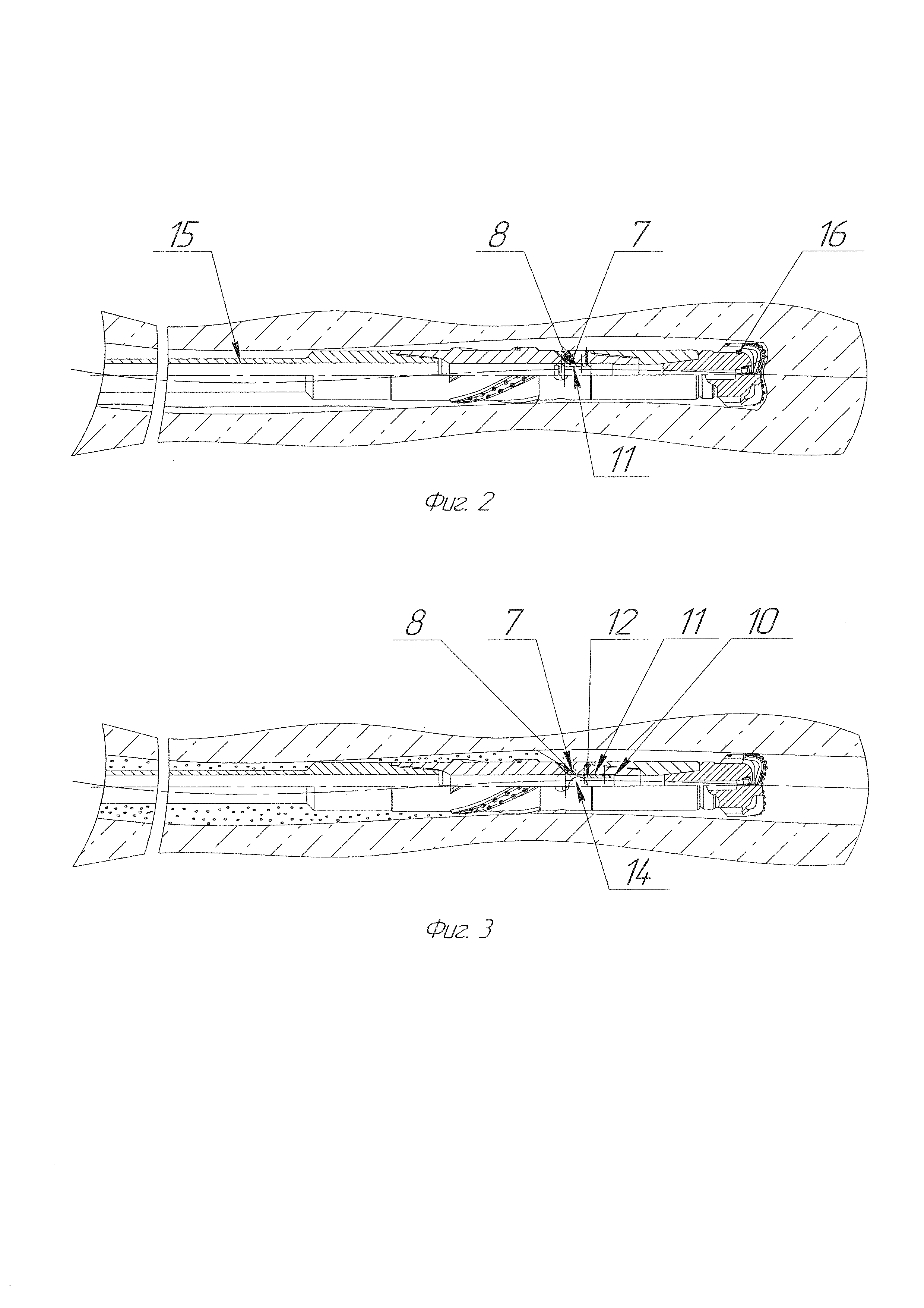 Калибратор ствола скважины, включающий корпус с верхней и нижней присоединительными резьбами и центральным каналом для подвода промывочной жидкости к забою, лопасти с армированными рабочими поверхностями, разделенные между собой промывочными пазами, гидромониторные каналы с соплом-насадкой на конце или без таковой, сообщенные с центральным каналом для нагнетания снизу вверх к стенкам скважины промывочной жидкости под острым углом к оси, отличающийся тем, что центральный канал сверху имеет цилиндрическое расширение с переходным торцом снизу, гидромониторные каналы выполнены в один ряд равномерно по периметру ниже лопастей и герметично перекрыты в транспортном положении изнутри полой втулкой, расположенной внутри цилиндрического расширения и зафиксированной в транспортном положении срезными элементами, при этом полая втулка снабжена сверху седлом под бросовый шарик и выполнена с возможностью после взаимодействия седла с шариком разрушения срезных элементов и перемещения вниз до переходного торца с открытием гидромониторных каналов в рабочем положении.