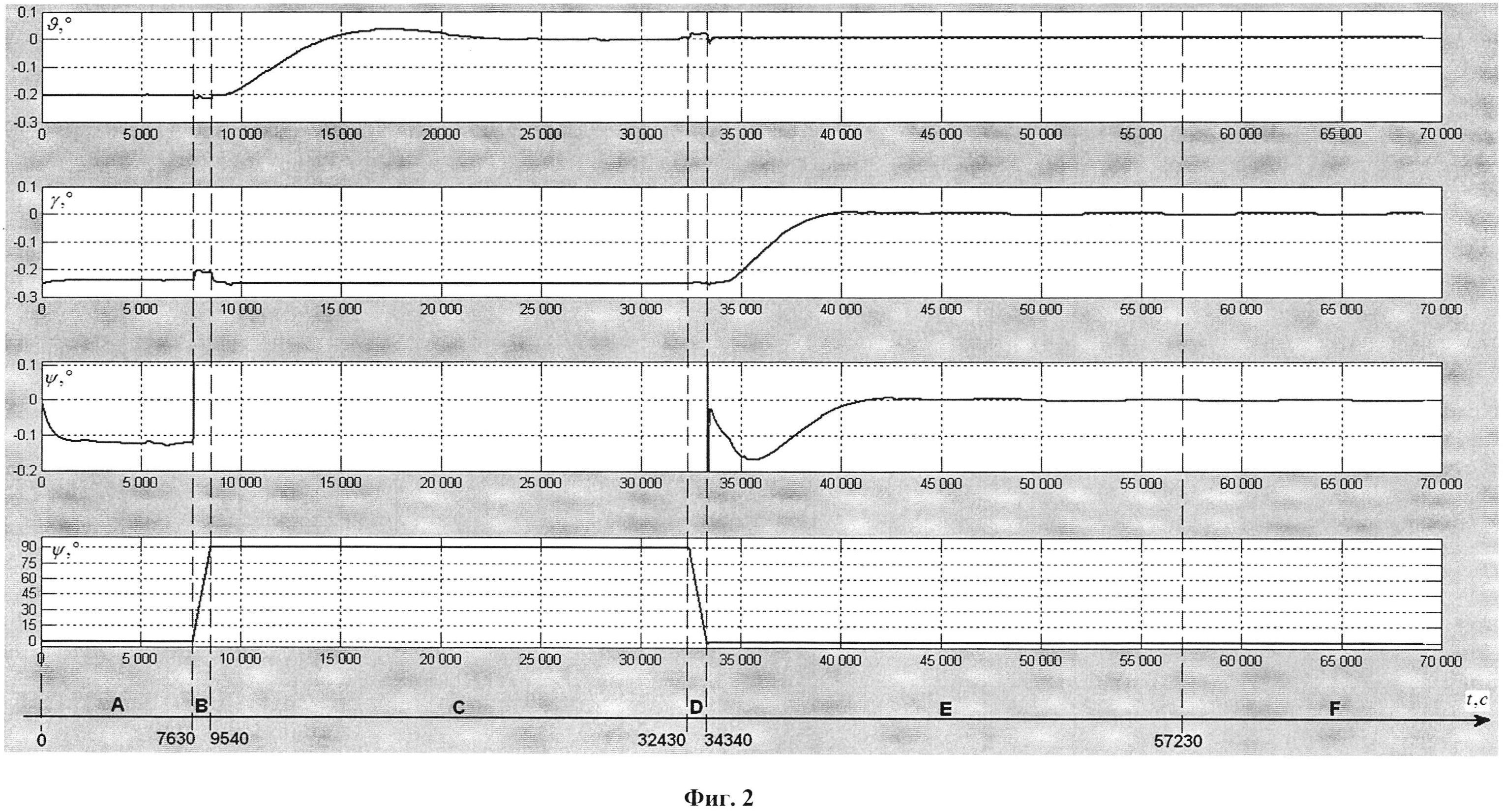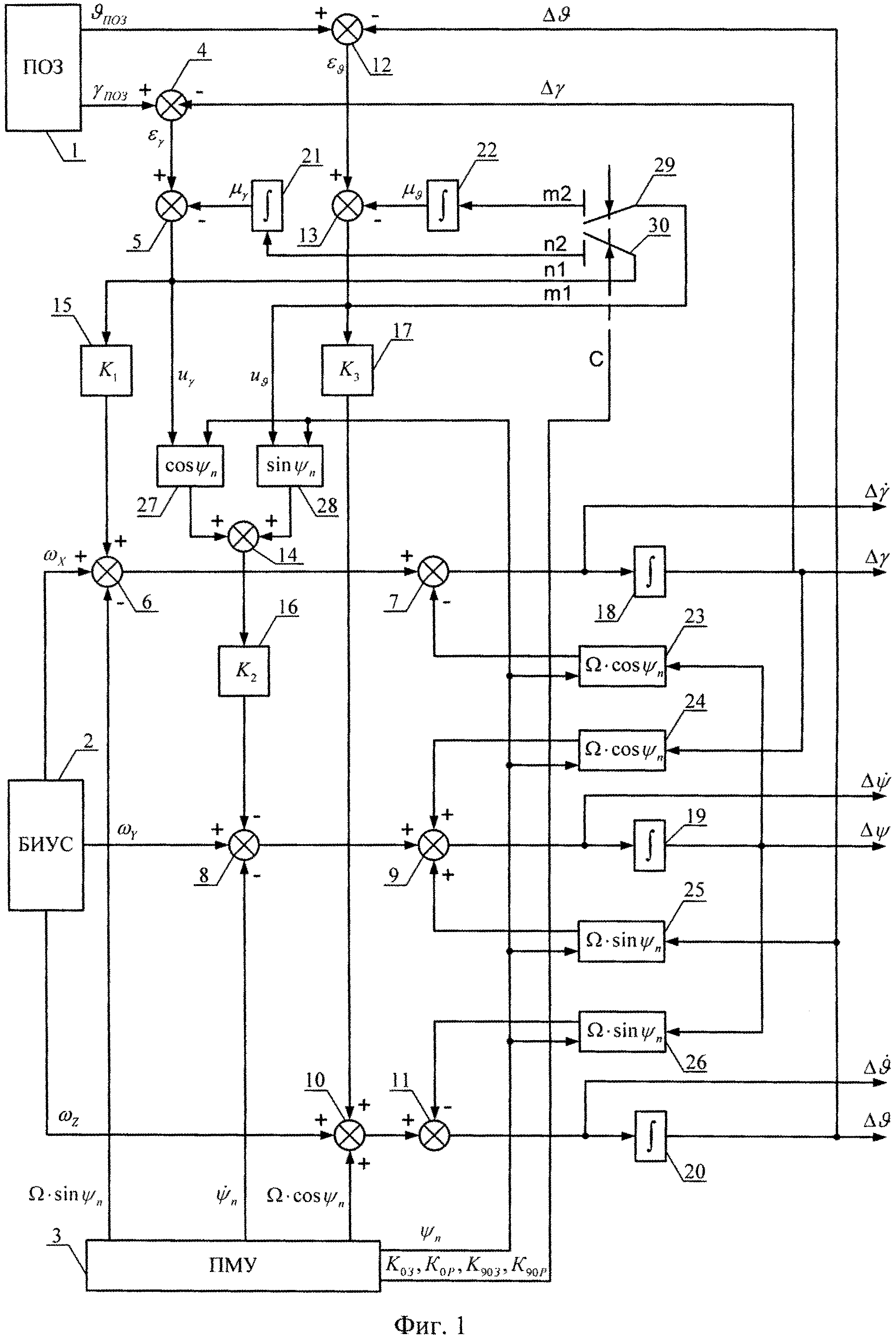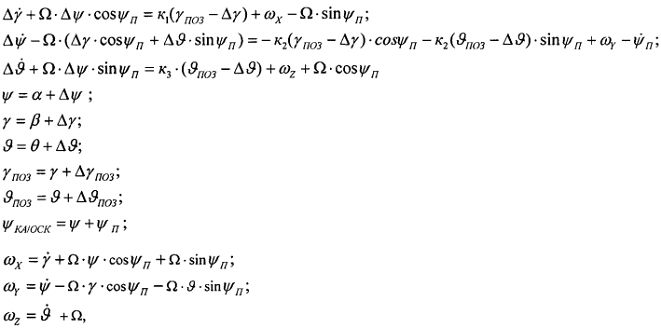 1. Способ ориентации космического аппарата (КА) с использованием бесплатформенного орбитального гирокомпаса (БОГК), заключающийся в том, что в установившемся режиме ориентации измеряют разности сигналов прибора ориентации по Земле (ПОЗ) и выходных сигналов БОГК в каналах крена εγ и тангажа εϑ соответственно, которыми корректируют показания блока гироскопических измерителей угловых скоростей (БИУС) в каналах крена и курса - сигналом коррекции εγ, а в канале тангажа - сигналом εϑ, отличающийся тем, что поворачивают КА по курсу на девяносто градусов с замещением канала гирокомпасирования крена на канал гирокомпасирования тангажа, а канал гирокомпасирования тангажа - на канал гирокомпасирования крена, продолжают ориентированный орбитальный полет в повернутом по курсу на девяносто градусов положении КА, вводят в сигнал коррекции в канале тангажа сигнал автокомпенсации ошибок ПОЗ по тангажу µϑ, при этом новый сигнал коррекции БОГК в канале тангажа uϑ вычисляют по формуле 2. Система ориентации КА с использованием БОГК для реализации способа по п. 1, содержащая в канале крена последовательно соединенные ПОЗ, первый сумматор, первый модуль усиления (МУ), второй сумматор, третий сумматор, первый интегратор, выход которого является входом в систему стабилизации КА по крену, содержащая в канале тангажа последовательно соединенные ПОЗ, четвертый сумматор, второй МУ, пятый и шестой сумматоры и второй интегратор, выход которого является входом в систему стабилизации КА по тангажу, содержащая в канале курса косинусный (КП) и синусный (СП) преобразователи и последовательно соединенные седьмой сумматор, третий МУ, восьмой и девятый сумматоры, третий интегратор, выход которого является входом в систему стабилизации КА по курсу, при этом входы КП и СП подключены к выходам первого и четвертого сумматоров соответственно, а выходы - соответственно к первому и второму входам седьмого сумматора, содержащая также блок измерителей угловых скоростей (БИУС), программный модуль управления (ПМУ), а также первый, второй, третий и четвертый модули компенсации взаимовлияний каналов (МКВК) ориентации БОГК, при этом вторые входы второго, восьмого и пятого сумматоров подключены соответственно к выходам БИУС по каналам крена, курса и тангажа, выход первого интегратора подключен к первому входу первого МКВК, выход которого соединен со вторым входом девятого сумматора, выход второго интегратора подключен к первому входу второго МКВК, выход которого соединен с третьим входом девятого сумматора, выход третьего интегратора подключен одновременно к первым входам третьего и четвертого МКВК, выходы которых соединены со вторыми входами соответственно третьего и шестого сумматоров, при этом первый, второй и третий выходы ПМУ подключены соответственно к третьим входам второго, восьмого и пятого сумматоров, а четвертый - ко вторым входам КП, СП, первого, второго, третьего и четвертого МКВК, отличающаяся тем, что в нее введены первый и второй ключи, четвертый и пятый интеграторы и в цепи первого и четвертого сумматоров введены десятый и одиннадцатый сумматоры соответственно, при этом выход десятого сумматора подключен одновременно к входу первого МУ, первому входу КС и первому ключу, выход одиннадцатого сумматора подключен одновременно к входу третьего МУ, пер