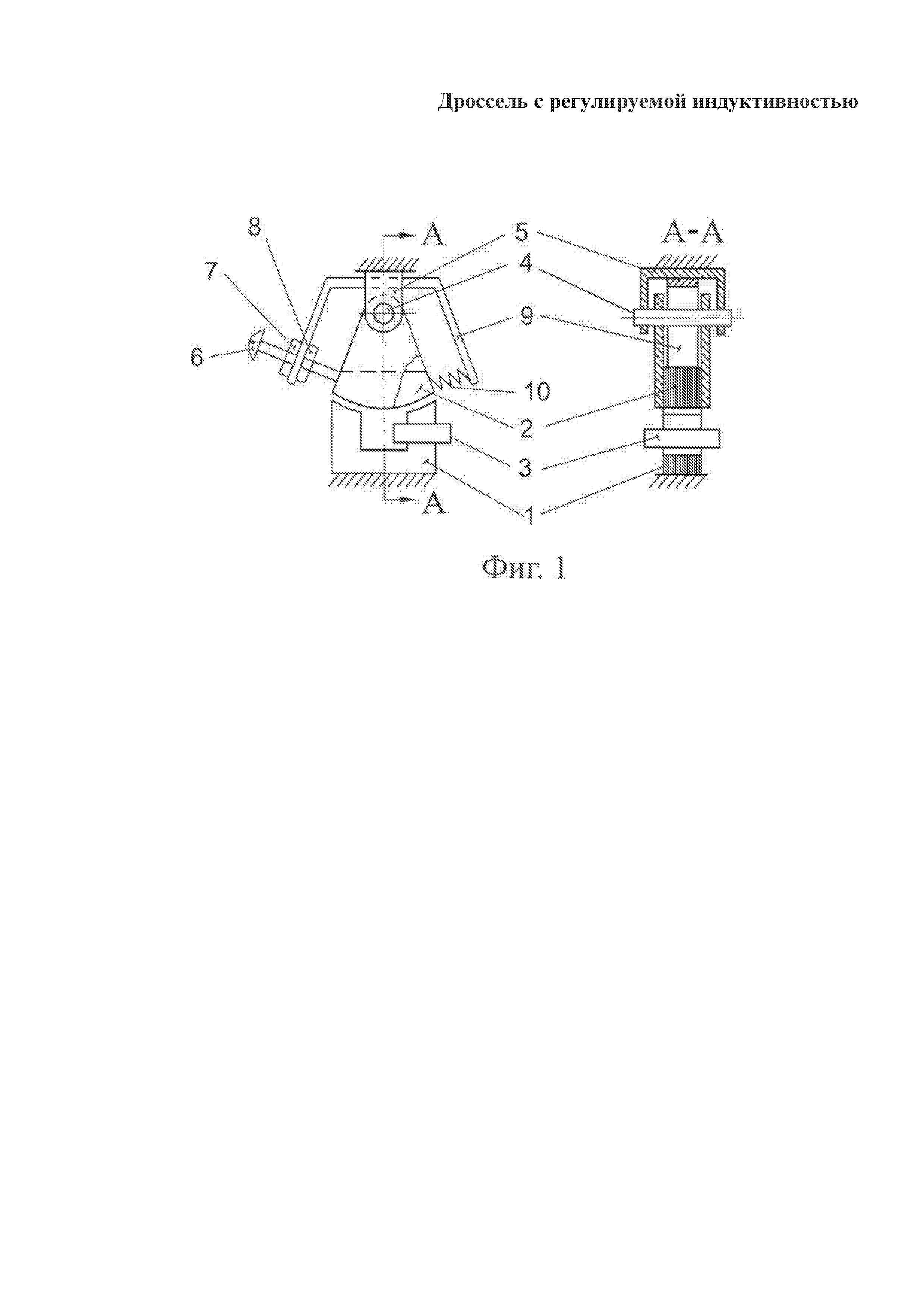 1. Дроссель с регулируемой индуктивностью, содержащий обмотку возбуждения, магнитопровод, состоящий из подвижной и неподвижной частей с немагнитным зазором между ними, при этом на неподвижной части магнитопровода закреплена обмотка возбуждения, а подвижная часть магнитопровода размещена на оси, установленной в неподвижных опорах, отличающийся тем, что зазор между торцами подвижной и неподвижной частей магнитопровода выполнен постоянной ширины и имеет форму дуги окружности, центр которой совпадает с центром вышеупомянутой оси, а дроссель дополнительно снабжён скобой, которая своей центральной частью скреплена с вышеупомянутой неподвижной опорой, при этом на обоих концах скобы размещены устройства регулирования и фиксации, одно из которых содержит винт, закреплённый в скобе посредством двух гаек с обеих сторон скобы, причём свободный конец винта прижат к боковой поверхности подвижной части магнитопровода с одной стороны. 2. Дроссель по п. 1, отличающийся тем, что оба устройства регулирования и фиксации выполнены содержащими винт, закреплённый в скобе посредством двух гаек с обеих сторон скобы, при этом свободные концы упомянутых винтов прижаты к боковым поверхностям подвижной части магнитопровода. 3. Дроссель по п. 1, отличающийся тем, что другое устройство регулирования и фиксации выполнено в виде пружины, один конец которой неподвижно закреплён на скобе, а другой конец прижат к боковой поверхности подвижной части магнитопровода с другой стороны.