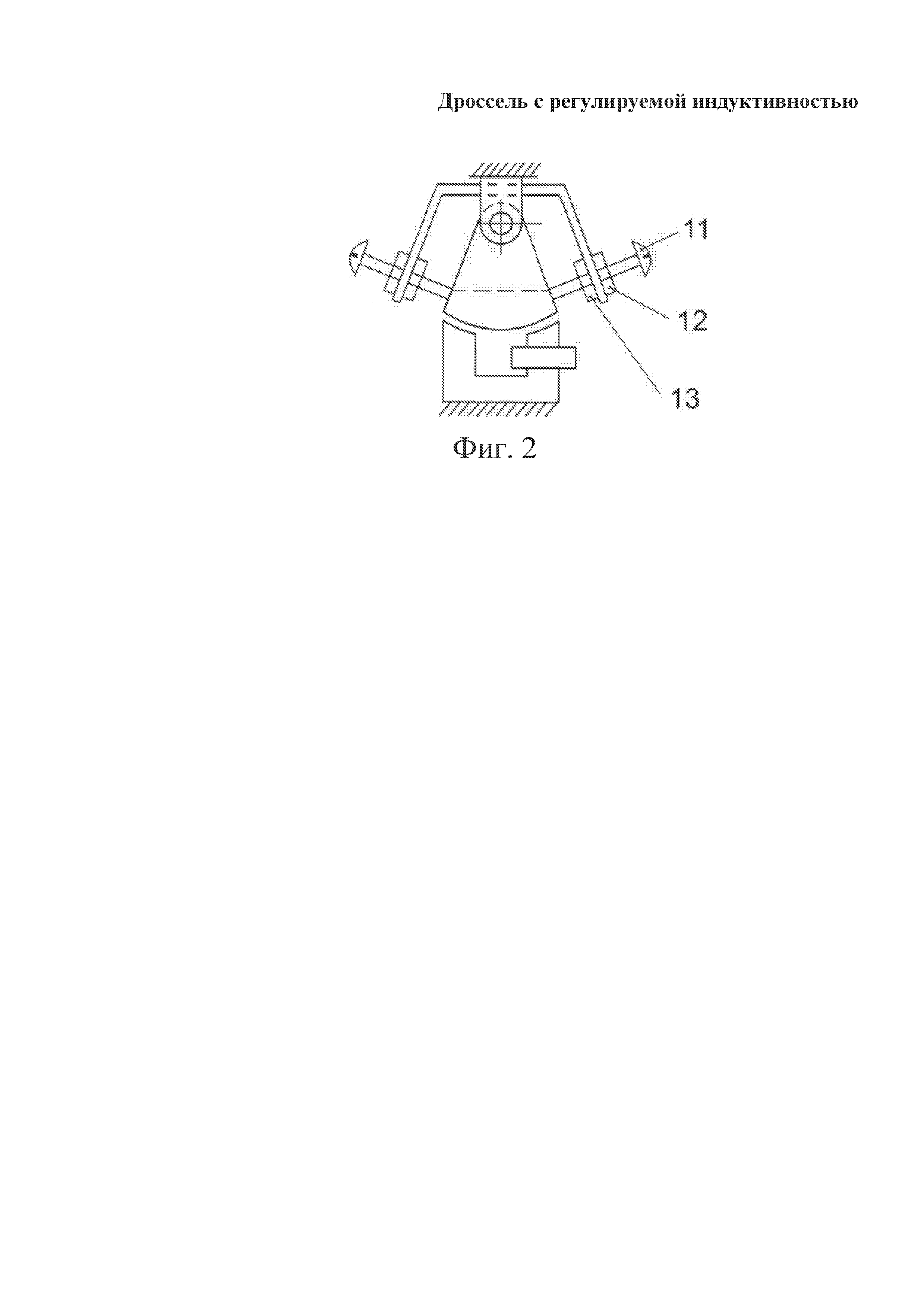 Изобретение относится к регулировочным трансформаторам или переменным индуктивностям, имеющим подвижный участок в магнитной цепи, в частности к дросселям с регулируемой индуктивностью. Известен дроссель с регулируемой индуктивностью (см. описание изобретения к патенту РФ № 2087964, МПК Н01F21/06, авторы Смирнов Ю.А., Шевченко А.Г., опубл. 20.08.97), содержащий разъёмный магнитопровод с воздушным зазором, обмотку на стержнях магнитопровода, фиксирующее устройство в виде обойм, жёстко скреплённых с частями магнитопровода, и регулировочное устройство в виде четырёх шпилек с гайками. Однако в известном устройстве процесс регулирования индуктивности является трудоёмким и длительным по времени, поскольку регулирование индуктивности проводится за счёт изменения взаимного положения частей магнитопровода, для чего необходимо поочерёдно вращать четыре шпильки с фиксирующими гайками, чтобы добиться параллельности поверхностей, образующих зазор для выравнивания значений усталостных напряжений, возникающих в шпильках в условиях эксплуатации данного дросселя при знакопеременных механических воздействиях. Кроме того, в известном дросселе подвижная и неподвижная части магнитопровода имеют гальваническую связь через устройство регулирования и фиксации, что существенно усложняет электрическую изоляцию обмотки возбуждения и снижает надёжность дросселя. Наиболее близким по назначению и технической сущности решением, выбранным в качестве прототипа, является плавно регулируемый дугогасящий реактор (см. описание изобретения к патенту РФ № 2390065, МПК Н01F29/10 автор Зихерман М.Х., опубл. 20.05.2010), содержащий обмотку на неподвижном магнитопроводе, выполненном из двух П-образных частей с немагнитным зазором, в котором может перемещаться подвижный магнитопровод в виде ферромагнитного кольца переменного поперечного сечения. При повороте кольца вокруг своей оси изменяется объём заполнения зазора ферромагнитным материалом кольца, что изменяет индуктивность реактора. Недостатком данного изобретения является невозможность получения одинаковыми по значению двух магнитных потоков, создаваемых обеими частями неподвижного магнитопровода. В результате этого результирующее усилие, создаваемое за счёт разности усилий от магнитных потоков, не равно нулю, что приводит к перекосу подвижного магнитопровода в зазоре и делает конструкцию дросселя статически неустойчивой, что, в свою очередь, приводит к изменению значения индуктивности реактора в процессе эксплуатации. Целью изобретения является обеспечение постоянного значения индуктивности в процессе её эксплуатации и упрощение процесса регулирования значения индуктивности дросселя и фиксации положения подвижной части магнитопровода. Поставленная цель достигается тем, что дроссель с регулируемой индуктивностью, содержит обмотку возбуждения, магнитопровод, состоящий из подвижной и неподвижной частей с немагнитным зазором между ними, при этом на неподвижной части магнитопровода закреплена обмотка возбуждения, а подвижная часть магнитопровода размещена на оси, установленной в неподвижных опорах, при этом зазор между торцами подвижной и неподвижной частей магнитопровода выполнен постоянной ширины и имеет форму дуги окружности, центр которой совпадает с центром вышеупомянутой оси, а д