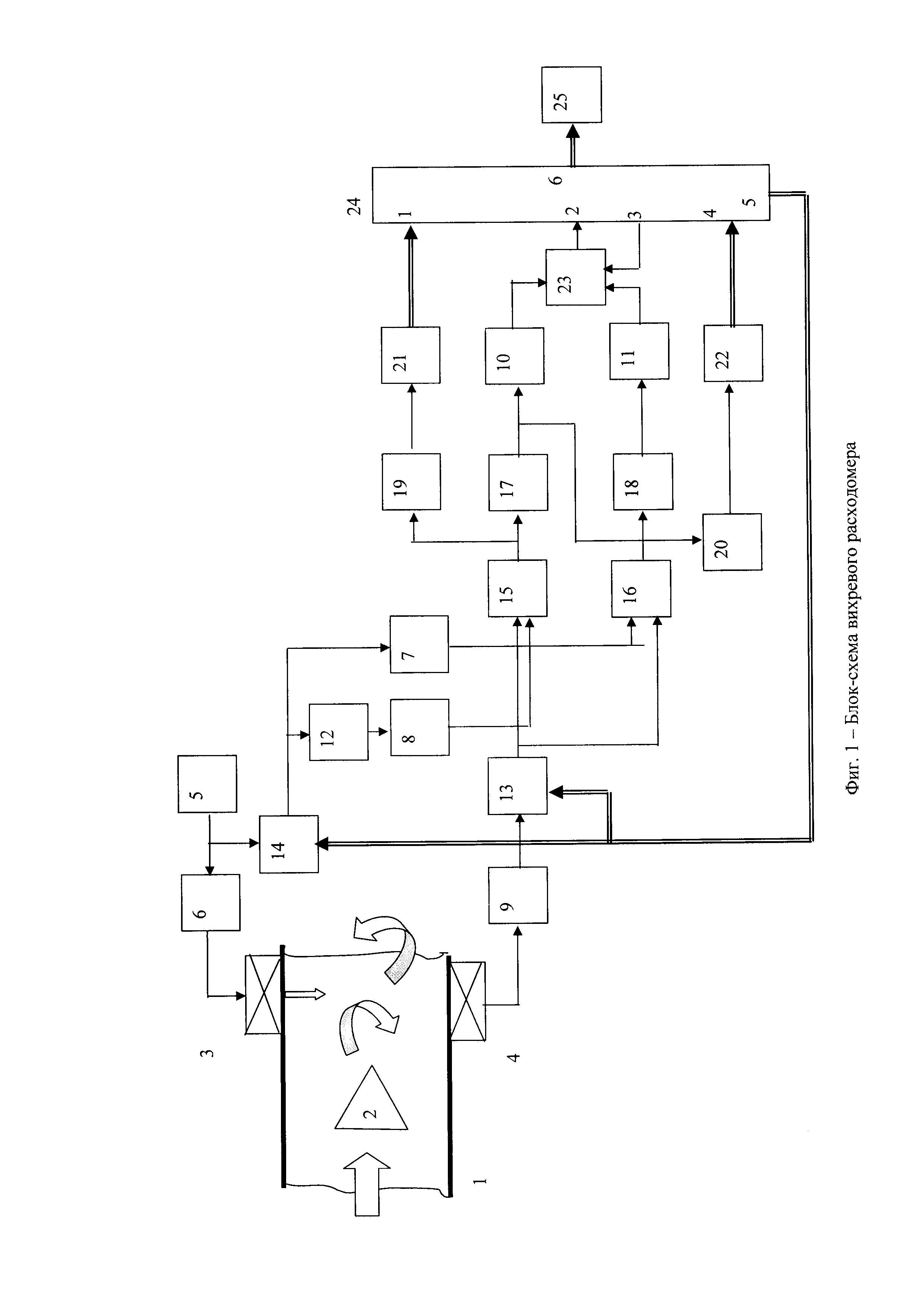Вихреакустический расходомер, содержащий измерительный патрубок, расположенное в патрубке поперек потока тело обтекания, излучатель и приемник ультразвуковых колебаний, установленные диаметрально противоположно за телом обтекания, генератор сигнала ультразвуковой частоты, первый и второй делители частоты на два, первый и второй усилитель-формирователь, инвертор, первый фазовый детектор, первый фильтр верхних частот, фильтр нижних частот, первый аналого-цифровой преобразователь, мультиплексор с двумя входами, микроконтроллер, выходное устройство, отличающийся тем, что в него дополнительно введены первый и второй делители частоты с переменным коэффициентом деления, третий делитель частоты на два, третий усилитель-формирователь, второй фазовый детектор, второй фильтр верхних частот, пиковый детектор, второй аналого-цифровой преобразователь, вход первого делителя частоты с переменным коэффициентом деления подключен к выходу первого усилителя-формирователя, а выход - к первым входам первого и второго фазового детектора, вход второго делителя частоты с переменным коэффициентом деления подключен к выходу задающего генератора, а выход - к входу инвертора и к входу второго делителя частоты на два, управляющие входы делителей частоты с переменным коэффициентом деления подключены к одному и тому же выходу микроконтроллера, выход инвертора подключен к входу третьего делителя частоты на два, выходы второго и третьего делителей частоты на два подключены ко вторым входам первого и второго фазового детектора, выход второго фазового детектора подключен через фильтр верхних частот к третьему усилителю-формирователю, выходы второго и третьего усилителей-формирователей подключены к информационным входам мультиплексора, управляющий вход и выход мультиплексора подключены к микроконтроллеру, вход пикового детектора подключен к выходу первого фильтра верхних частот, а выход пикового детектора через второй аналого-цифровой преобразователь подключен к микроконтроллеру, при этом делители частоты с переменным коэффициентом деления имеют одинаковые коэффициенты деления.