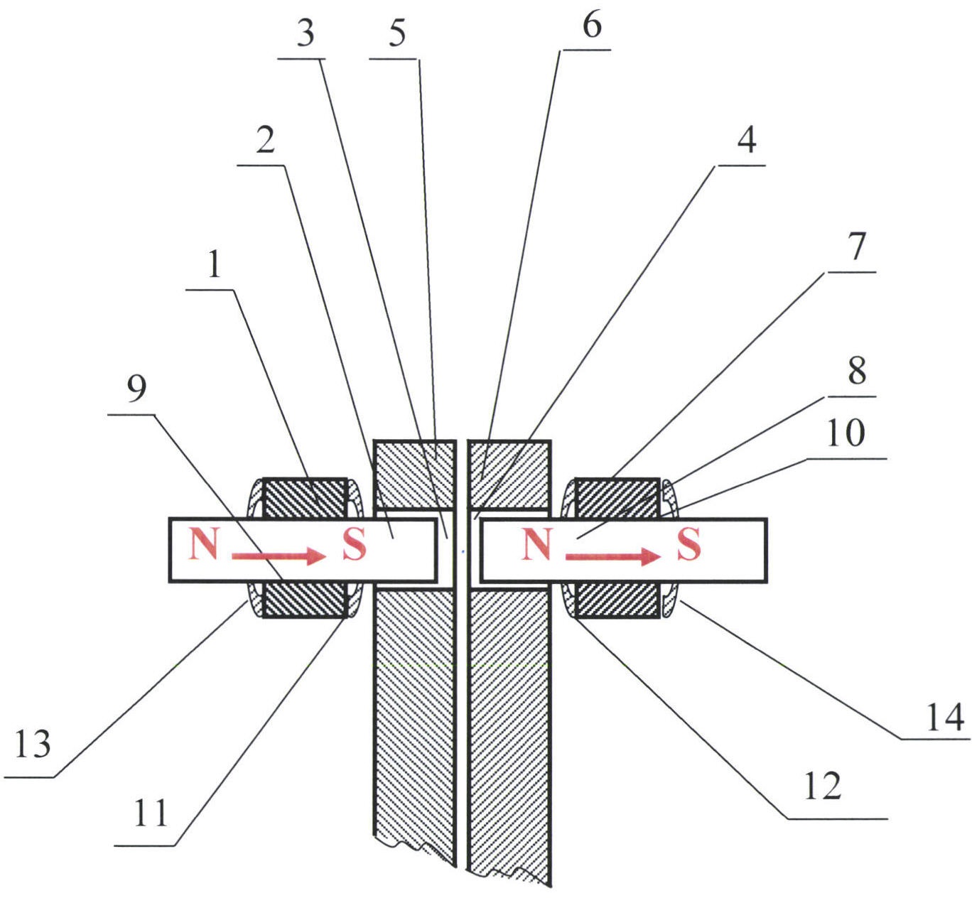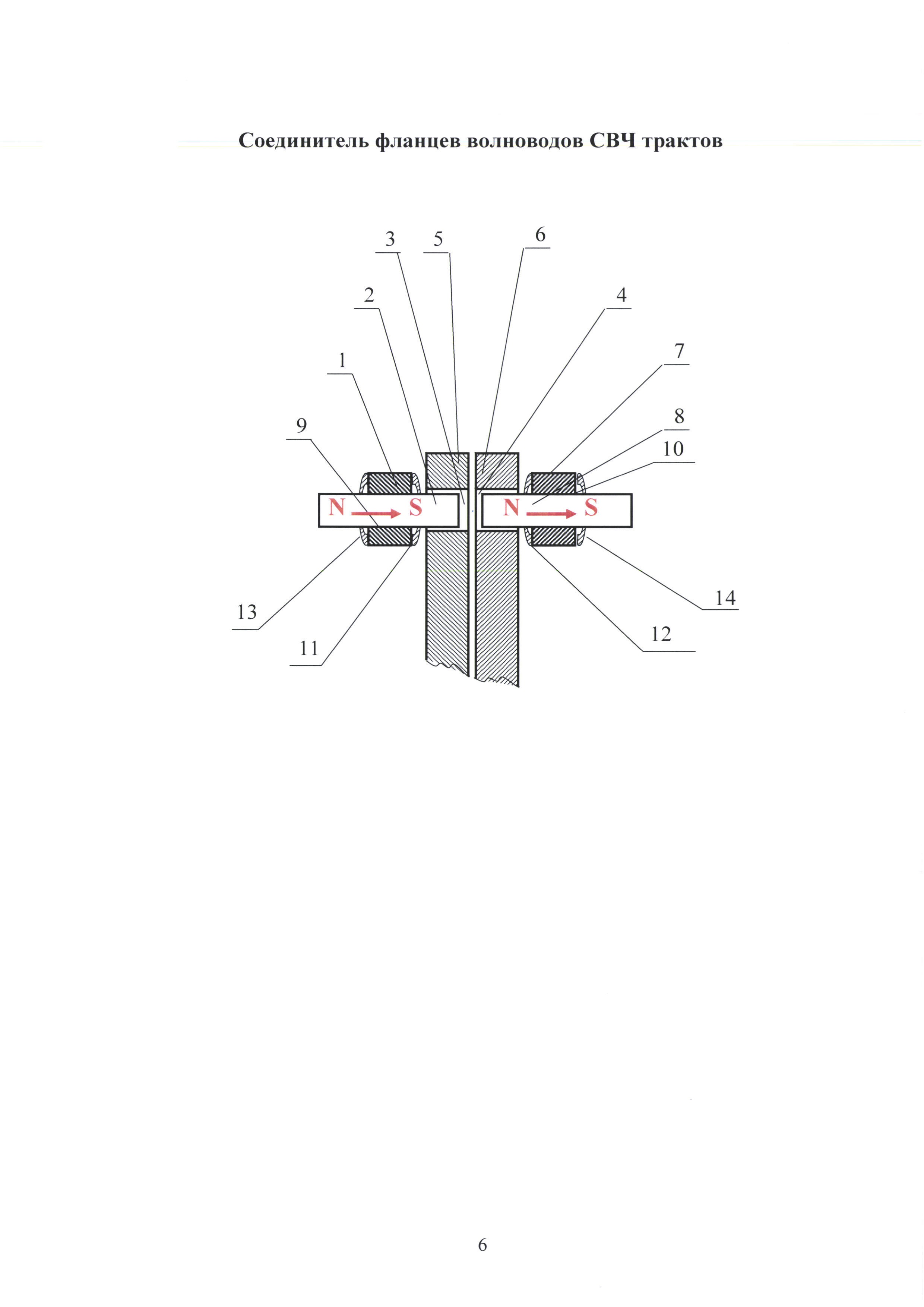 Изобретение относится к области СВЧ техники, точнее к техническим решениям соединителей разъемных фланцев волноводов СВЧ трактов. Известен соединитель разъемных фланцев волноводов СВЧ трактов, выполненный в виде струбцины, стягивающей состыкованные фланцы (Анализатор цепей 8 мм длин волн Р2-65. Инструкция по эксплуатации. Интернет ресурс www.etk-elcom.ru). Недостаток такого соединителя фланцев волноводов СВЧ трактов в длительности осуществления процесса крепления, неудобном в случае многократного действий разъединения и соединения фланцев, необходимых в технологических целях. Наиболее близким по технической сущности к изобретению является соединитель фланцев, выполненный в виде винта, образованного шляпкой и цилиндрической частью меньшего диаметра, размещенной в соосных отверстиях состыкованных фланцев, и гайка, стягивающая их (Элементы соединения СВЧ трактов радиоизмерительных приборов. Присоединительные размеры. ГОСТ 13317-89). Недостаток такого соединителя волноводов СВЧ трактов в длительности осуществления процесса крепления, неудобном в случае многократного действия разъединения и соединения фланцев, необходимых в технологических целях. Технической задачей изобретения заключается в упрощение процесса крепления фланцев при многократном их соединении и разъединении, необходимом в технологических целях. Технический результат изобретения является ускорение процесса крепления фланцев волноводных труб. Это достигается тем, что известный соединитель фланцев волноводов СВЧ трактов, содержащий шляпку и цилиндрическую часть меньшего диаметра, размещенную в соосных отверстиях сочлененных волноводных фланцев, снабжен четырьмя пружинами, второй составляющей из шляпки и цилиндрической части меньшего диаметра, причем цилиндрическая часть и вторая составляющая цилиндрической части соединителя выполнены из магнитотвердого материала с остаточной намагниченностью, шляпка соединителя и шляпка второй составляющей соединителя выполнены в виде дисков из немагнитного материала с отверстиями, диски установлены в серединах цилиндрической части и второй составляющей цилиндрической части, пружины установлены на торцевых плоскостях каждой шляпки и их усилия, действующие в направлении оси цилиндрической части направлены от плоскостей шляпки и второй составляющей шляпки, максимальное усилие сжатия каждой пружины на 10%…20% меньше максимальной силы притяжения двух цилиндрических частей при соединении их торцов, а суммарная длина каждой цилиндрической части, выступающей над торцевой поверхностью диска шляпки, и минимальной толщины сжатой пружины не более чем на 25 мкм меньше толщины фланца. Сущность технического решения поясняется чертежом, на котором показано поперечное сечение части фланцев волноводов СВЧ тракта с соединителем. Соединитель содержит шляпку 1 в виде диска и цилиндрическую часть 2 меньшего диаметра, размещенную в соосных отверстиях 3 и 4 сочлененных волноводных фланцев 5 и 6, вторую составляющую из шляпки 7 в виде диска и цилиндрической части 8 меньшего диаметра, отверстия 9 в диске 1 и отверстие 10 в диске 7, в которых закреплены центры цилиндрической части 2 и второй цилиндрической части 8 соединителя и его второй части. На торцевых поверхностях шляпок 1 и 7 установлены пружины 11, 12, 13 и 14, действующие в напр